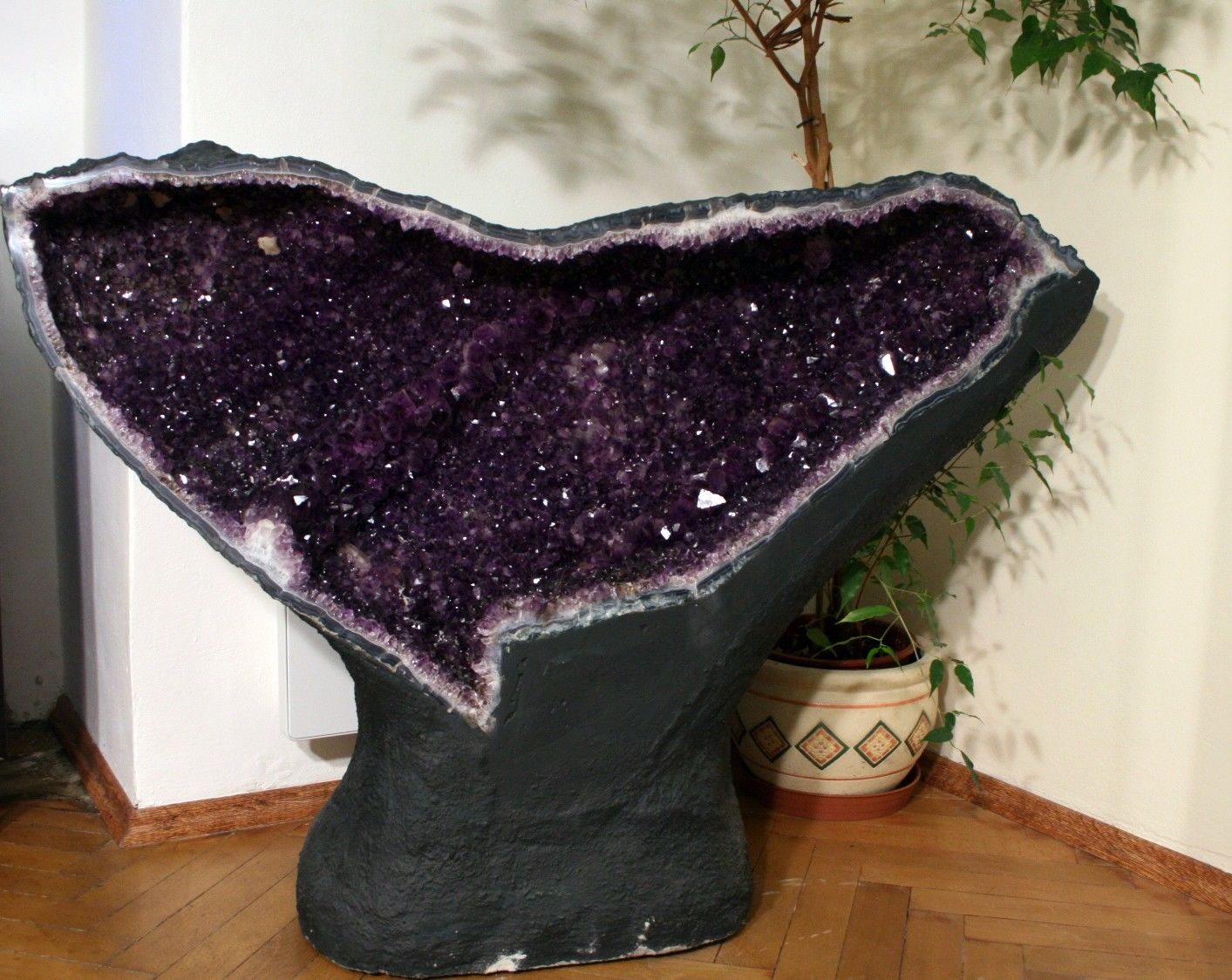 Die Geode, die durch die Verwachsung von zwei separaten Geoden entstanden ist, ist mit durchsichtigen Kristallen von frischer violetter Farbe Amethyst gefüllt.