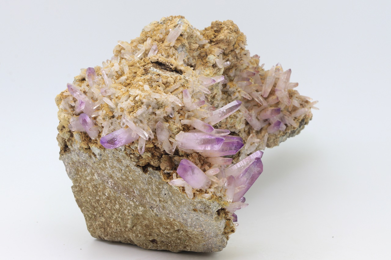 Druse besetzt mit Kristallen, die transparent sind mit intensiver lila Spitze. Die größten Kristalle sind 2 cm groß.