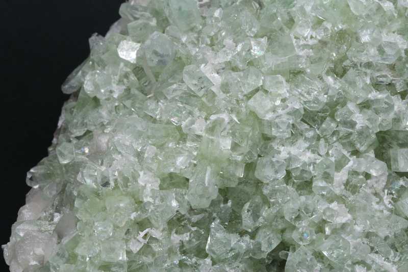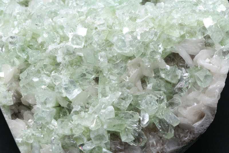 Sehr ästhetische größere Probe von Apophyllit mit Stilbit aus Indien. Große Druse von grünen Apophyllit-Kristallen von bis zu 15 mm auf kleineren Stilbit-Kristallen.