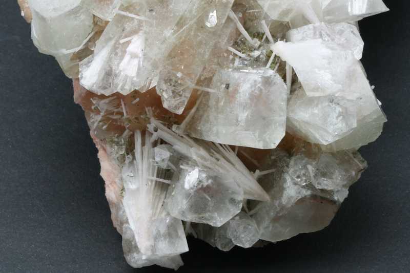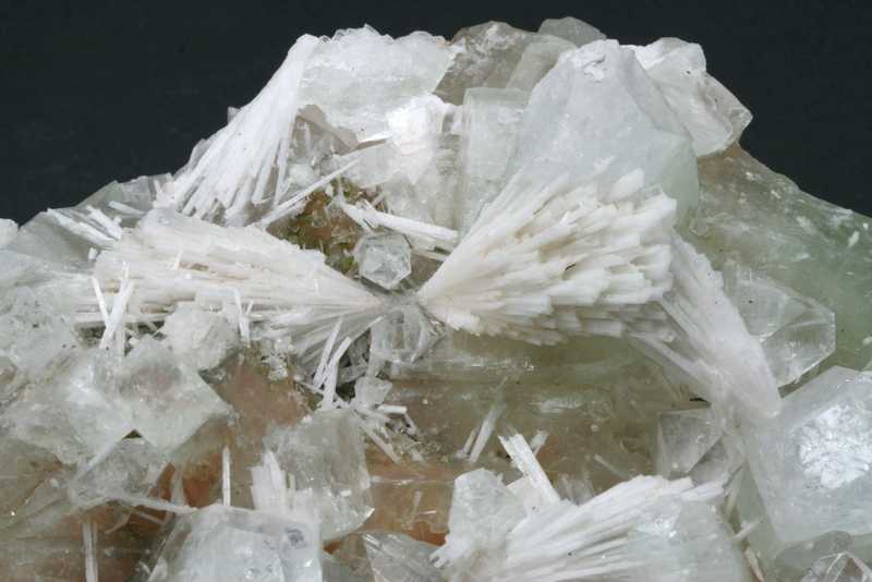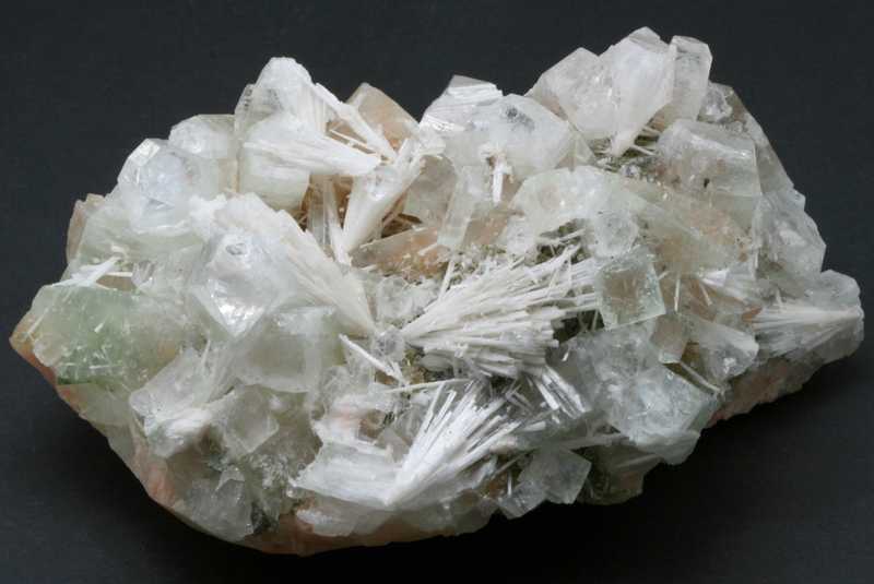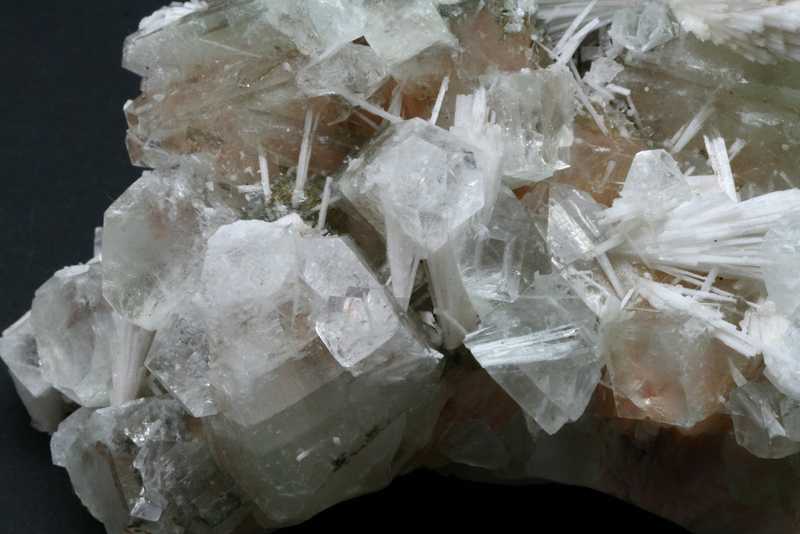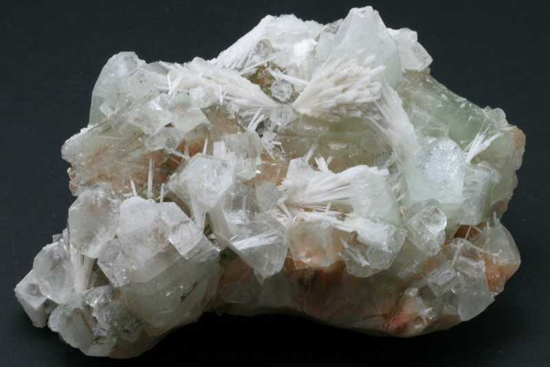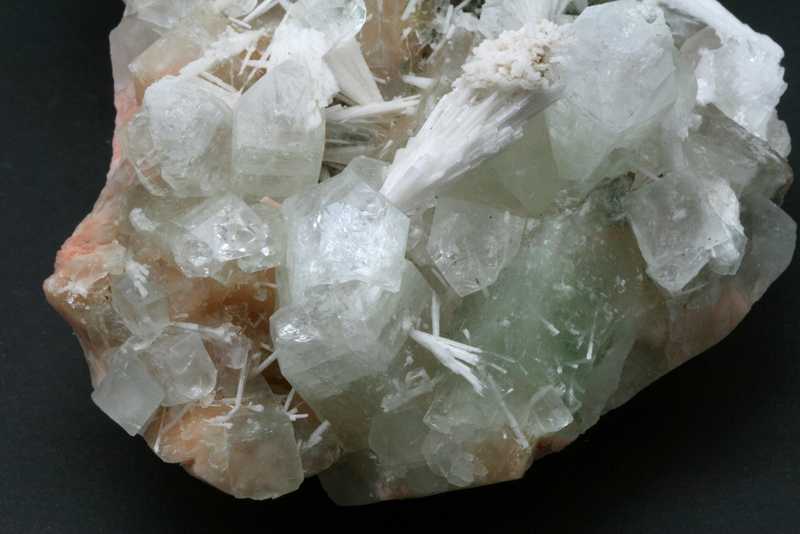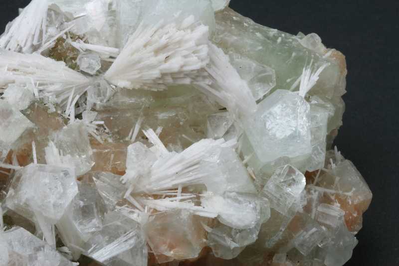 Sehr ästhetisches größeres Exemplar von Apophyllit mit Stilbit aus Indien. Eine große Druse von grünlichem Apophyllit-Kristallen mit einer Größe von bis zu 40 mm, durch die nadelförmige Kristalle von Skolecit mit einer Größe von bis zu 40 mm wachsen, auf den Kristallen von Stilbit.
