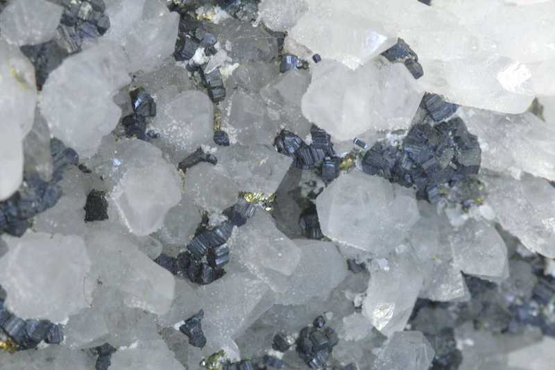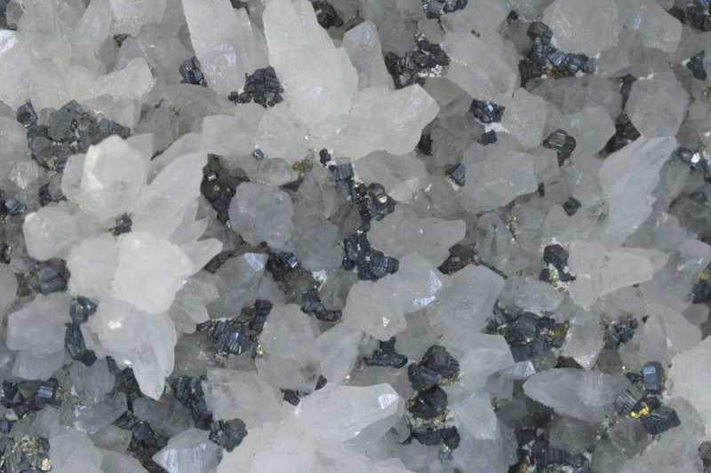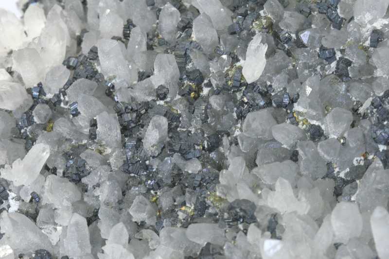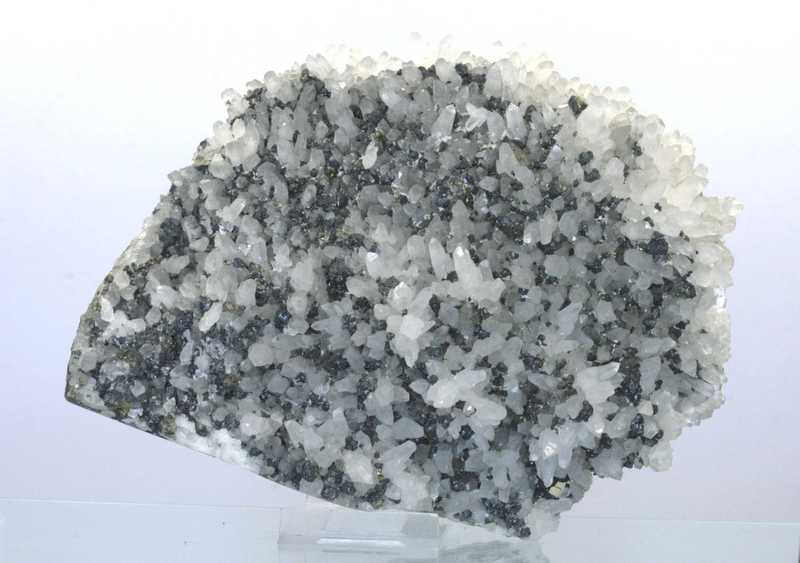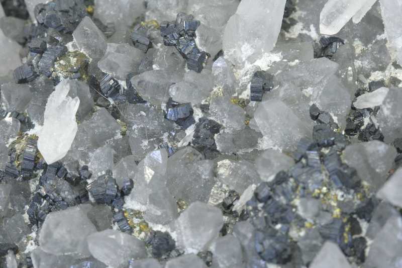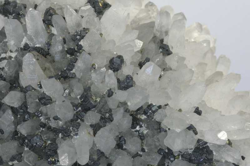 Museumsstück Bournonit aus der klassischen rumänischen Lagerstätte Cavnic. Absolut einzigartige große Druse von Quarzkristallen, zwischen denen reichlich schwarze radialstrahlige Kristalle von Bournonit wachsen, die gelegentlich mit goldgelben Kristallen von Chalkopyrit verwachsen; TOP Exemplar!!!