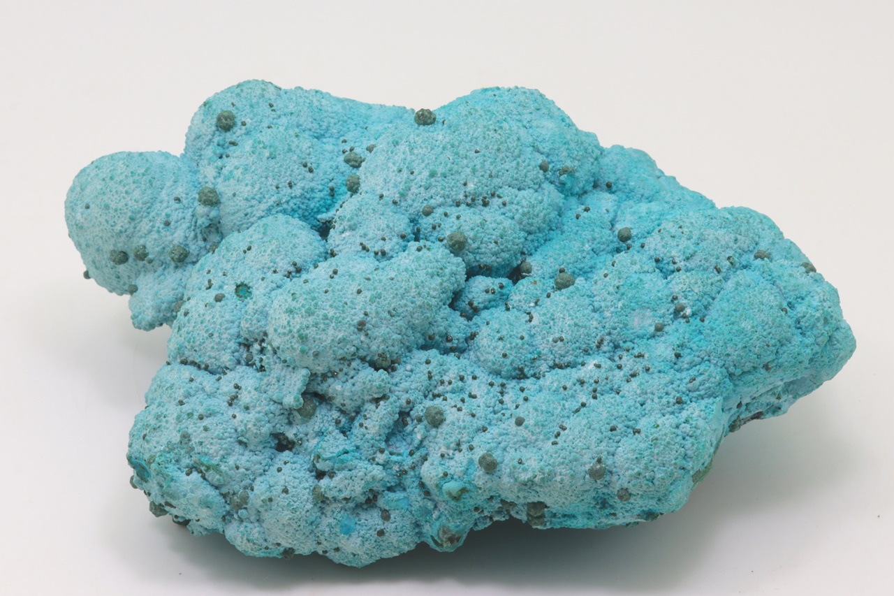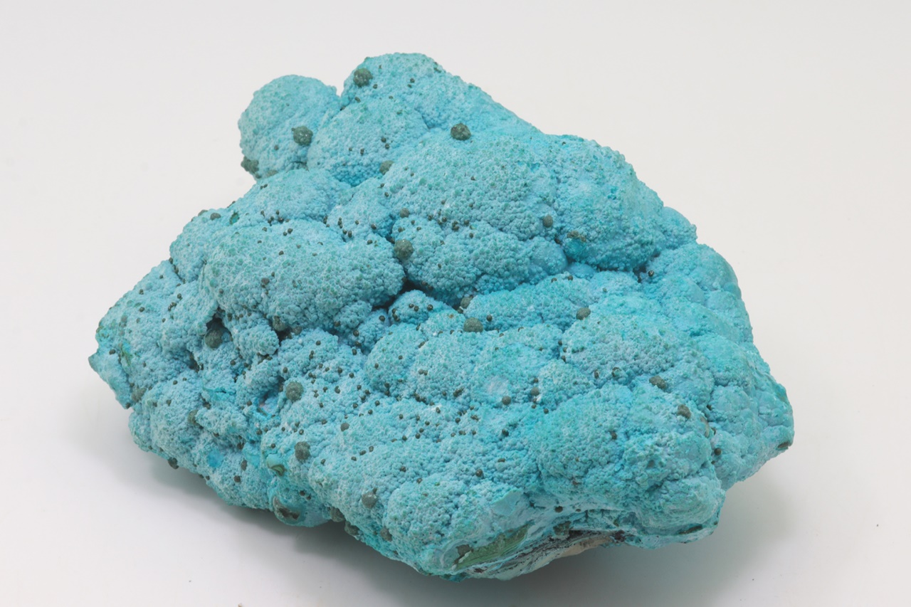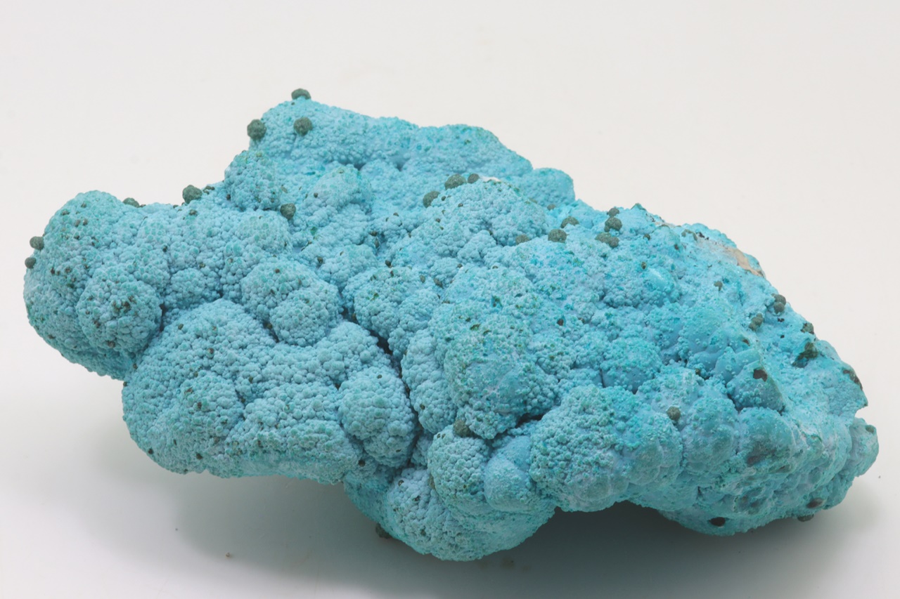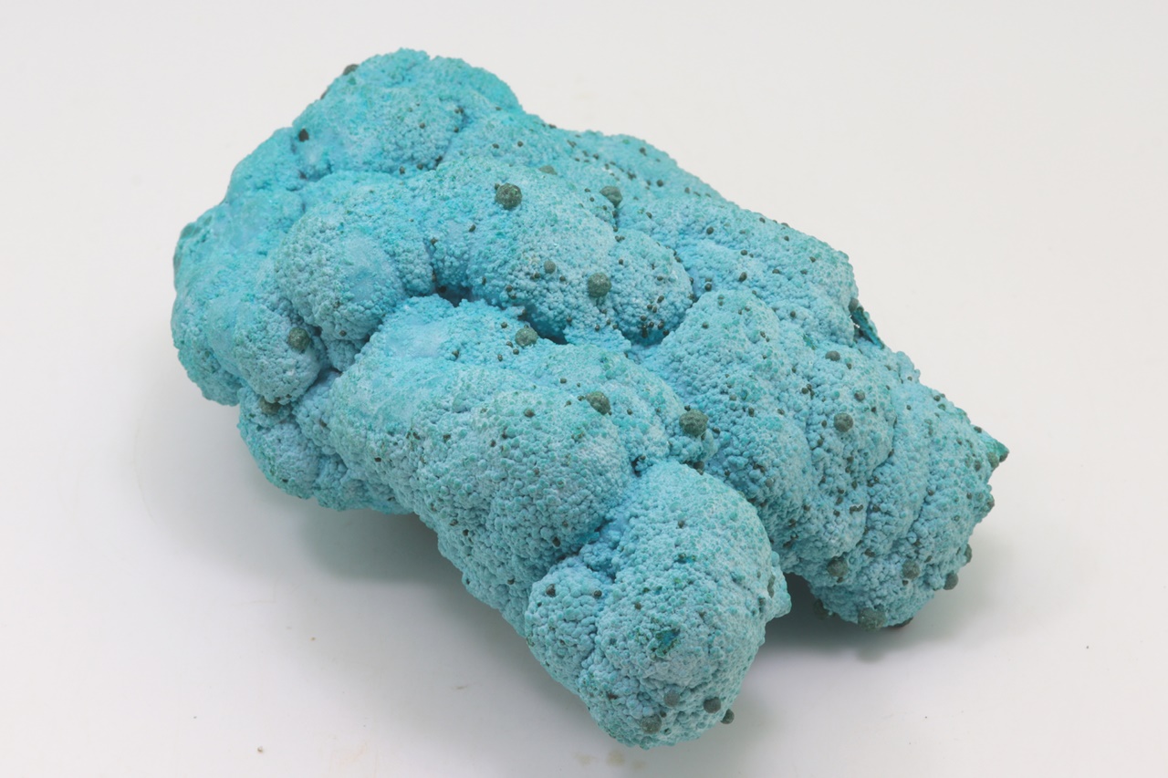 Nádherný, oboustranný vzorek modrého chrysokolu světové kvality porůstajíchoí velké ledvinité agregáty malachitu, na tento chrysokol pak nasedají menší, cca 1 mm velké kuličky stejného minerálu a až 4 mm velké kuličky malachitu. Vzorek je stabilizovaný, proto časem neztrácí vodu a tudíž i barvu.