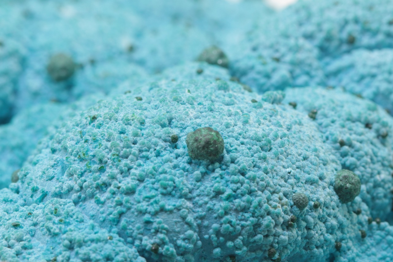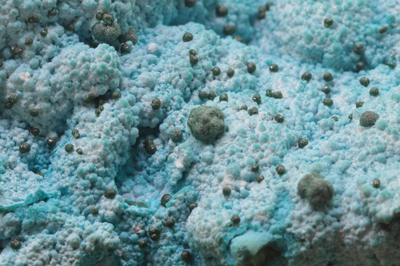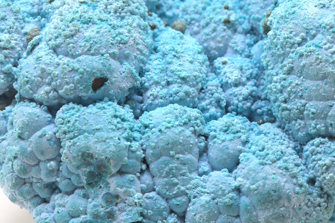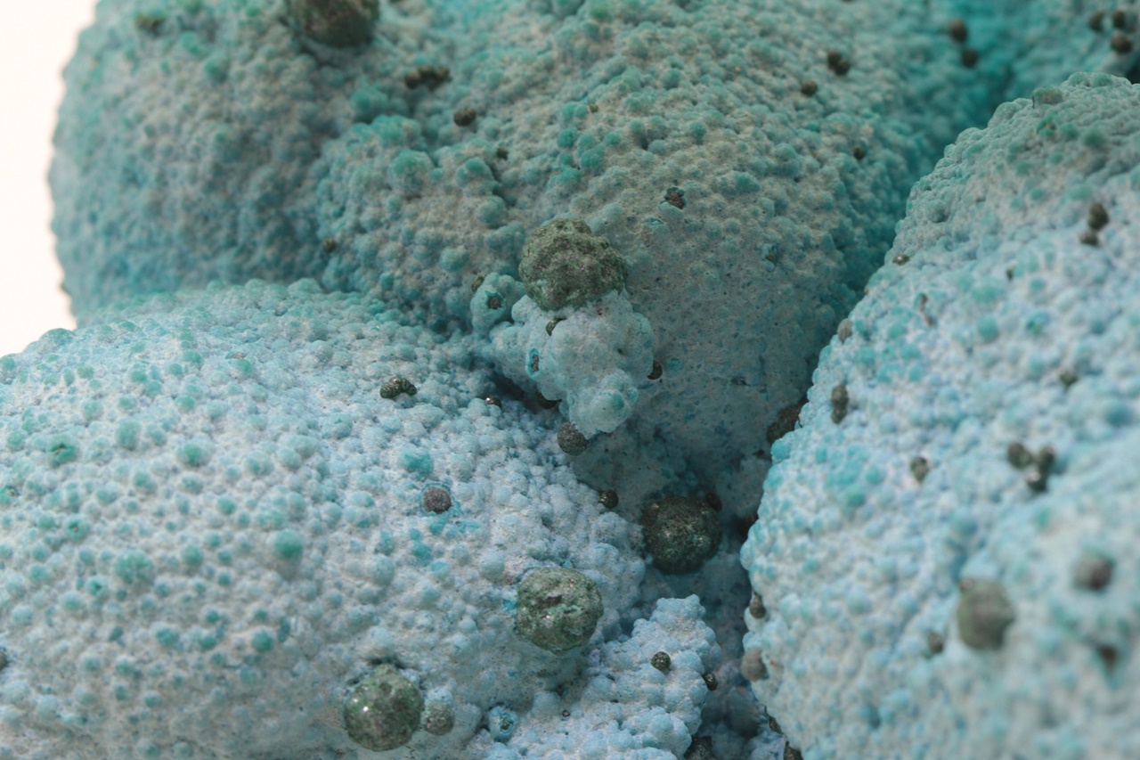 Nádherný, oboustranný vzorek modrého chrysokolu světové kvality porůstajíchoí velké ledvinité agregáty malachitu, na tento chrysokol pak nasedají menší, cca 1 mm velké kuličky stejného minerálu a až 4 mm velké kuličky malachitu. Vzorek je stabilizovaný, proto časem neztrácí vodu a tudíž i barvu.