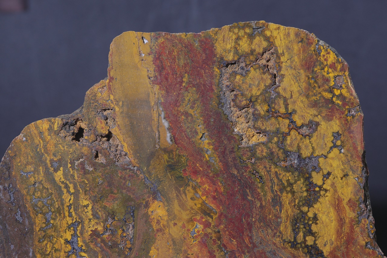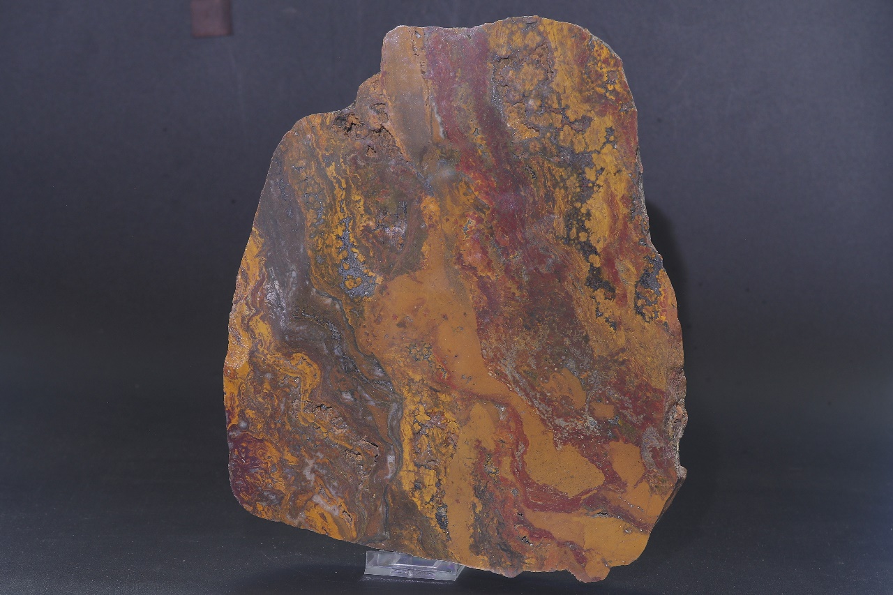 Polierter eisenhaltiger Quarz mit wunderschönem gelb-rotem Muster.