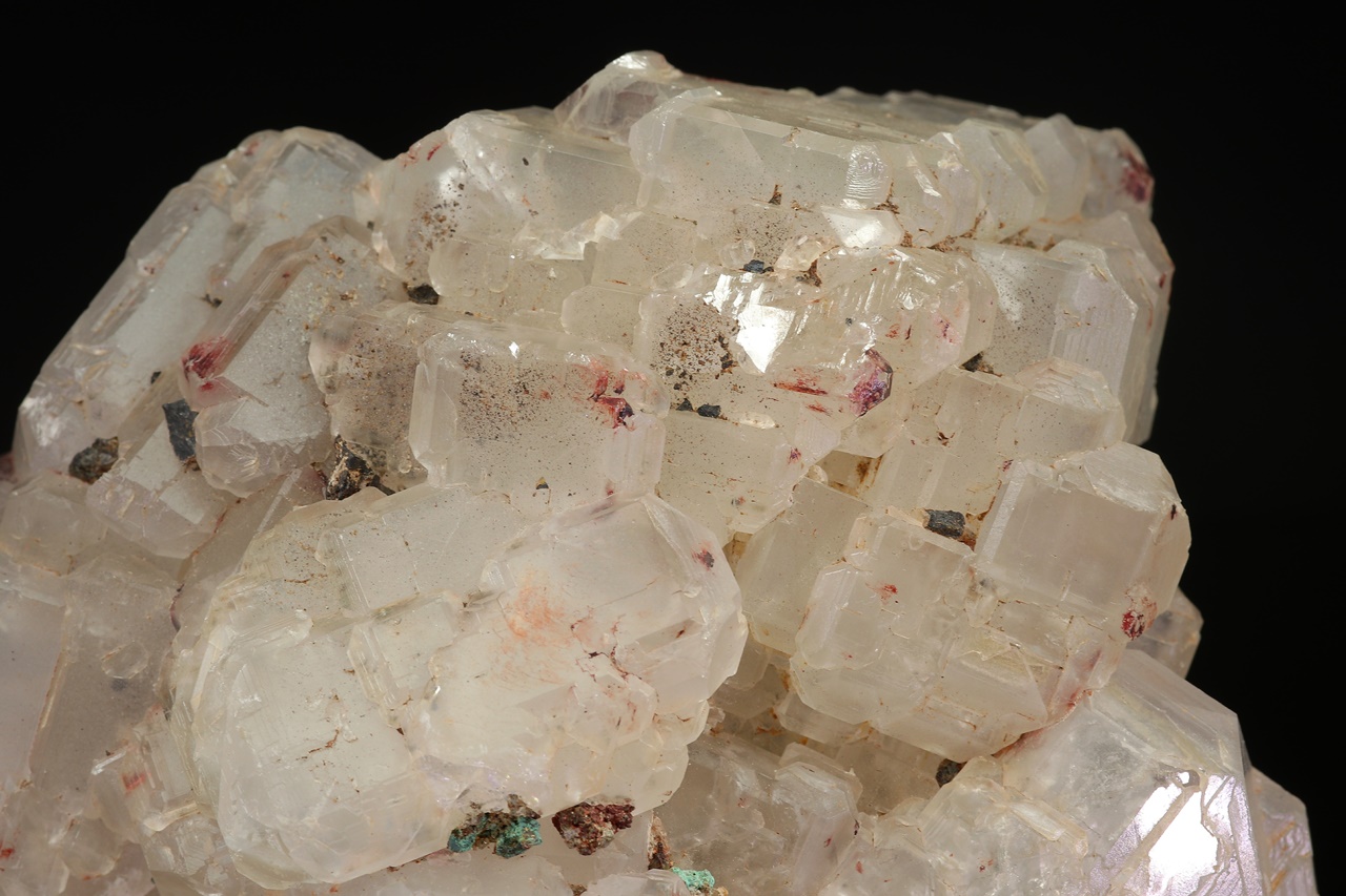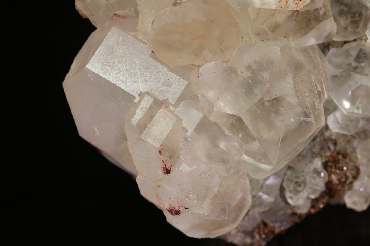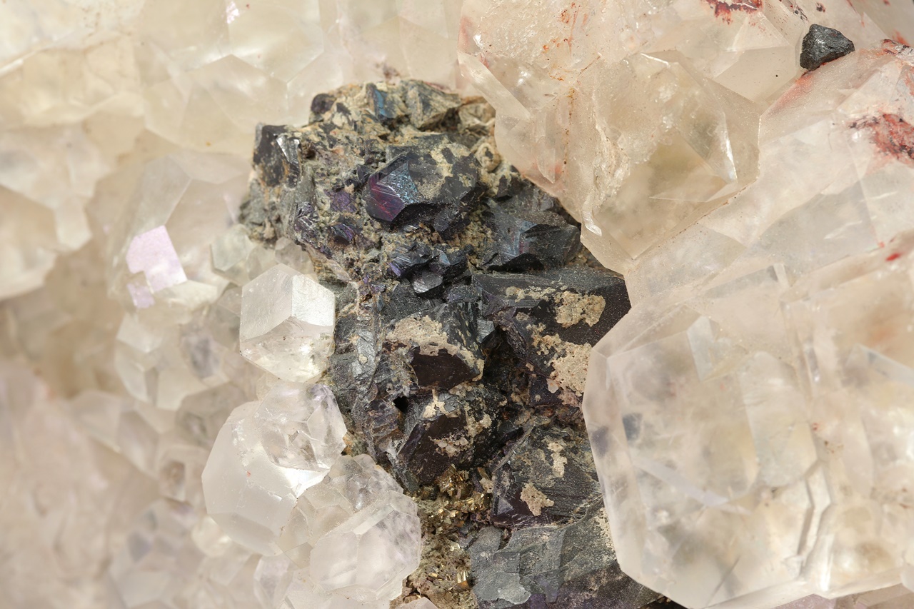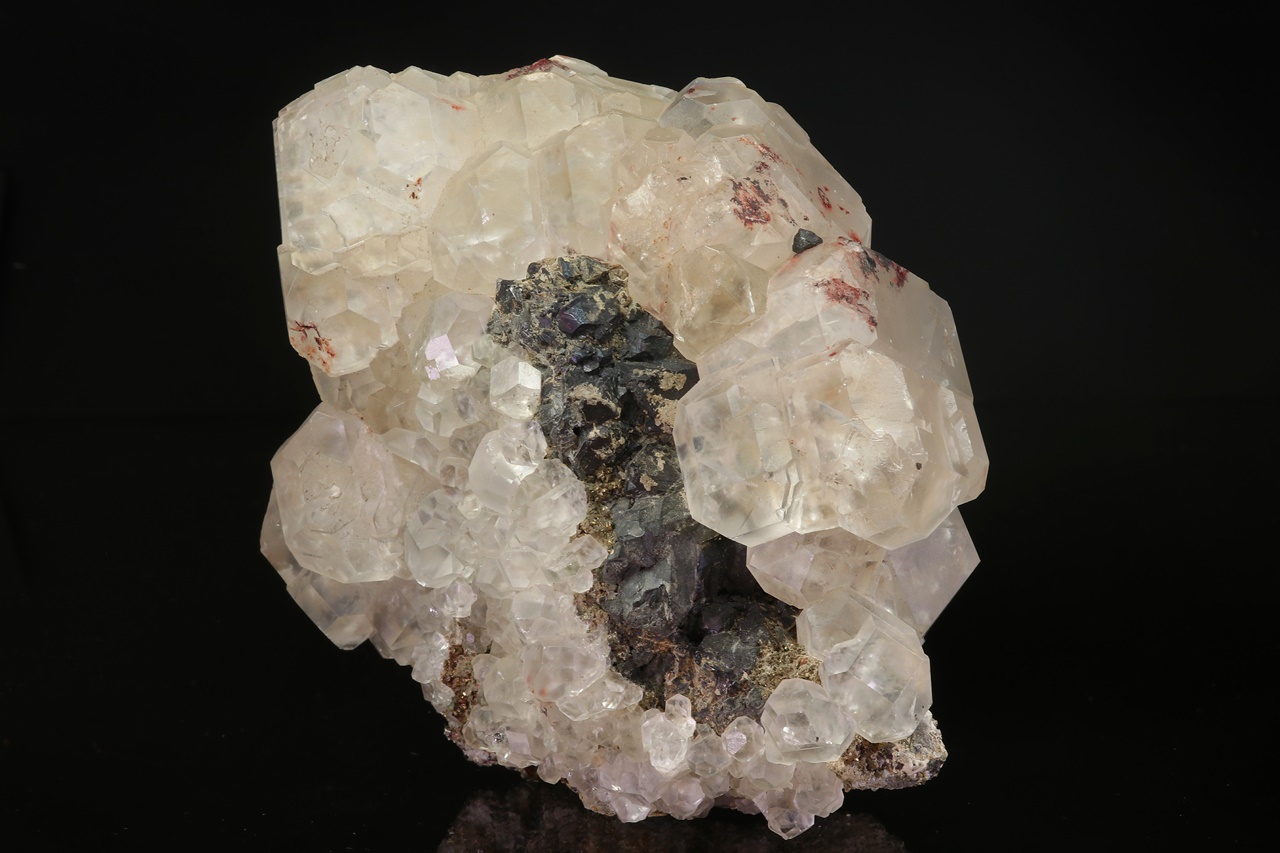 Wunderschönes Exemplar klarer Fluoritkristalle, die ein Verbund von Würfel und Dodekaeder bilden, gewachsen auf Kristallen von Galenit. Die Fluoritkristalle sind außerordentlich rein, und auf einigen kann man einen durch Lichtbrechung verursachten Regenbogeneffekt beobachten.