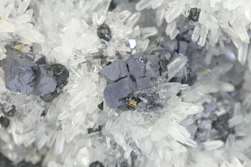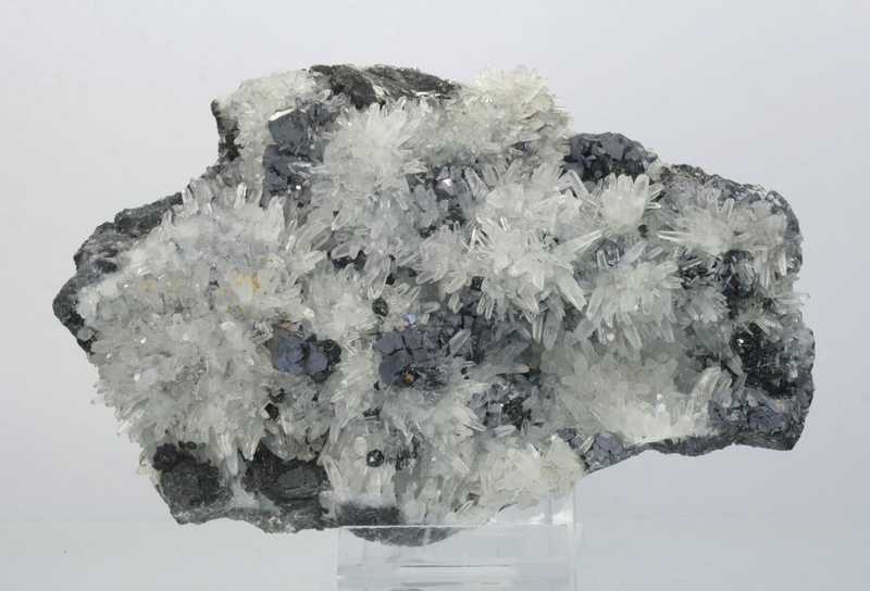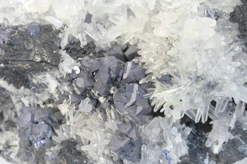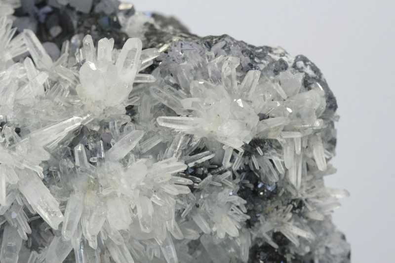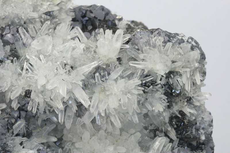 Sehr schöne Probe von Mineralien, typisch für das bulgarische Lagerstätte Madan. Eine sehr ästhetische große Probe von Sphalerit-Galenit-Adergestein, besetzt mit Büscheln von farblosen Quarz-Kristallen, zwischen denen Kristalle von Galenit und möglicherweise Sphalerit wachsen .