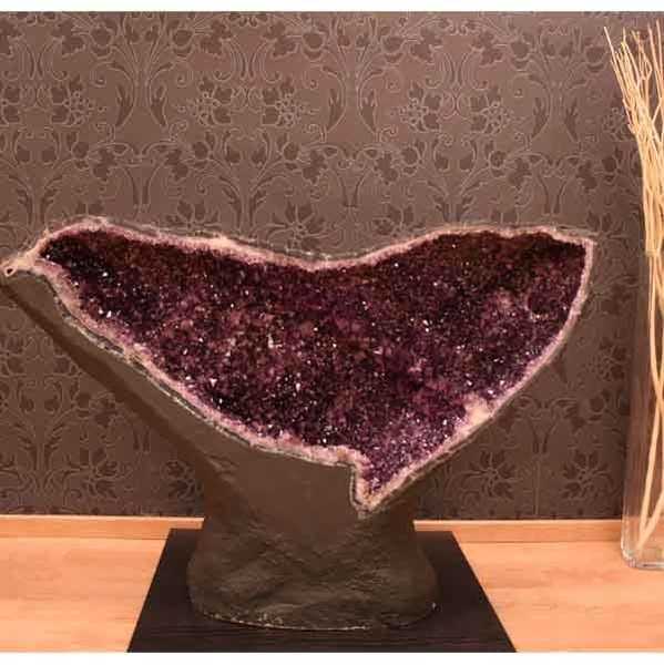 Unikátní geoda s tvarem velrybí ploutve (srdce) je vyplněná velkými krystaly svěže fialové barvy. V naší nabídce je i druhá polovina této geody.. Unikátní geoda s tvarem velrybí ploutve (srdce) je vyplněná velkými krystaly svěže fialové barvy. Vnitřkem geody vede atraktivní pruh s většími krystaly.