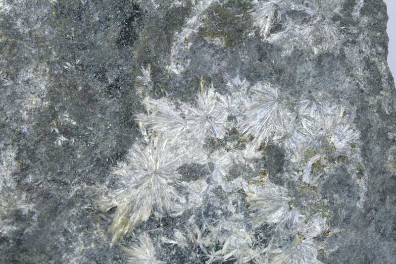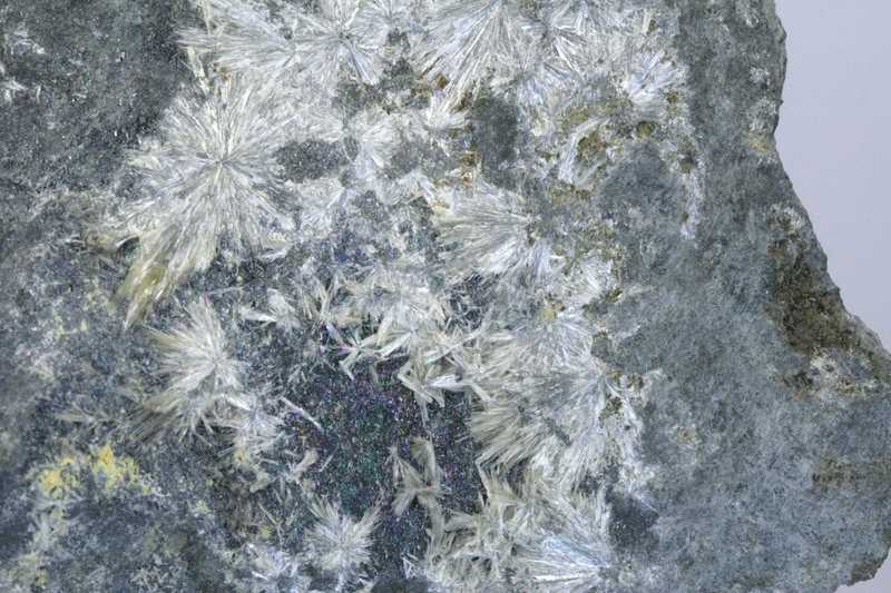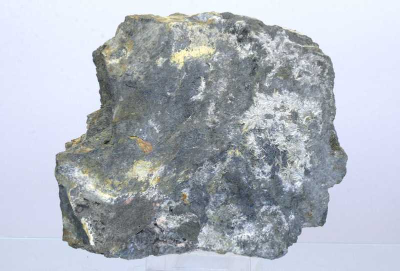 Sehr schönes Beispiel des wunderschönen Antimonoxids Valentinit aus dem slowakischen Lagerstätte Pezinok. Eine sehr hochwertige Probe von weiß glänzenden radialstrahligen Valentinit-Aggregaten, die reichlich auf einem großen Stück Antimonerz auftreten.