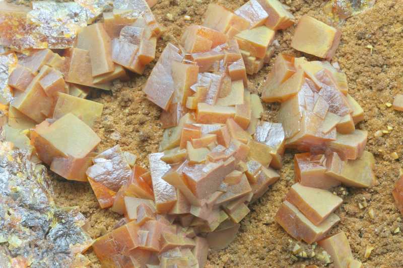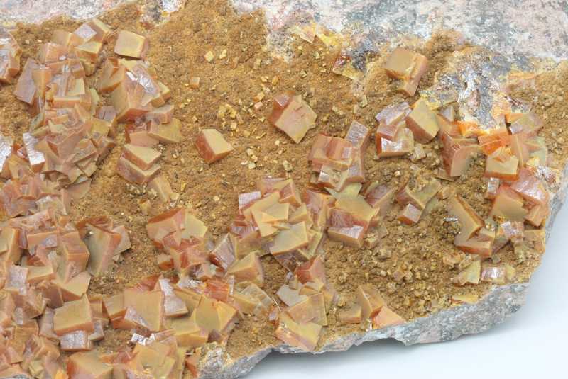 Probe von Wulfenit aus der mexikanischen Lokalität Mapimi. Druse von orangefarbenen Wulfenit-Kristallen mit einer Größe von bis zu 12 mm.