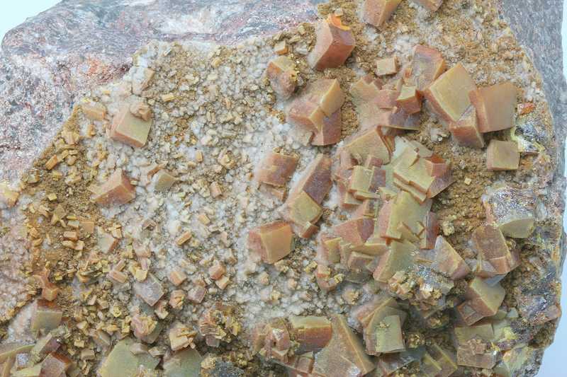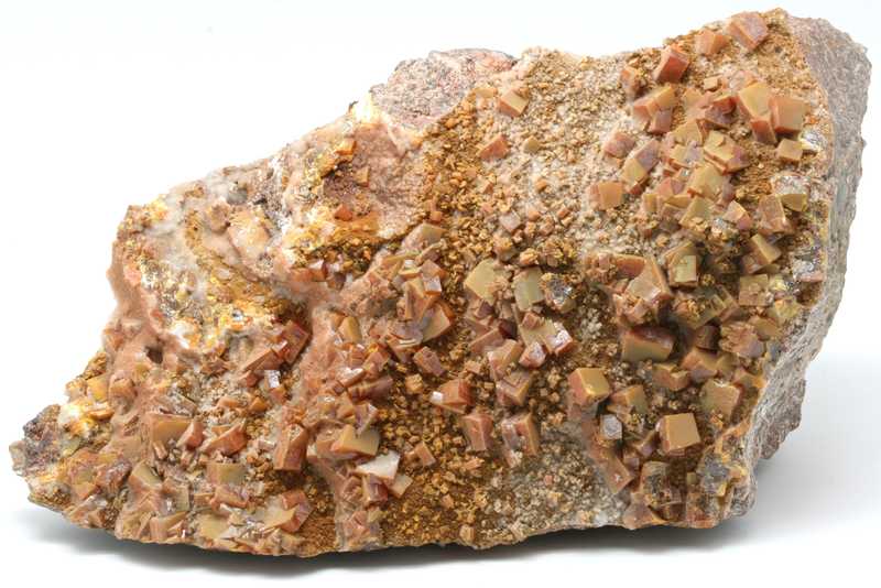 Probe von Wulfenit aus der mexikanischen Lokalität Mapimi. Druse von orangefarbenen Wulfenit-Kristallen mit einer Größe von bis zu 14 mm.