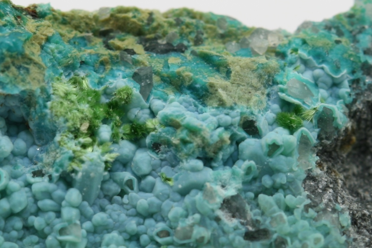 Radiäre Aggregate von grünen, nadelförmigen Kristallen des Calciopetersits – ein seltener Phosphat vom Typlokalität.