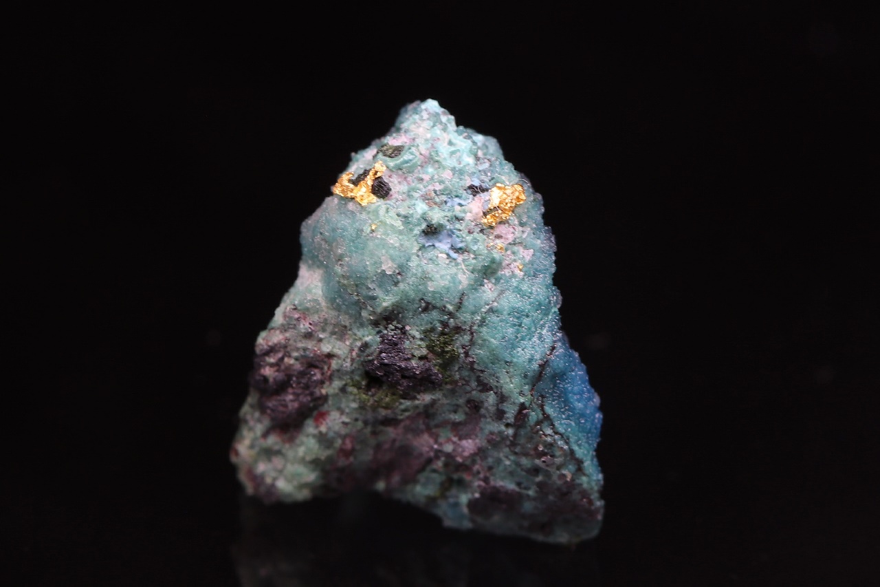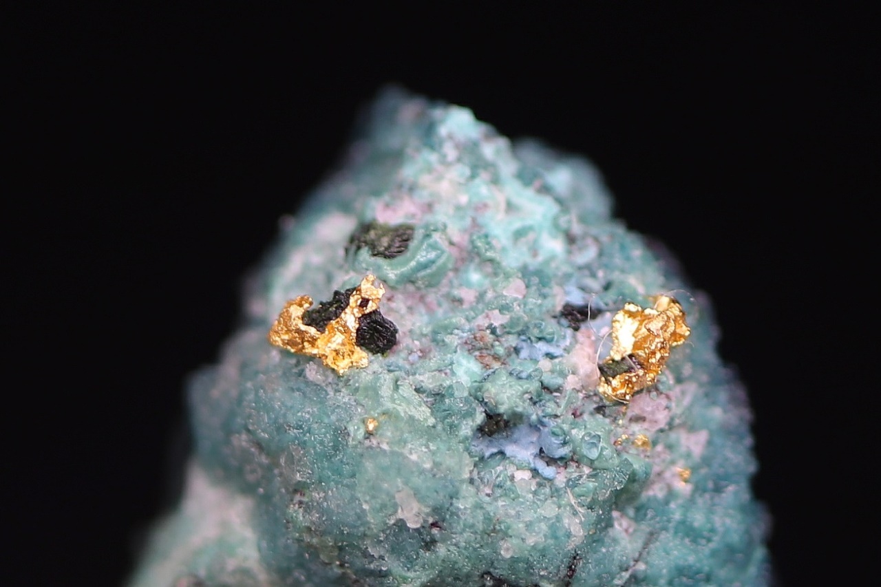 Aggregatzustände aus reinem Gold bis zu 2 mm Größe in Quarz, durchwachsen von sekundären Kupfermineralen.
