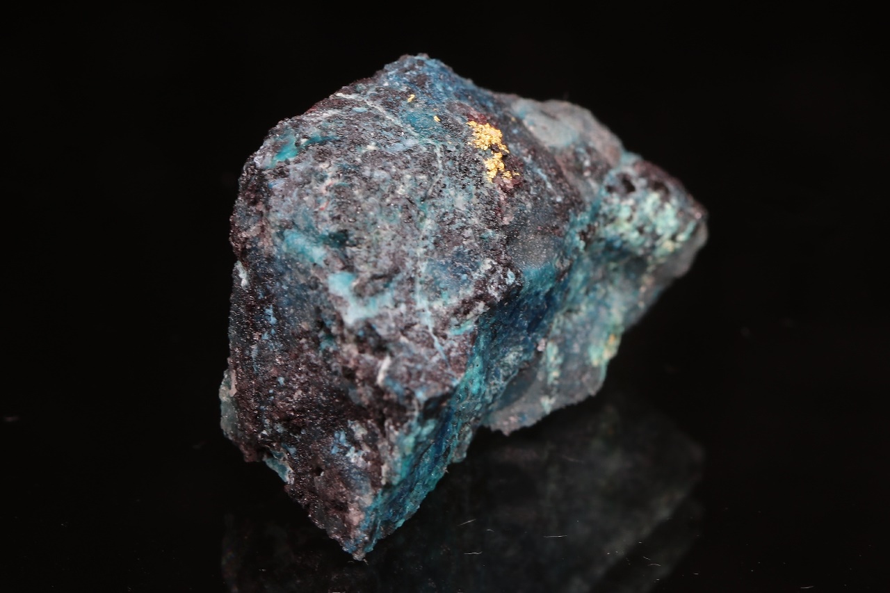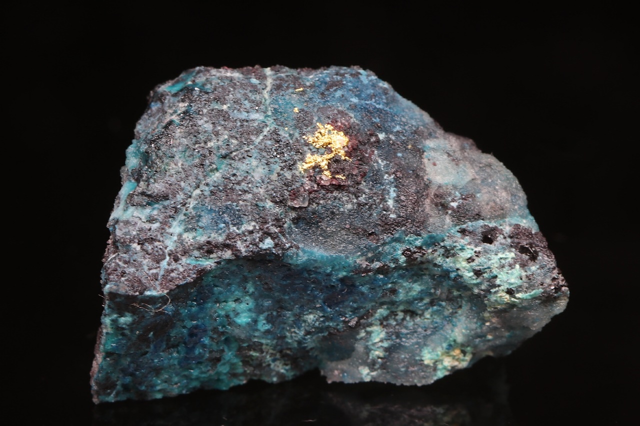 Aggregat aus Gold in quarzhaltigem Gestein mit sekundären Kupfermineralen. Der Aggregat ist 3,5 mm groß.