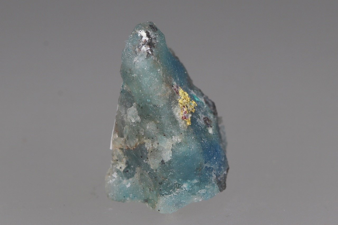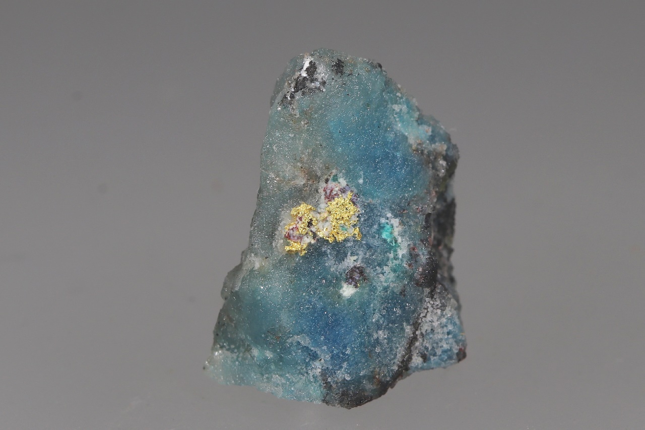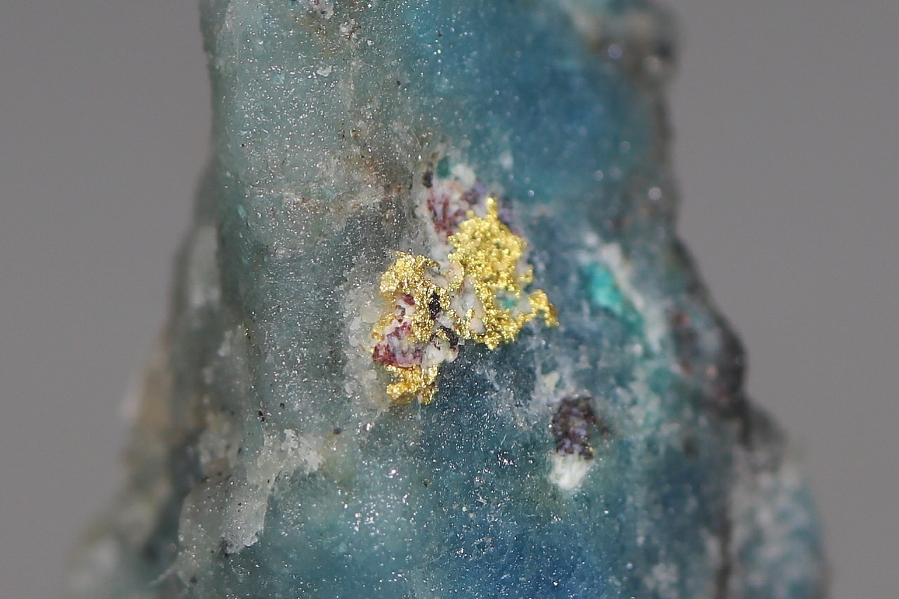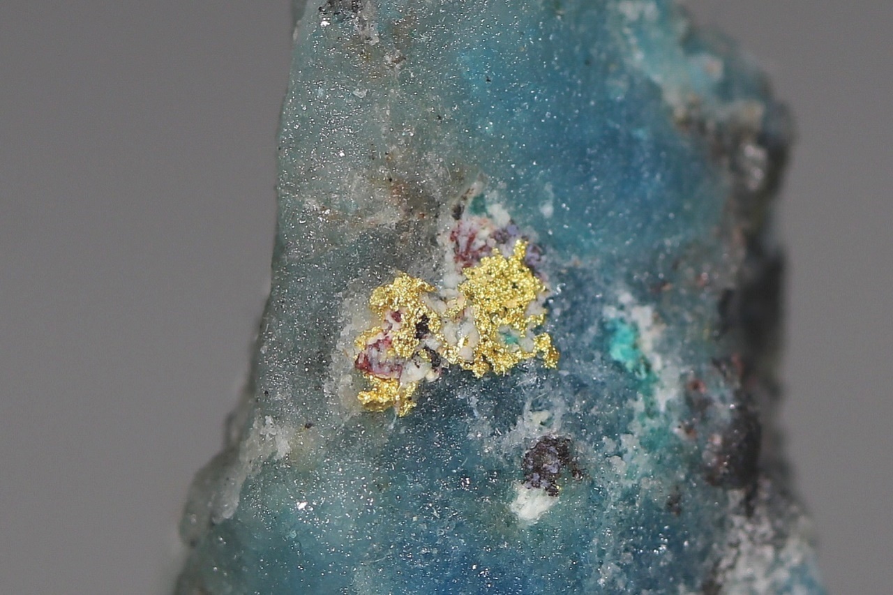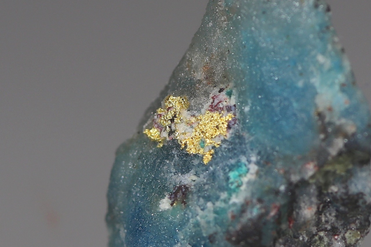 Ein fünf Millimeter großes Aggregat aus reinem Gold, gewachsen in Quarzgestein mit grünblauen sekundären Kupfermineralien.
