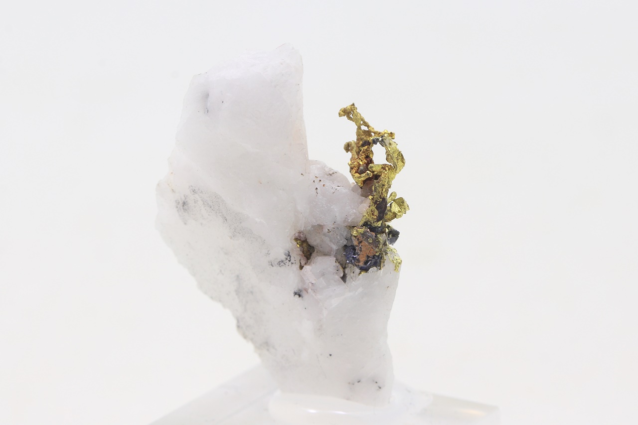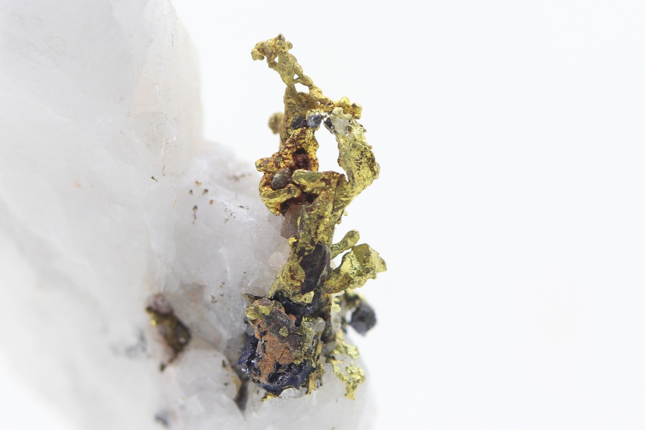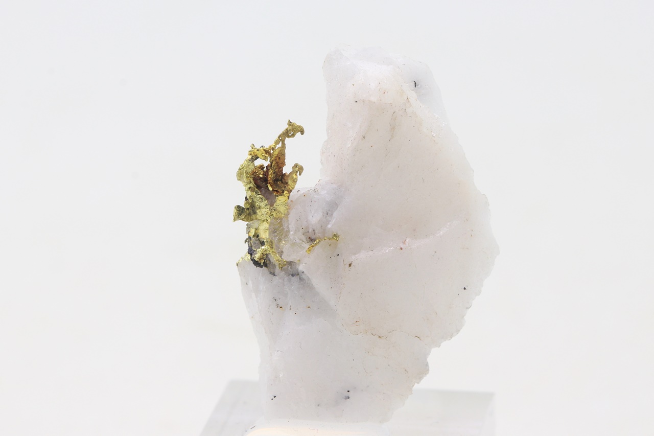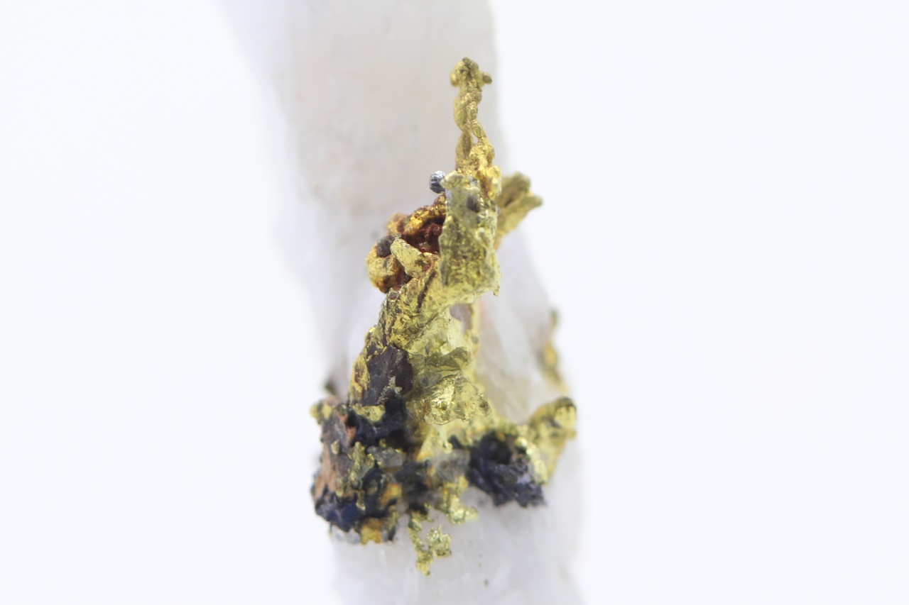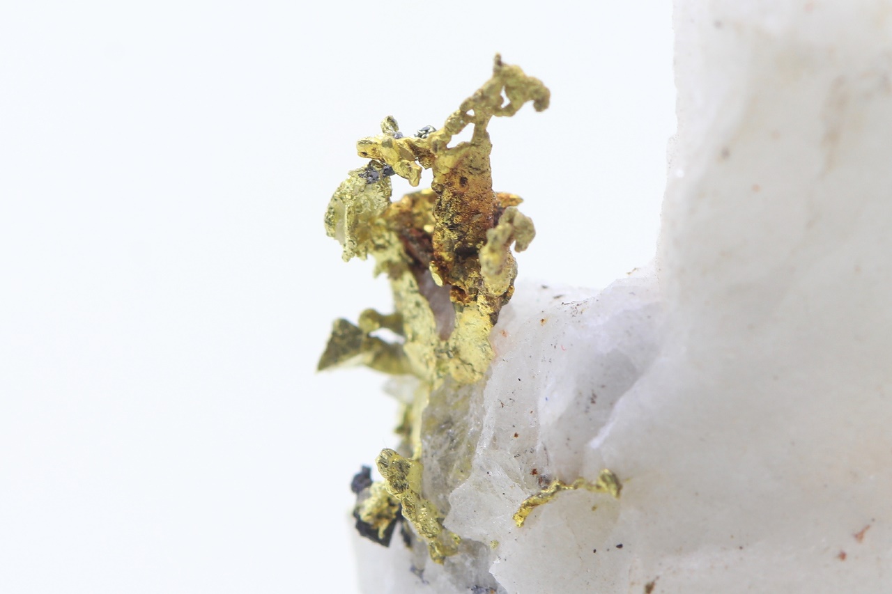 Kristallisiertes Gold im weißen Quarz. Das Gold ist 12 mm groß.