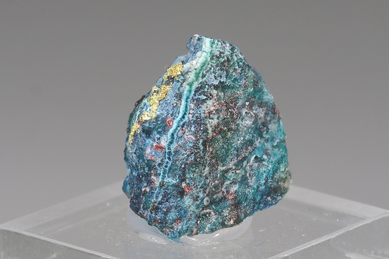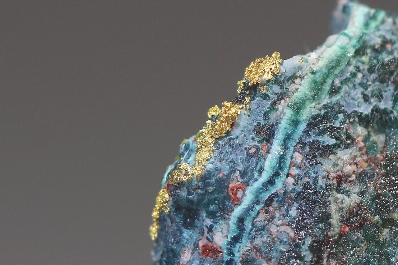 Žilka reinen Goldes 9 mm lang, gewachsen in blauem Shattuckit.