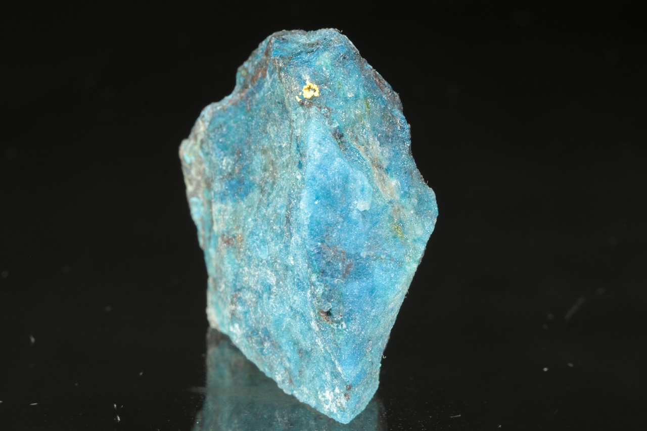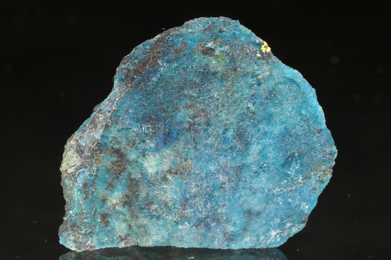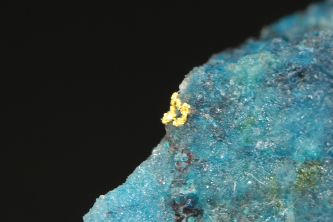 Unübliche und sehr elegante Kombination von Aggregaten aus reinem Gold in kontrastreichem intensiv blauem Shattuckit von Edelsteinqualität. Das Goldaggregat ist mehr als 1 mm groß.