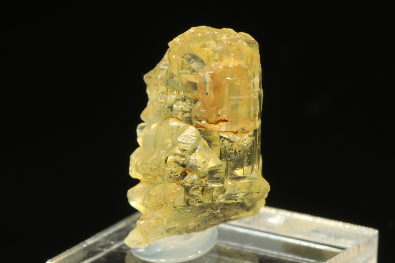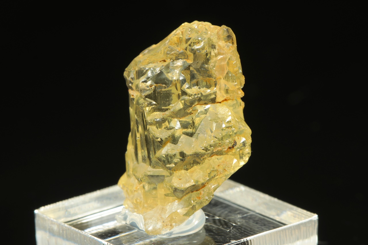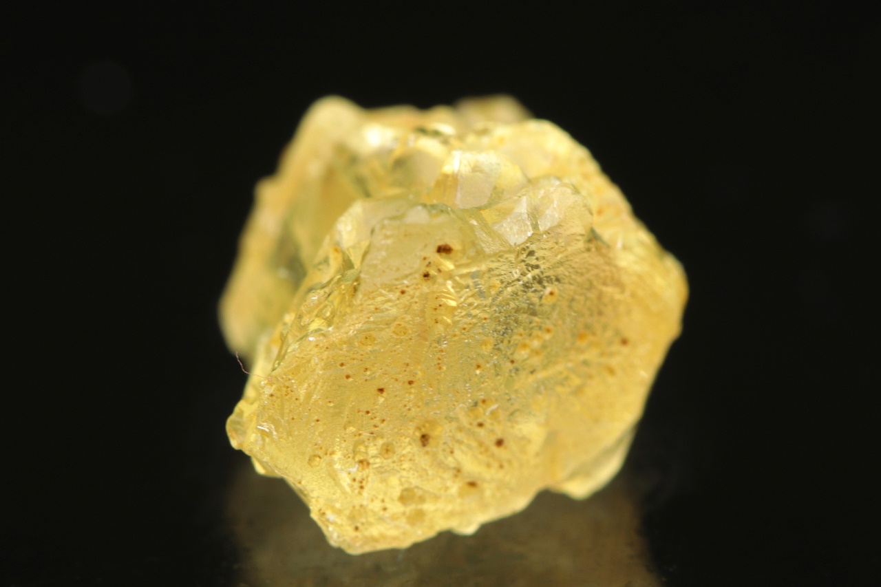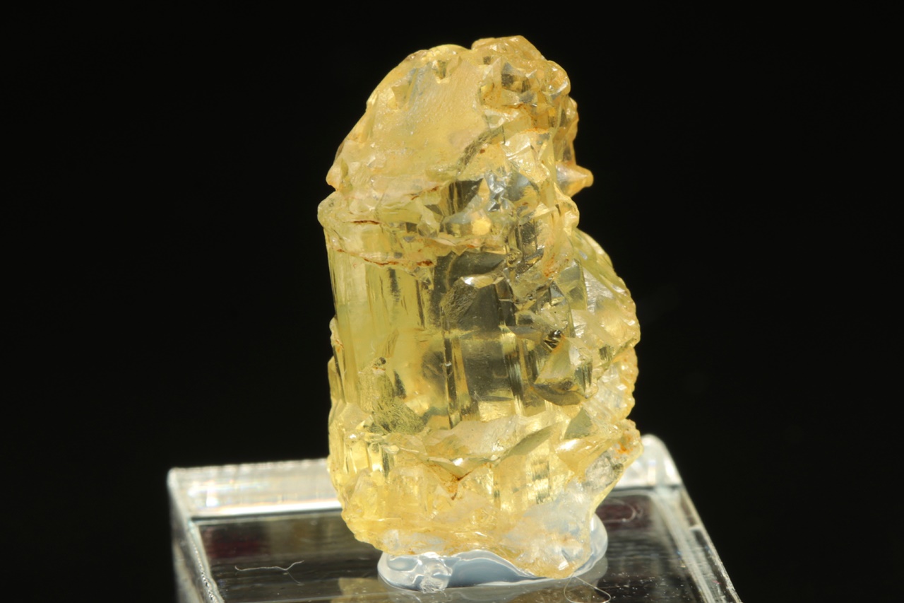 Krystal velmi čistého, intenzivně žlutého krystalu heliodoru drahokamové kvality. Vzorek je intenzivně přírodně naleptán, což mu dodává velmi zajímavou skulptaci.