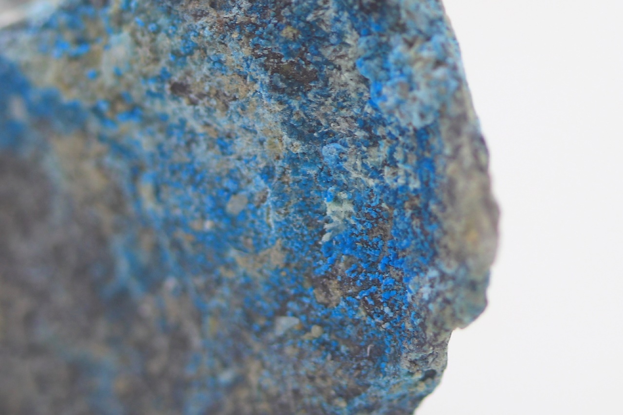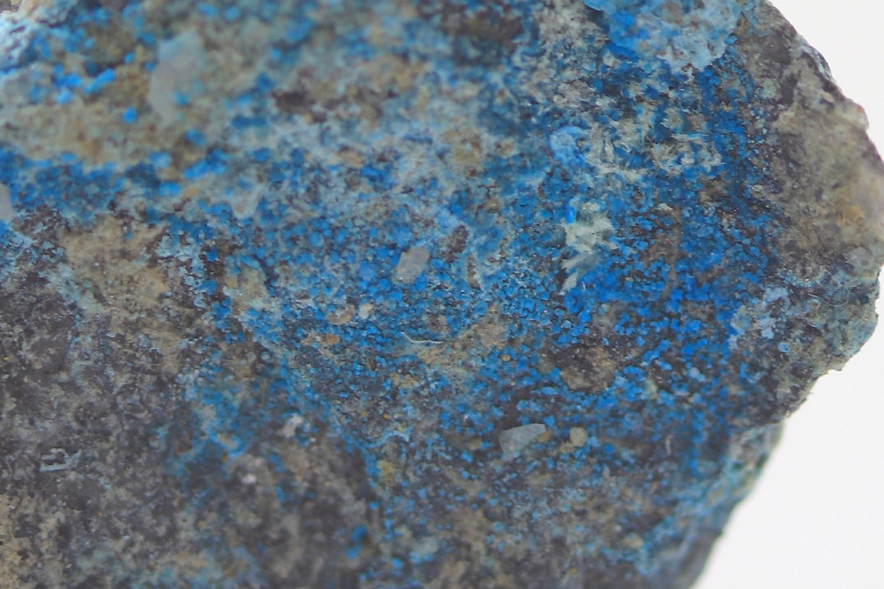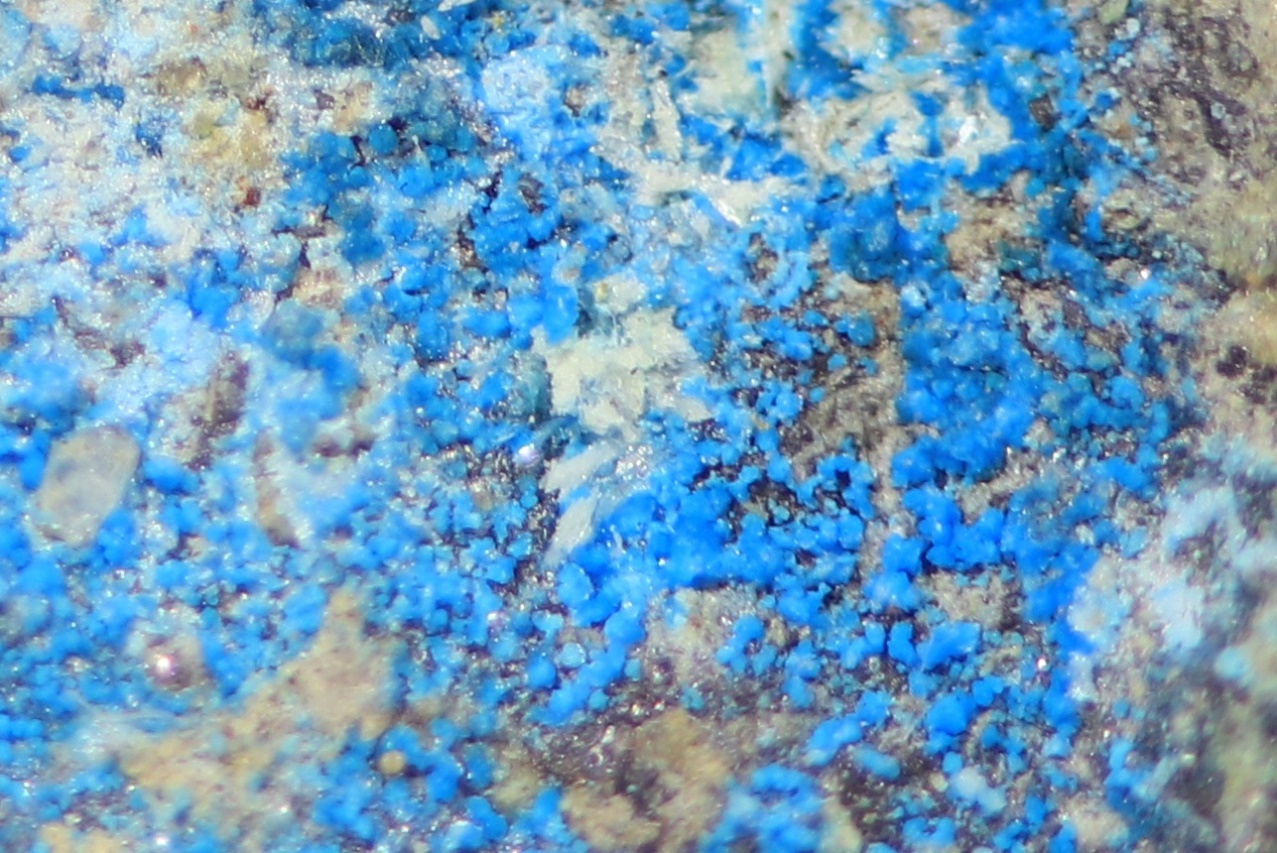 Drobné nazelenalé krystaly Lindackeritu s kulovitými agregáty modrého Lavendulánu.