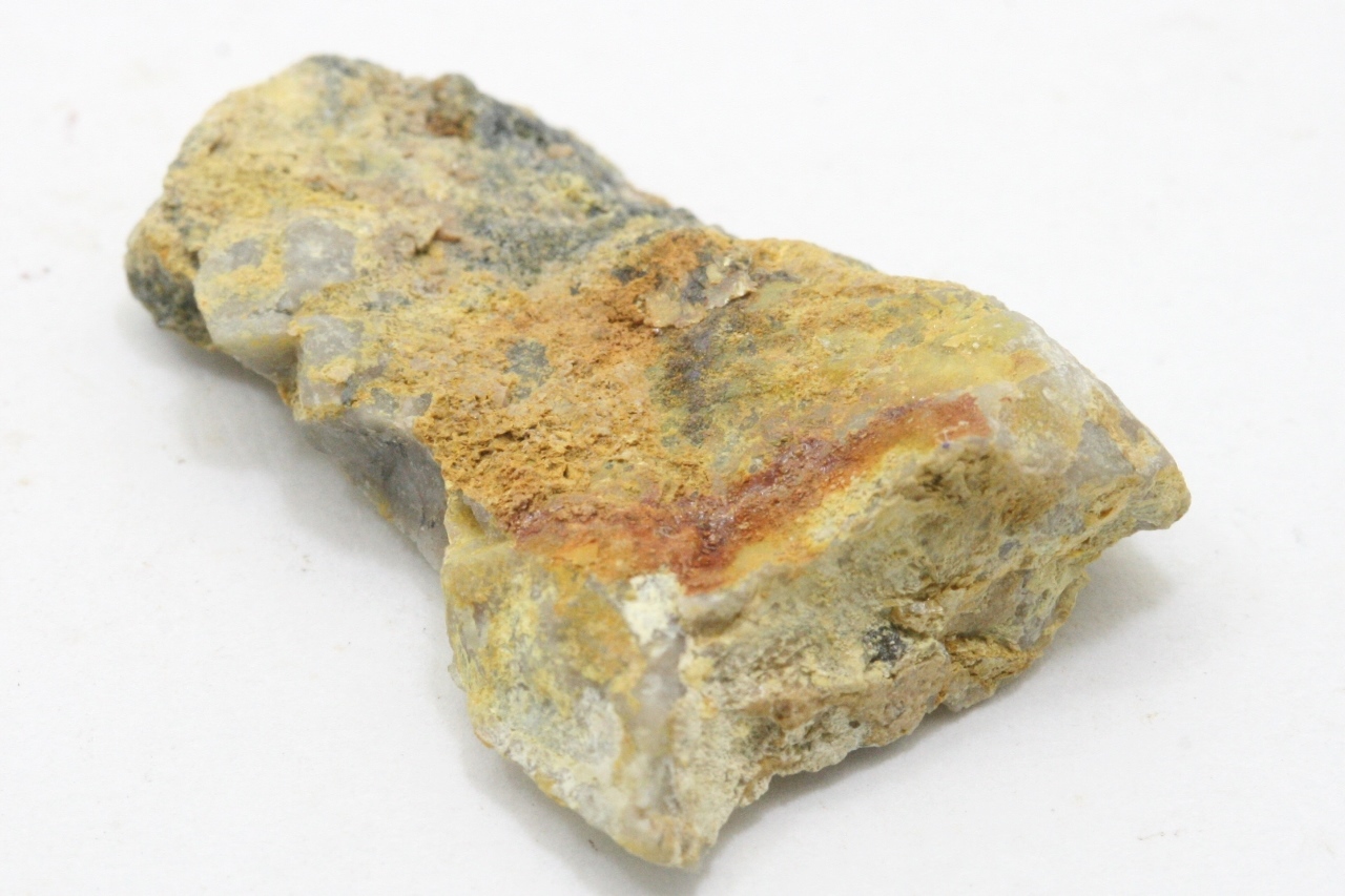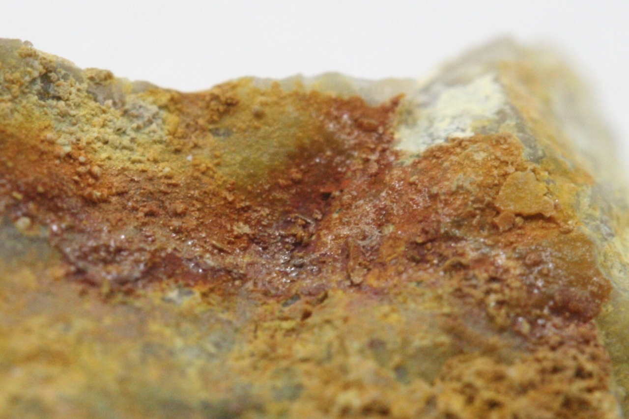 Probe eines seltenen Blei-Uranils – Moctezumit aus der Typlokalität und einzigen Fundstelle weltweit mit einem Wachstum von Tellurit. Die Probe wurde mittels Röntgendiffraktion analysiert.