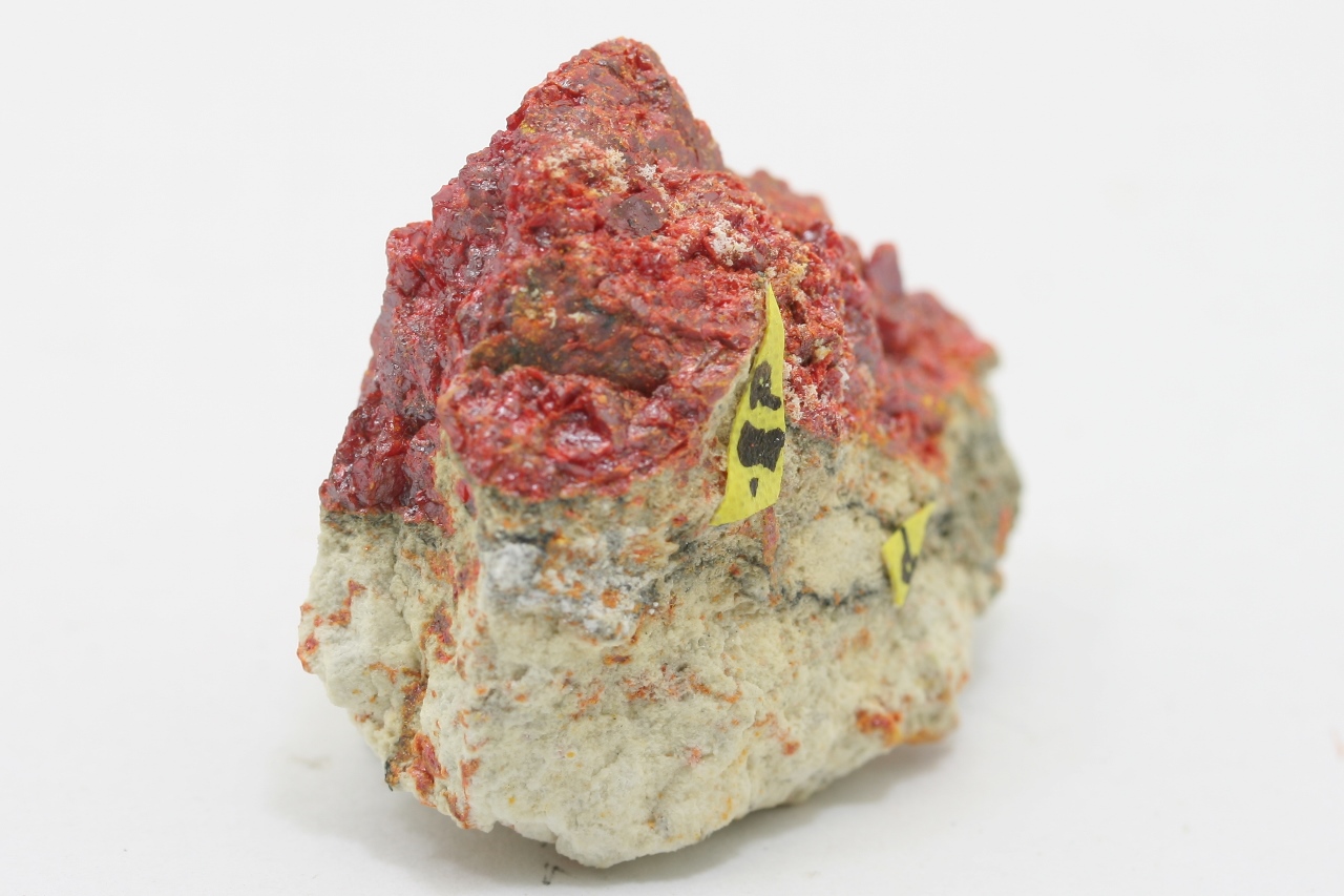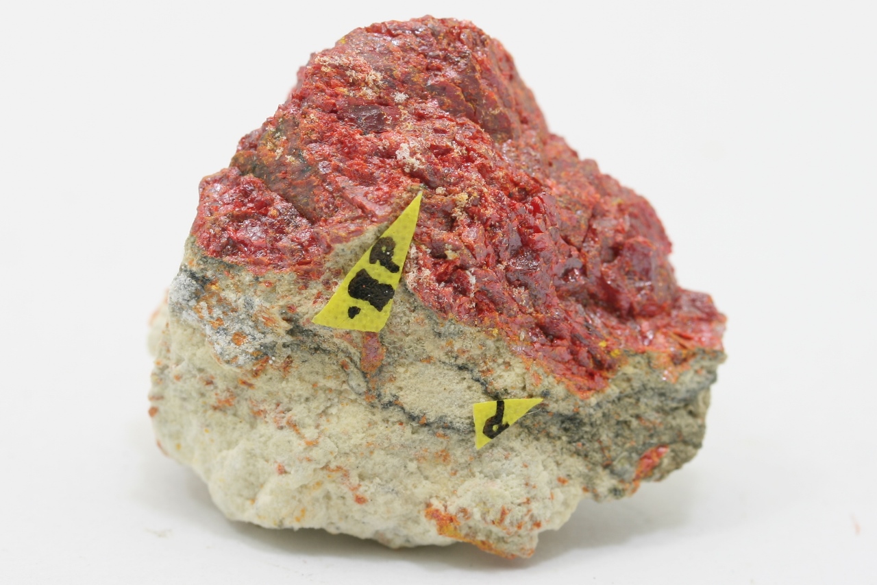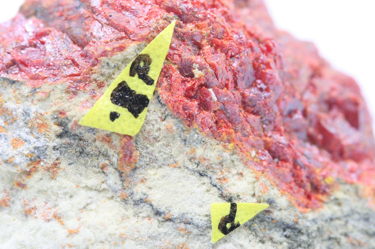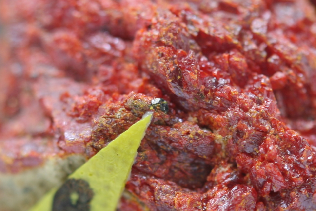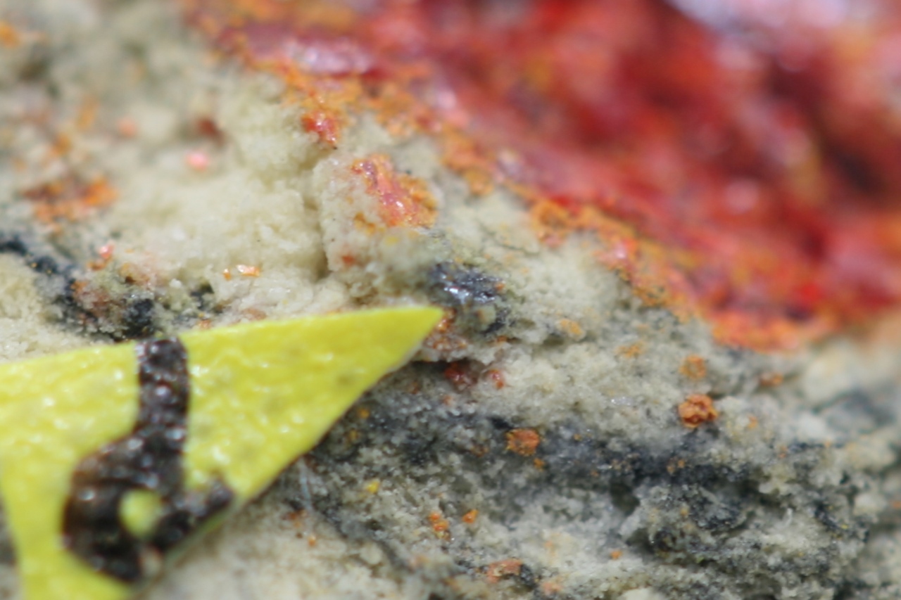 Schwarzer Kristall (ca. 0,5 mm) und ein Korn seltener Thallium- und Antimon-Sulfide aus der Typlokalität.