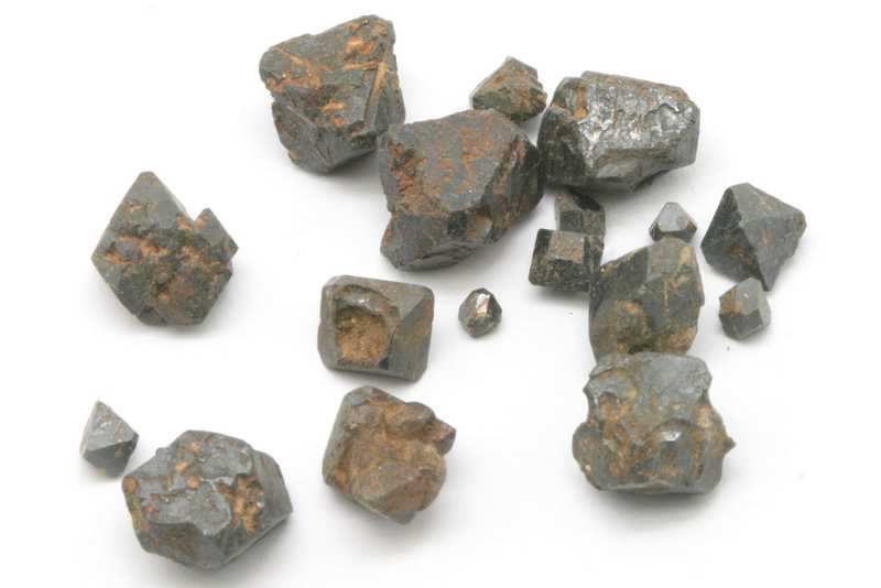 Einige Kristalle von braunem Perovskit. Probe von freien braunen Perovskitkristallen, der größte davon ist 10 mm.