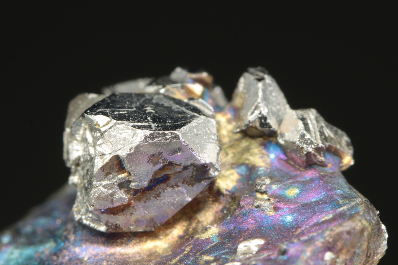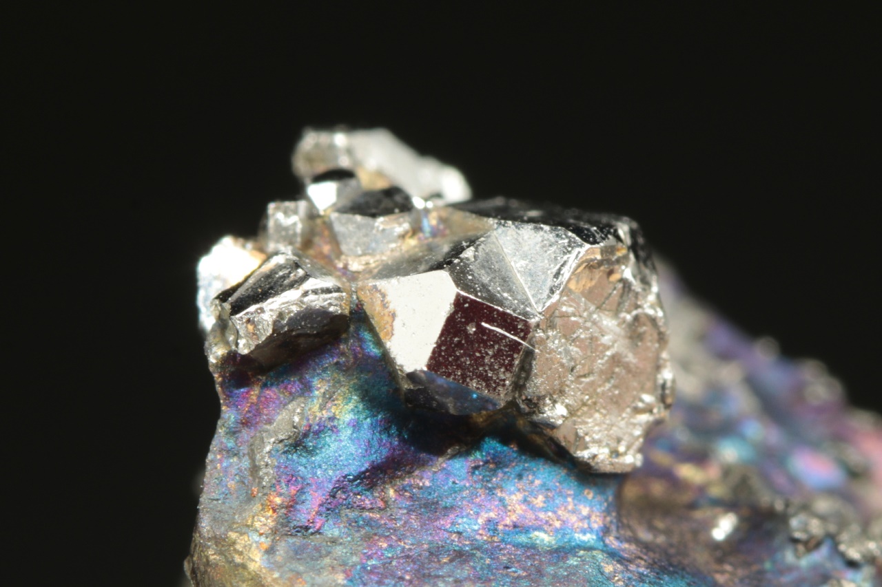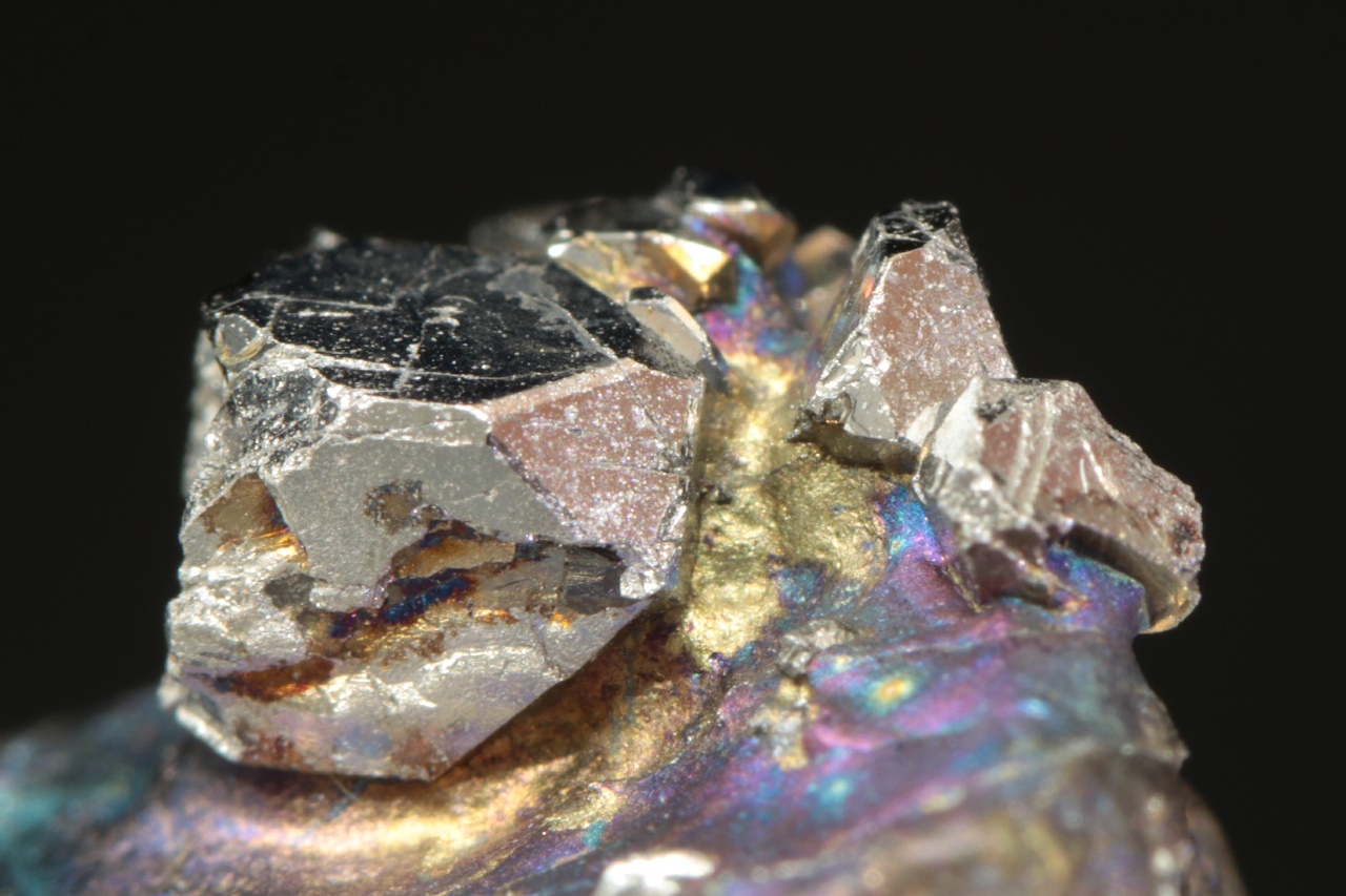 Srostlice několika kubických krystalů kovově lesklého arsenidu platiny – sperrylitu narostlého na chalkopyritu s intenzivními náběhovými barvami. Největší krystal je 3,5 mm velký a má poškozenou jednu stranu krychle. Sperrylity z této lokality patří k nejlepším na světe a to jak velikostí tak svým intenzivním leskem.