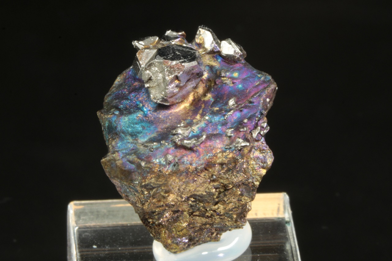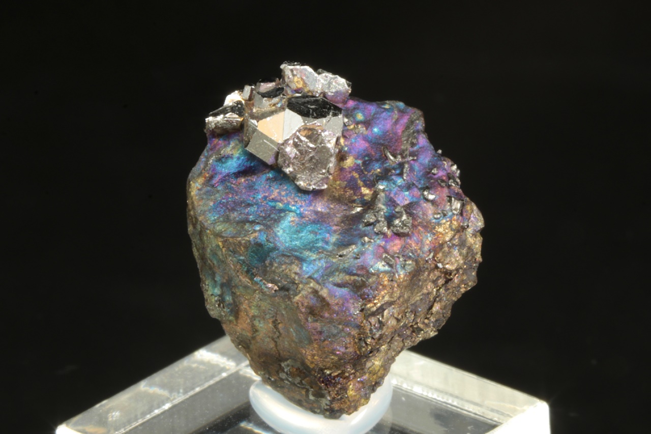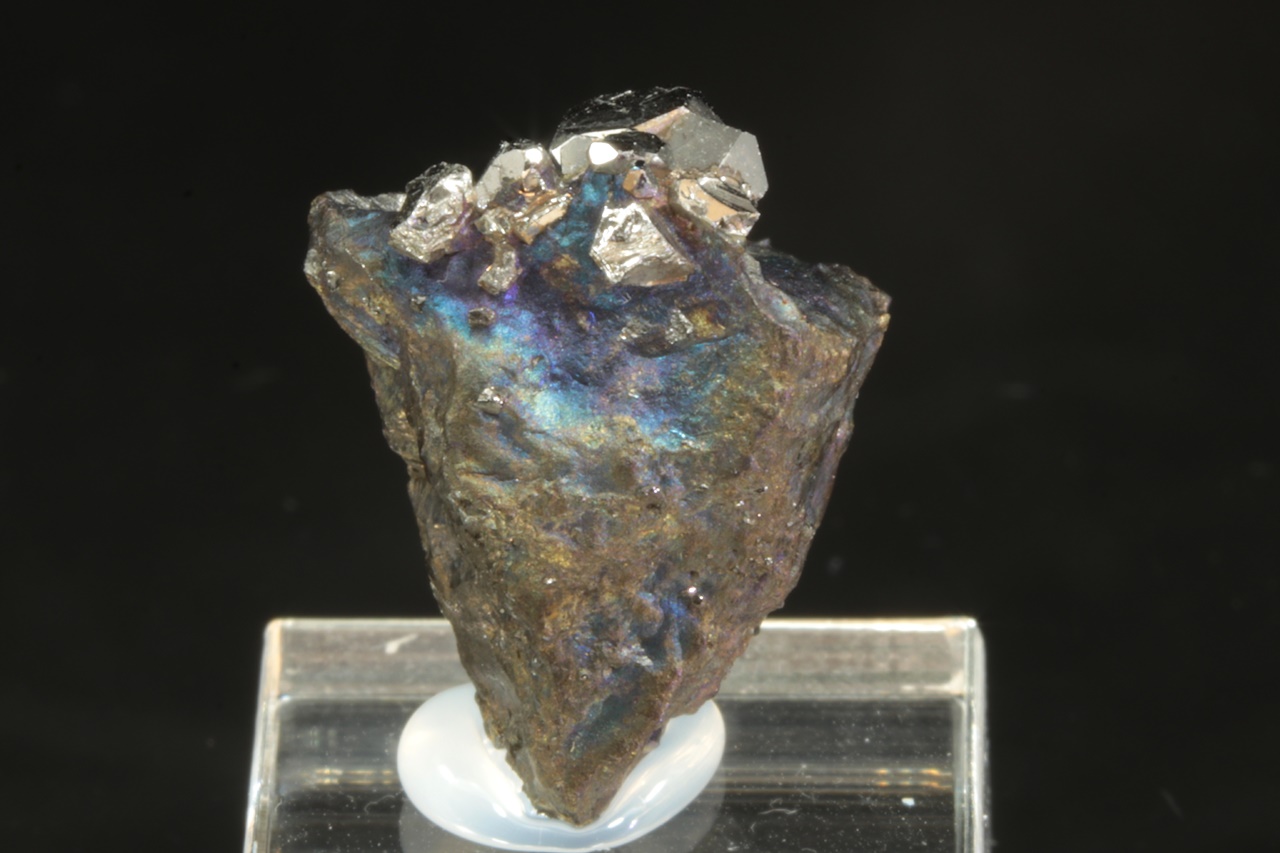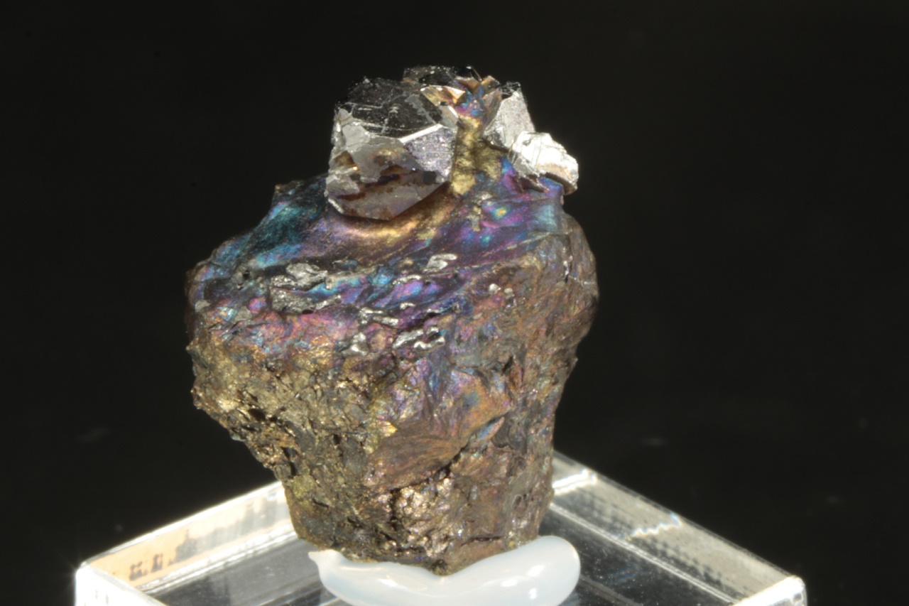 Srostlice několika kubických krystalů kovově lesklého arsenidu platiny – sperrylitu narostlého na chalkopyritu s intenzivními náběhovými barvami. Největší krystal je 3,5 mm velký a má poškozenou jednu stranu krychle. Sperrylity z této lokality patří k nejlepším na světe a to jak velikostí tak svým intenzivním leskem.
