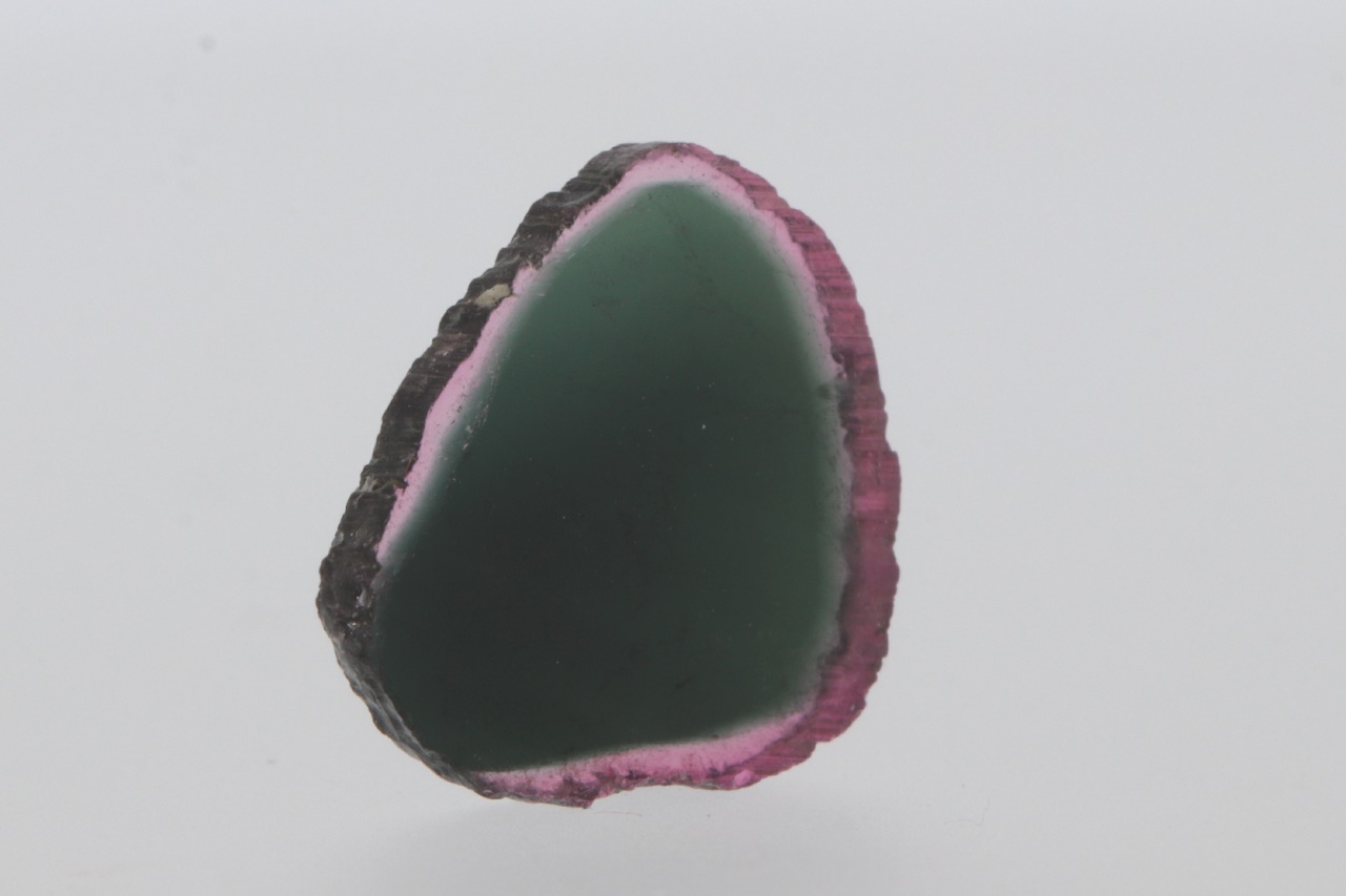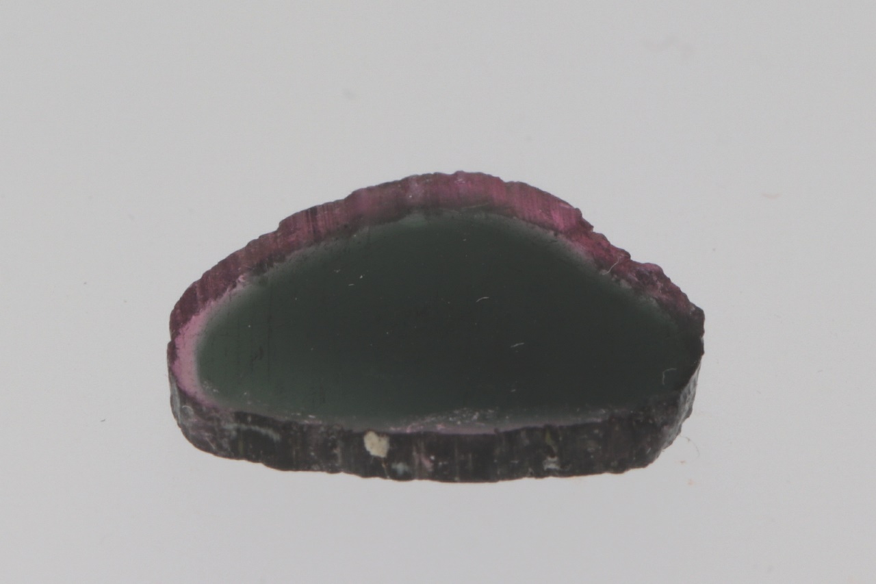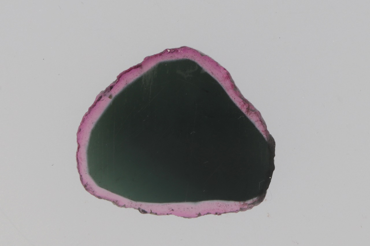 Beidseitig polierte Scheibe aus Turmalin mit einem dunkelgrünen Zentrum und einem rosaroten Rand.