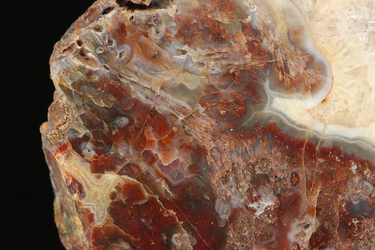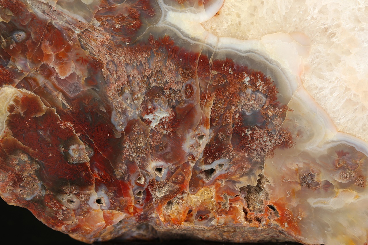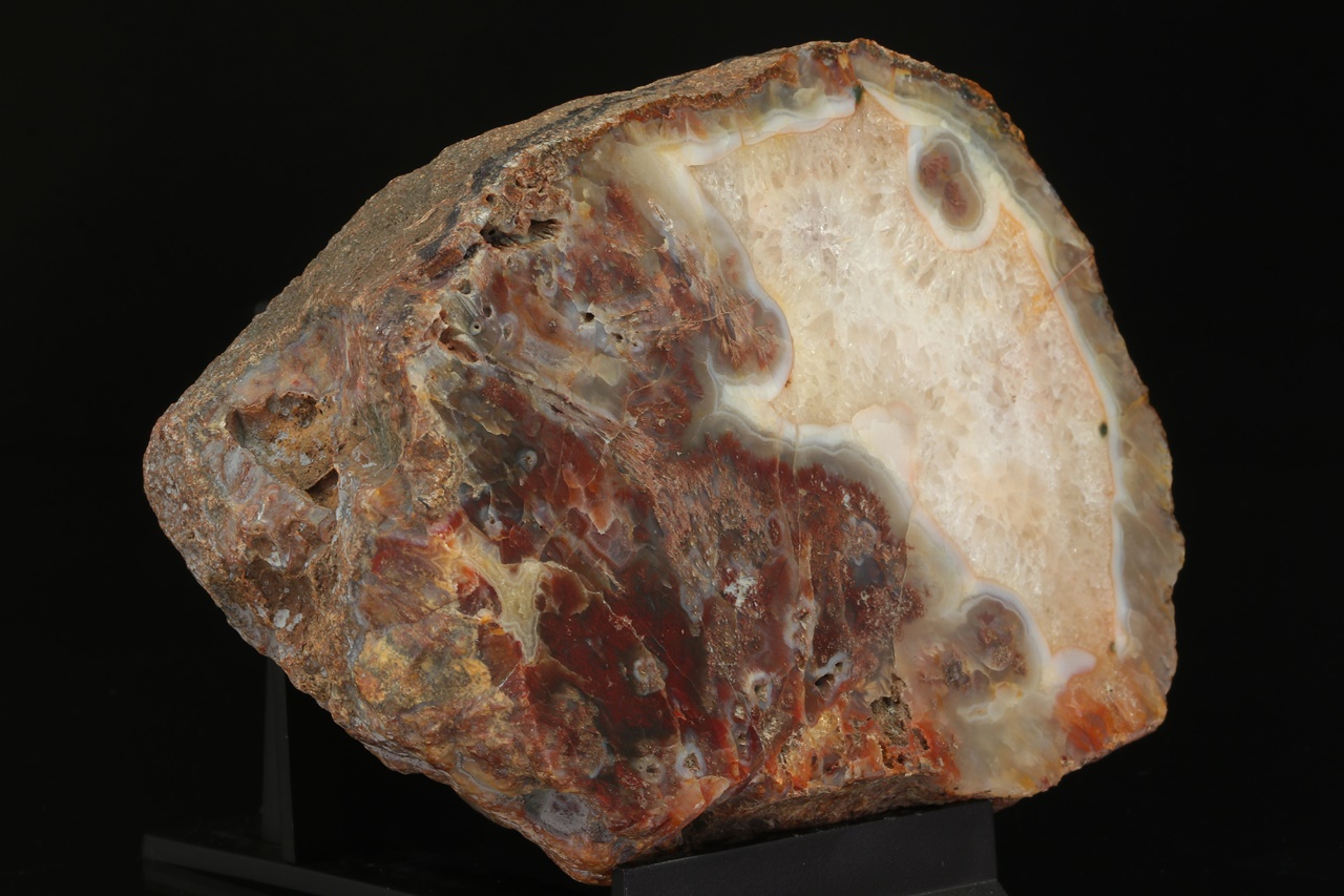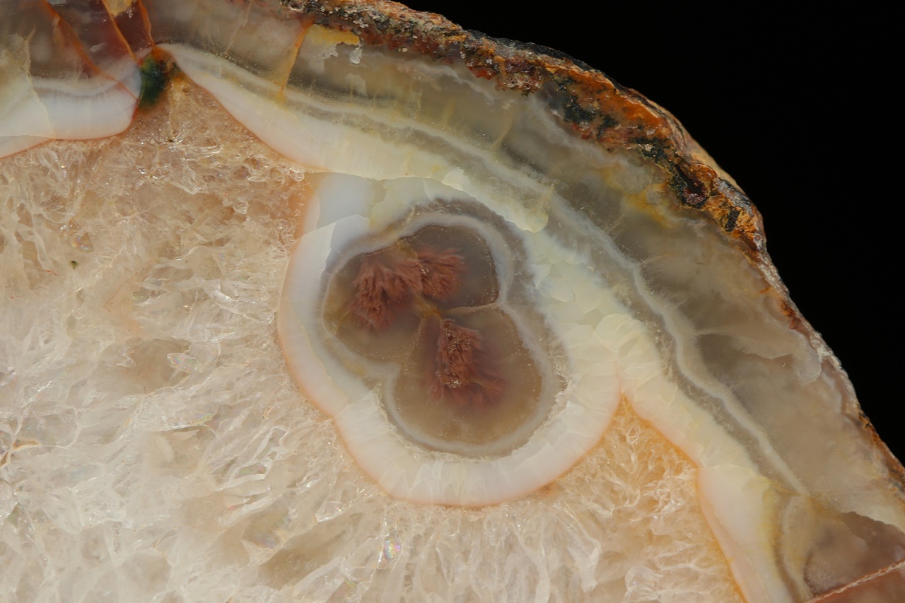 Achát mit einer schön gewachsenen dendritischen Zeichnung und einem oberen Teil, der mit kristallinem Quarz gefüllt ist.