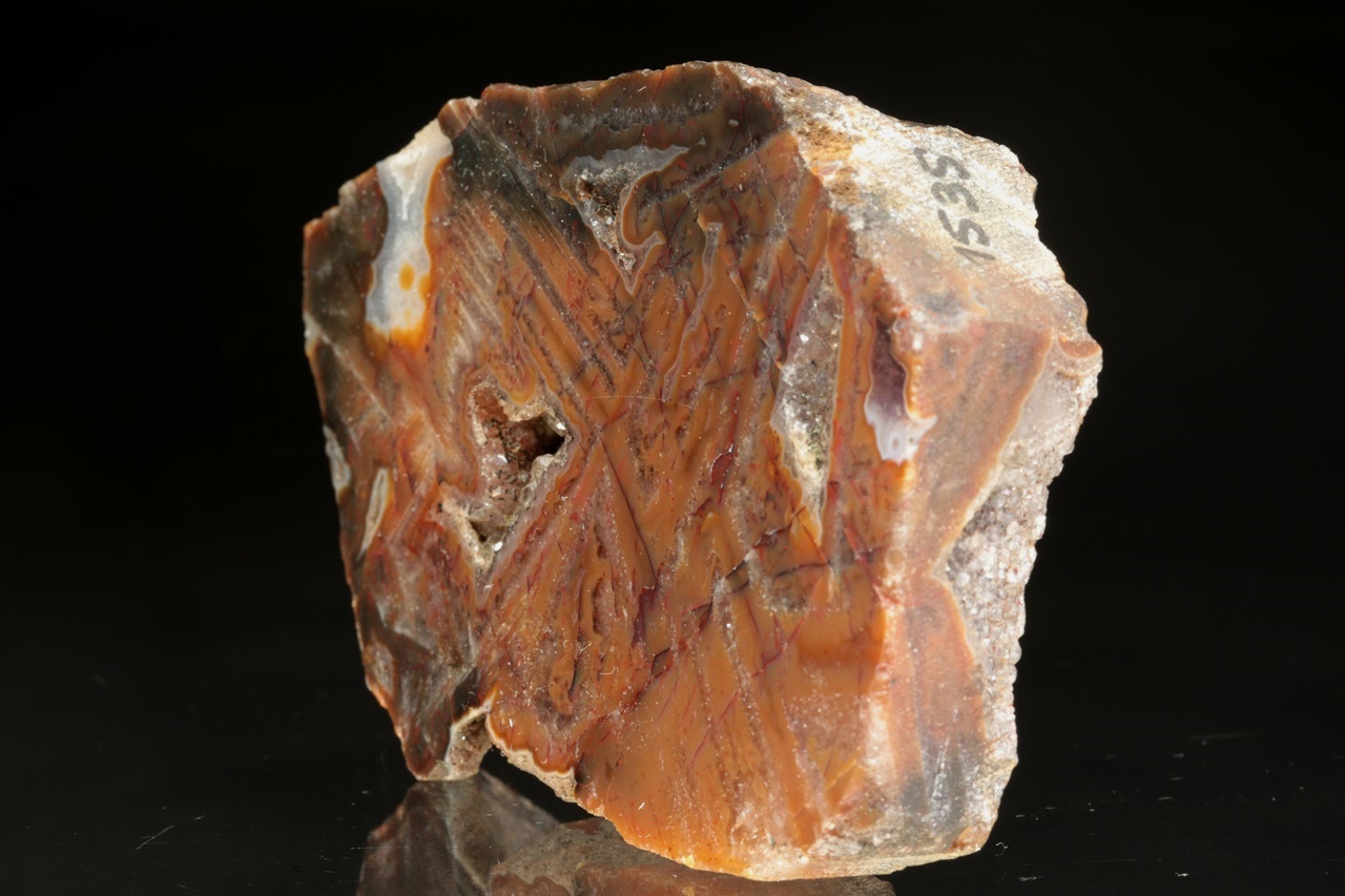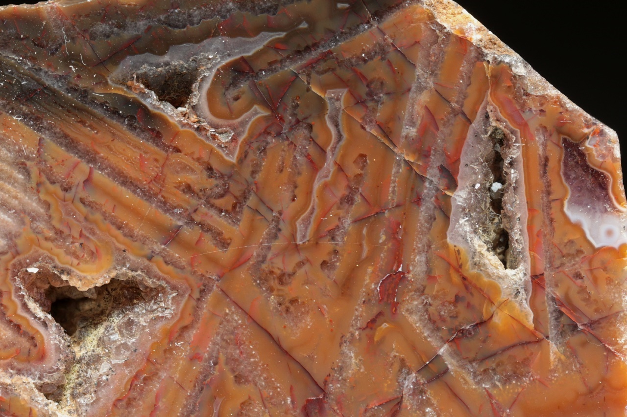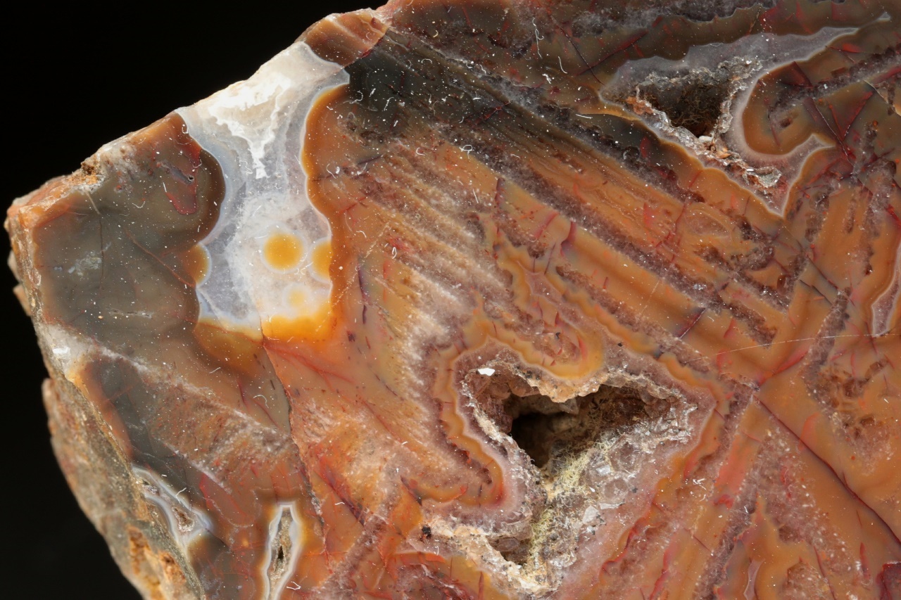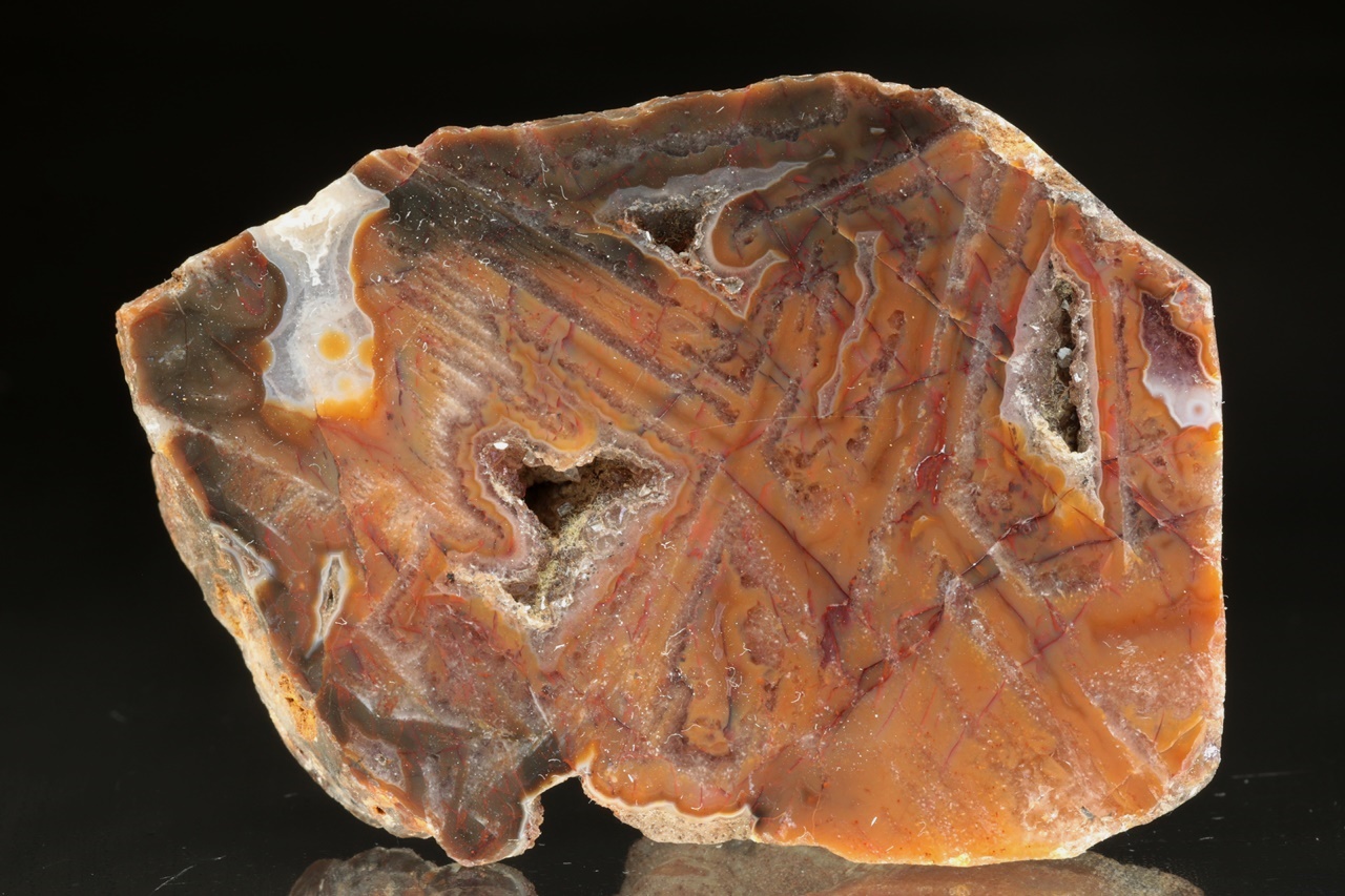 Leštěný achát s ortogonální kresbou s křemennými dutinami ze známé krušnohorské lokality.