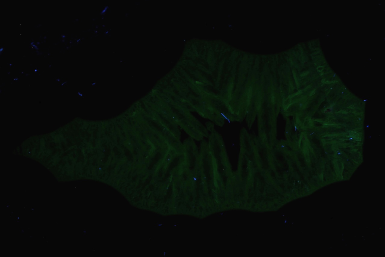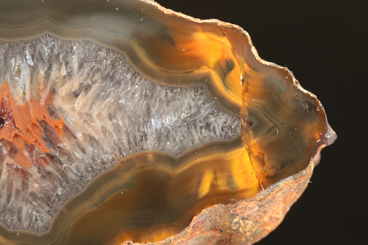Polierte Stufe des argentinischen Achats von dieser Lokalität, bekannt als „Kondor Achat“. Die Stufe leuchtet unter UV-Licht .