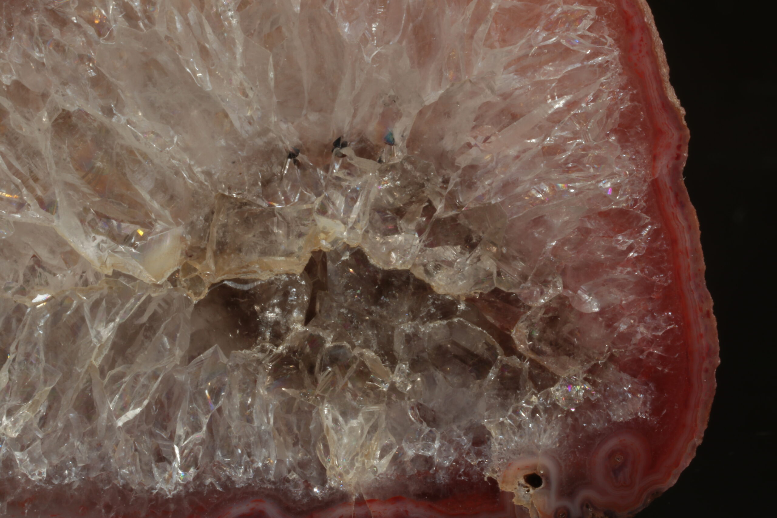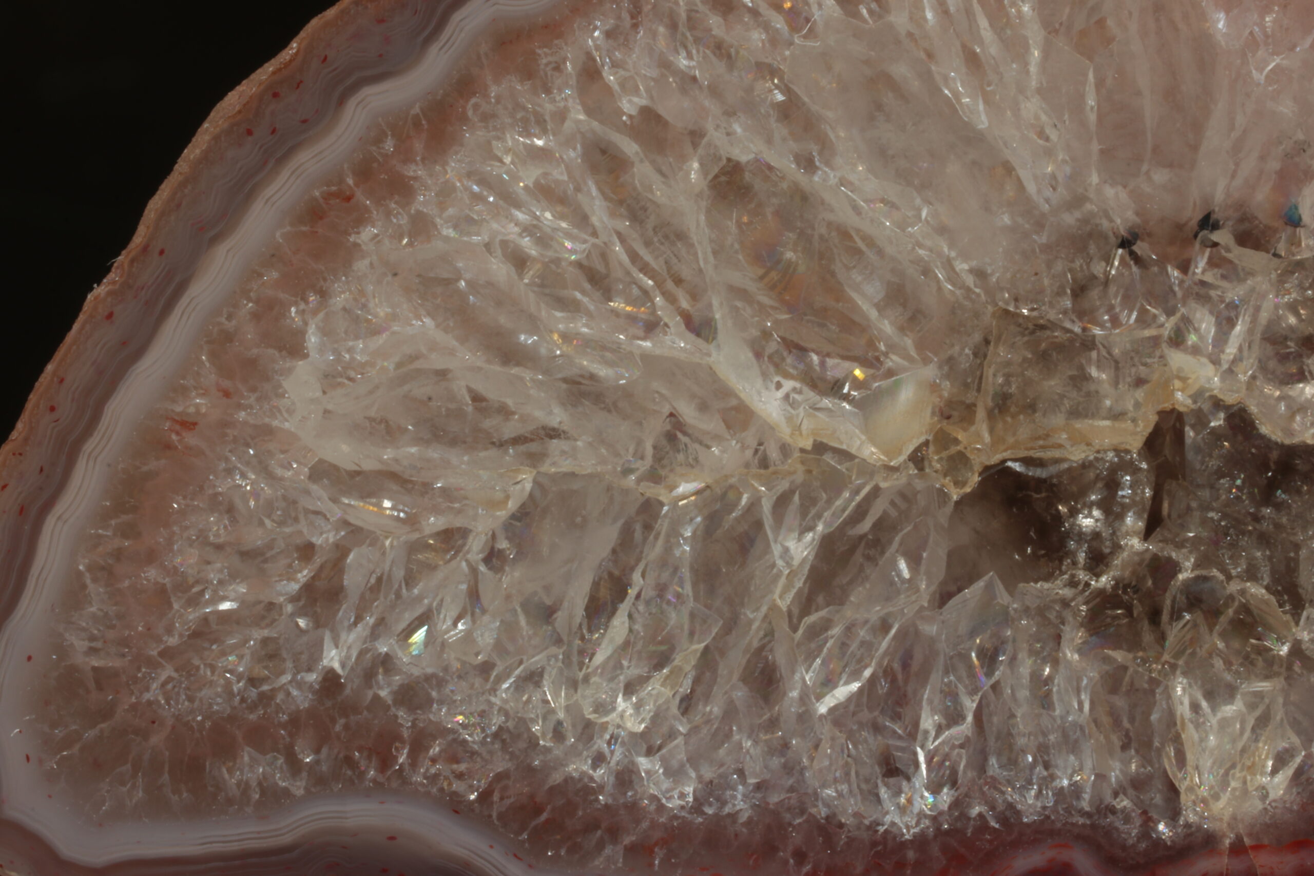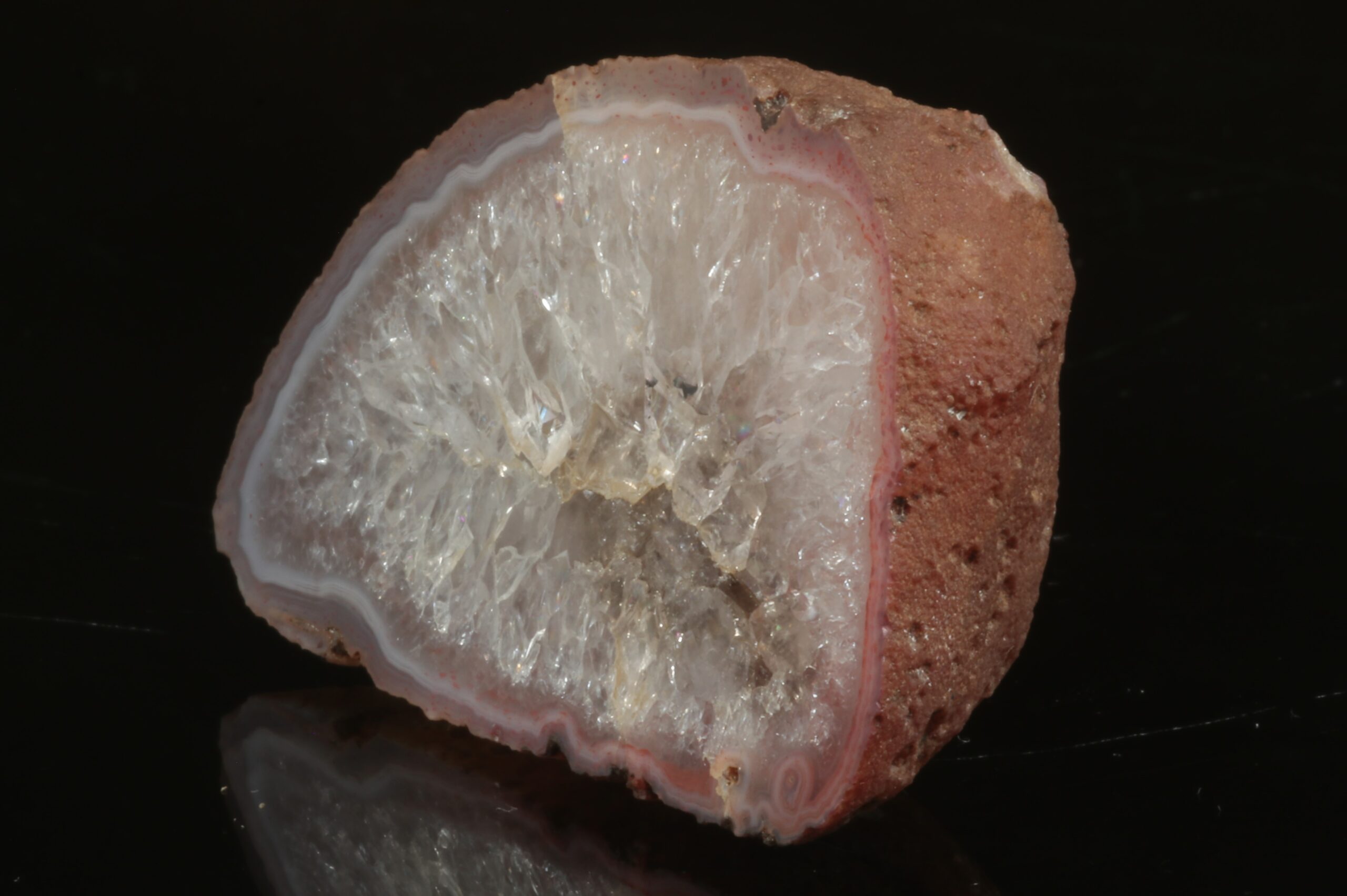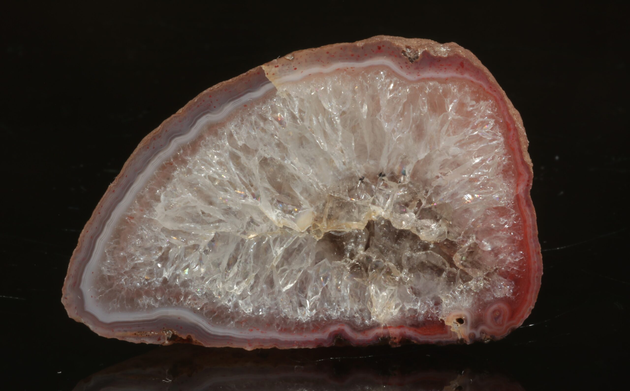 Perfekte Hälfte eines Achatsamens von der Lokalität Levín. Der Stein hat ein schönes Muster mit einem Überwiegen von Křišťál-Kristallen, die von Achat umgeben sind. Die Probe ist auf einer Seite poliert und steht auf einer Unterlage ohne Ständer.