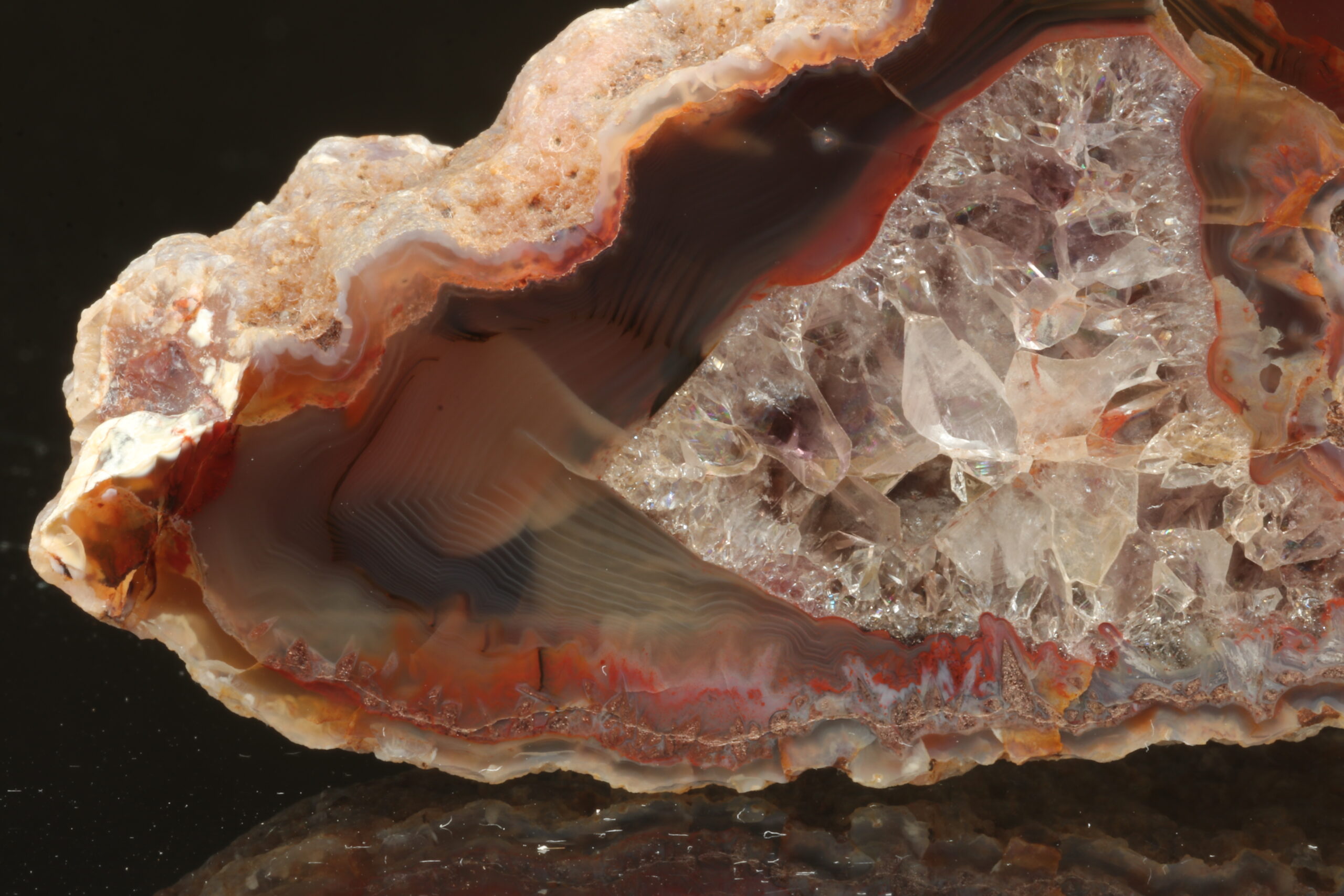 Achatprobe aus dem Jahr 1994. Der Stein hat am Rand eine amorphe Zeichnung und der zentrale Teil besteht aus Kristallen aus klarem Quarz. Die Vorderseite der Probe ist poliert. Der Stein steht auf einer Unterlage ohne Ständer. Die Kristalle haben einen hohen Glanz und man kann auch einen sogenannten Regenbogen beobachten.