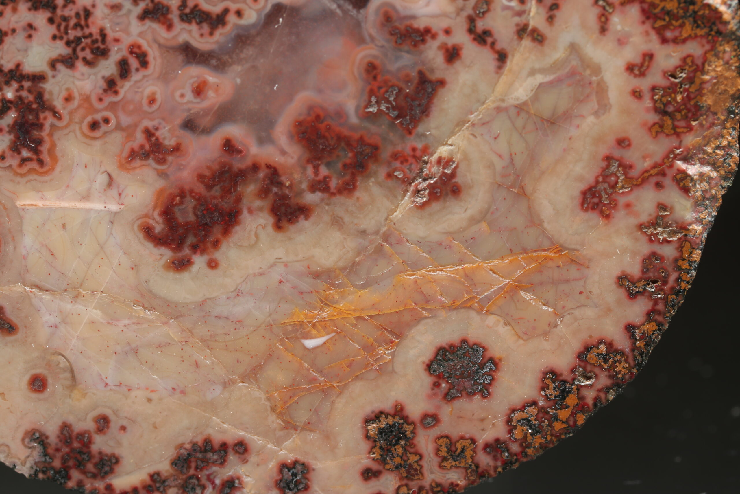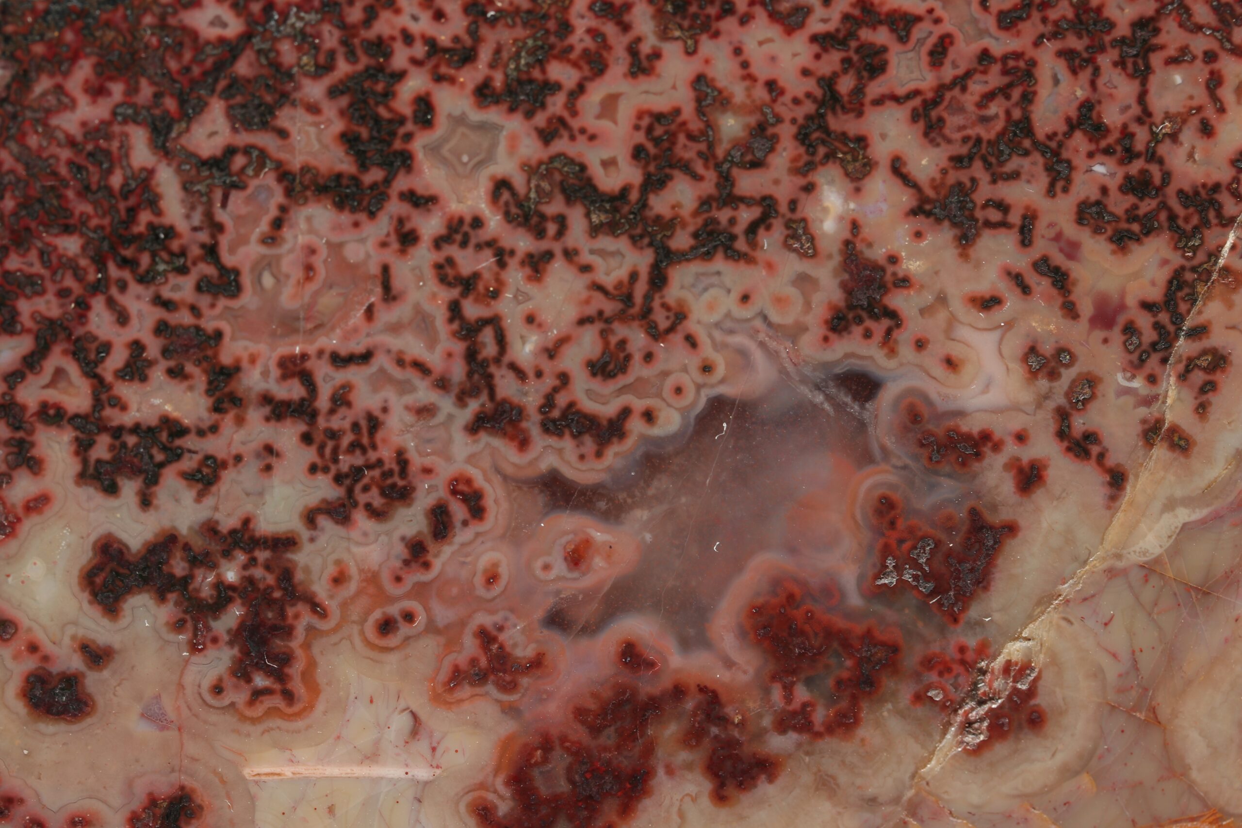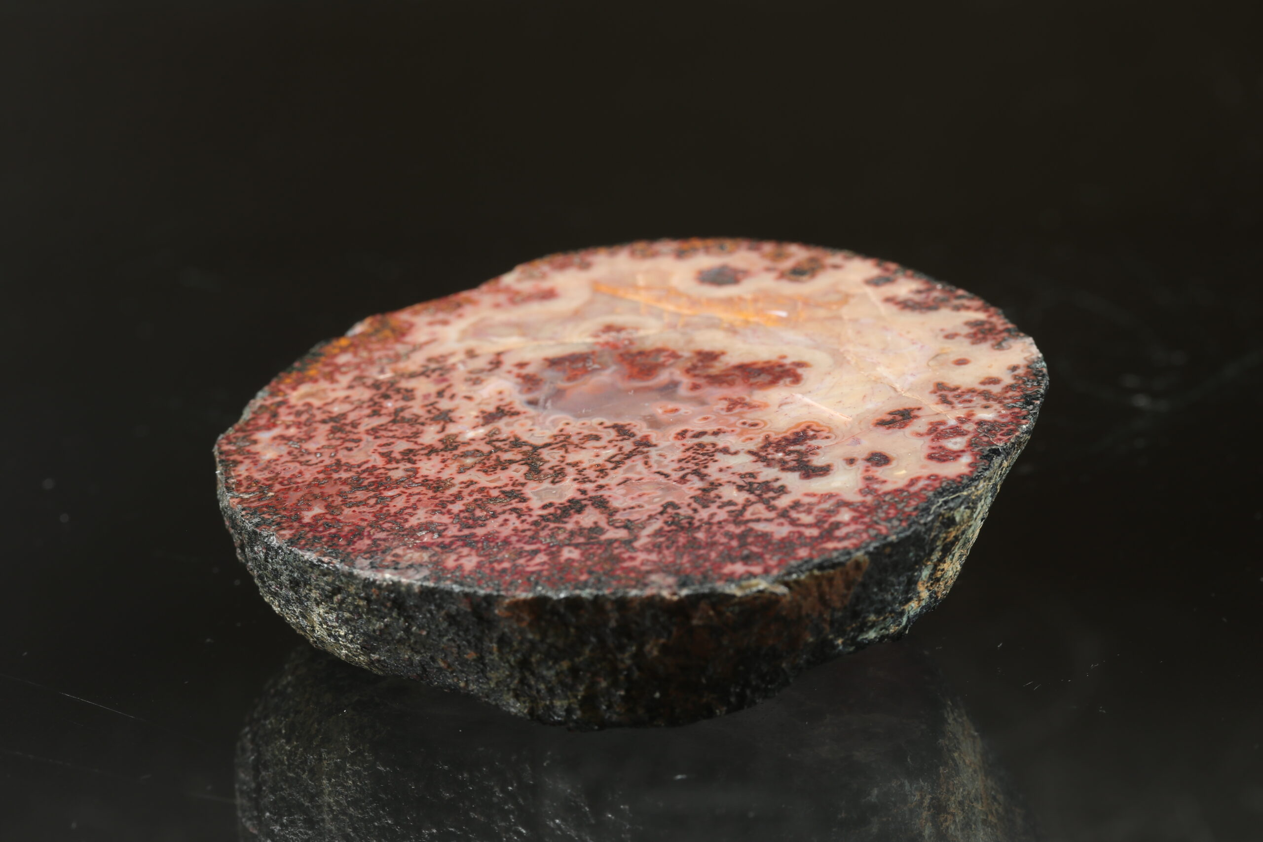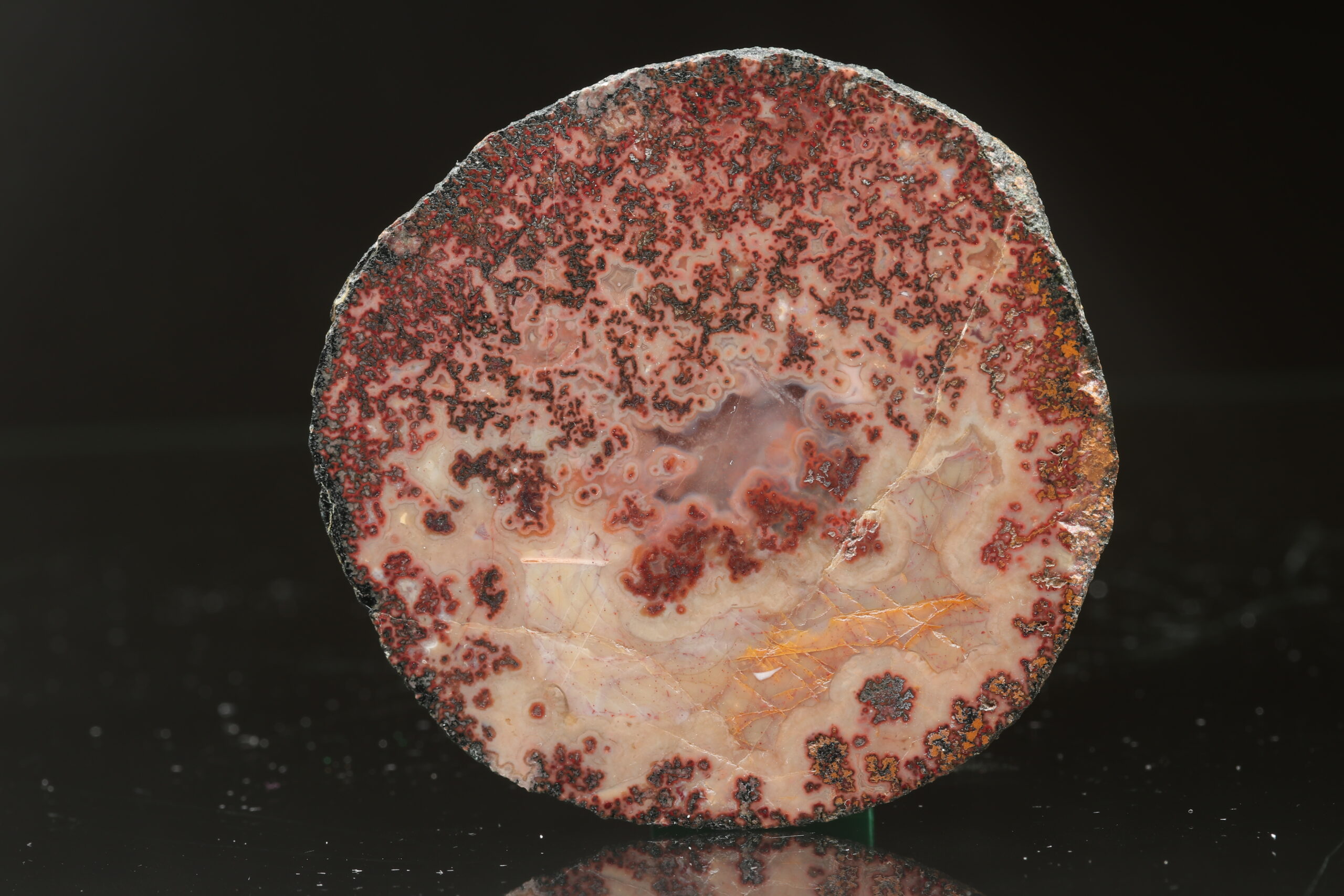 Achátprobe aus dem Fundort Zaječov. Das Muster ist interessant und kreisförmig. Auf einer Seite ist die Probe poliert.