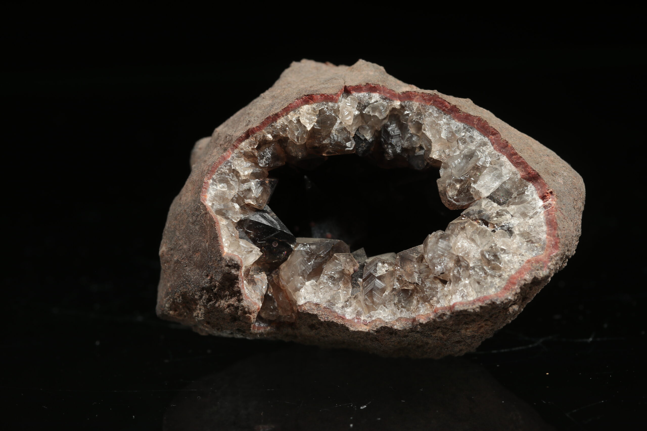 Quarzgeode mit Achatszeichnung. Die Höhlung der Geode ist mit Amethystkristallen gefüllt.