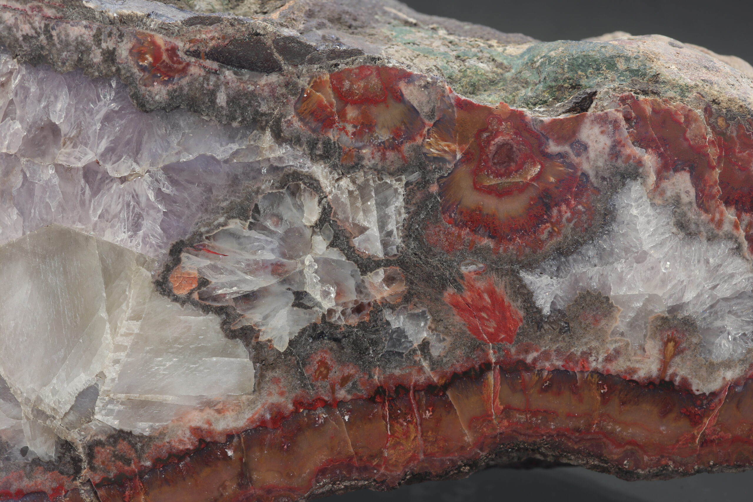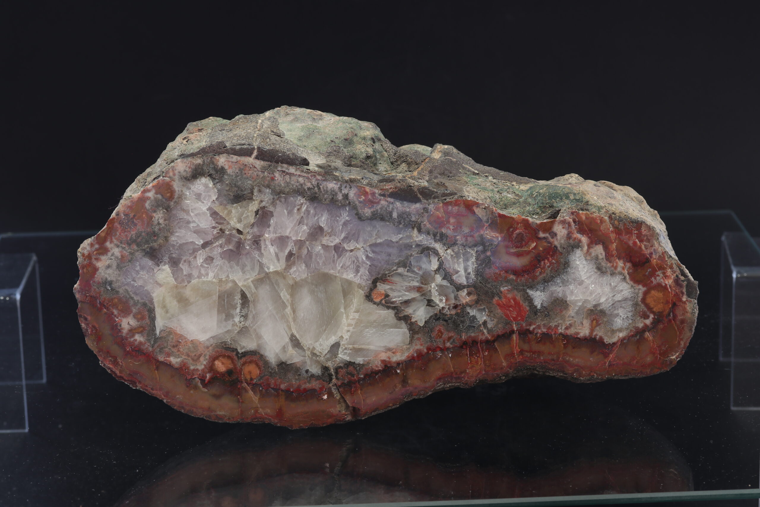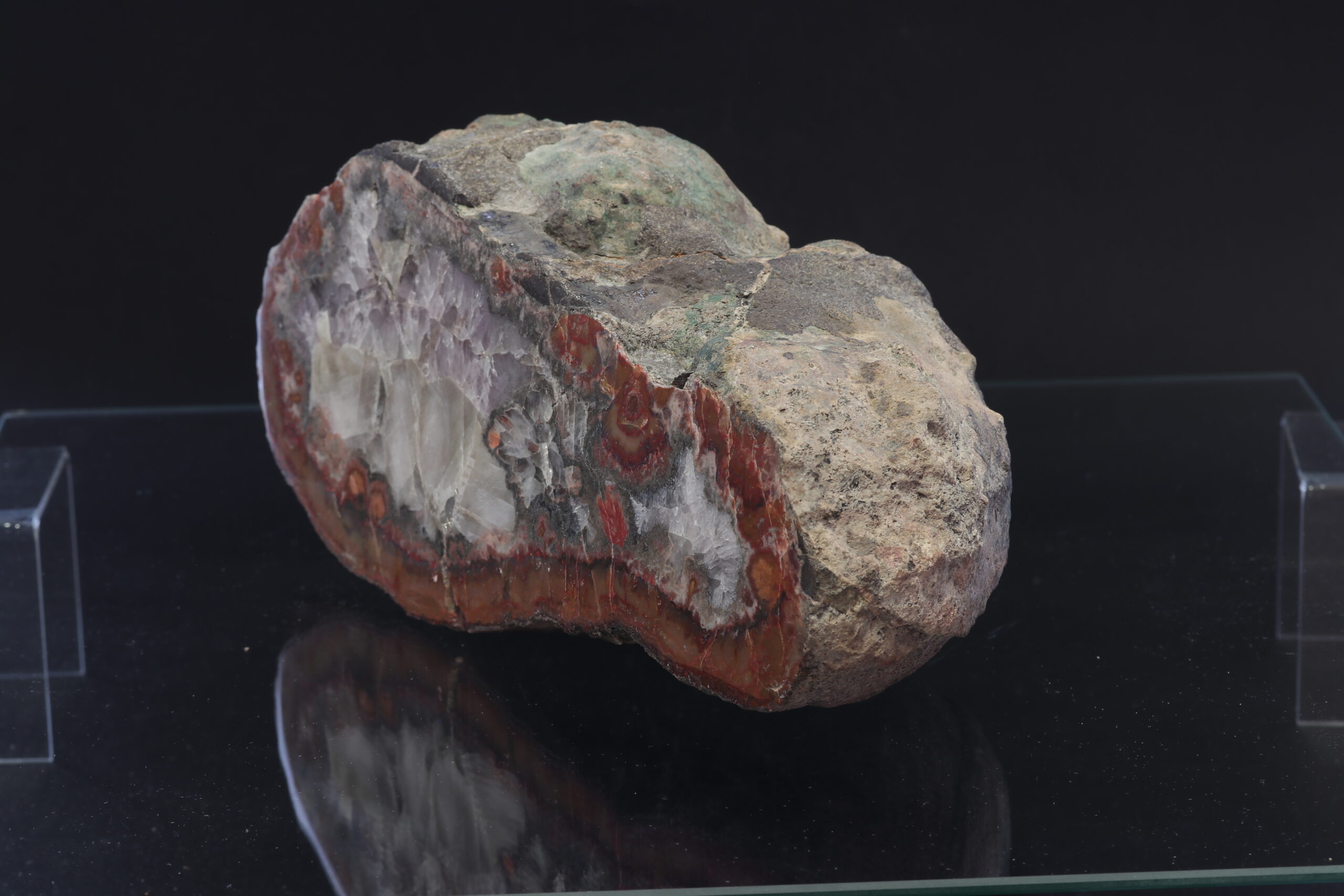 Außergewöhnlich großer Achát aus der Lokalität Železnice. Das Muster zeichnet sich durch seinen Glanz, die perfekte Form und die abwechslungsreiche Zeichnung aus. Das Muster ist aus zwei Teilen zusammengesetzt. Das Muster wurde im Jahr 1999 gefunden.