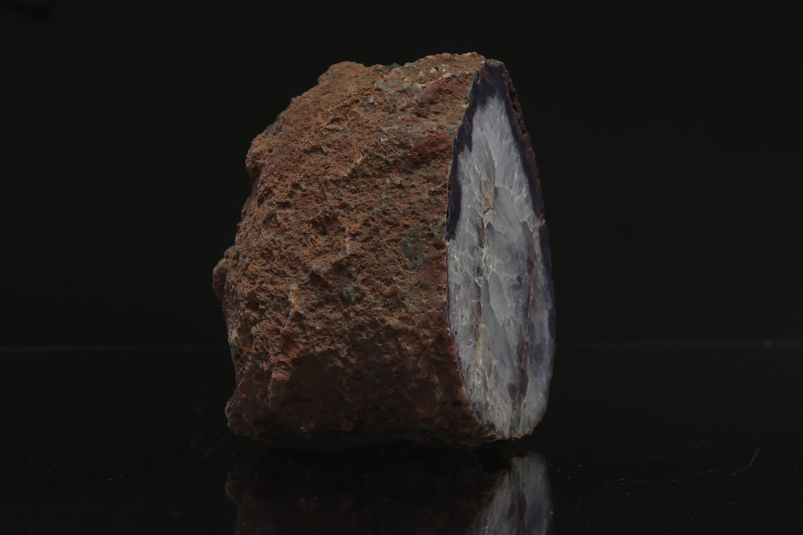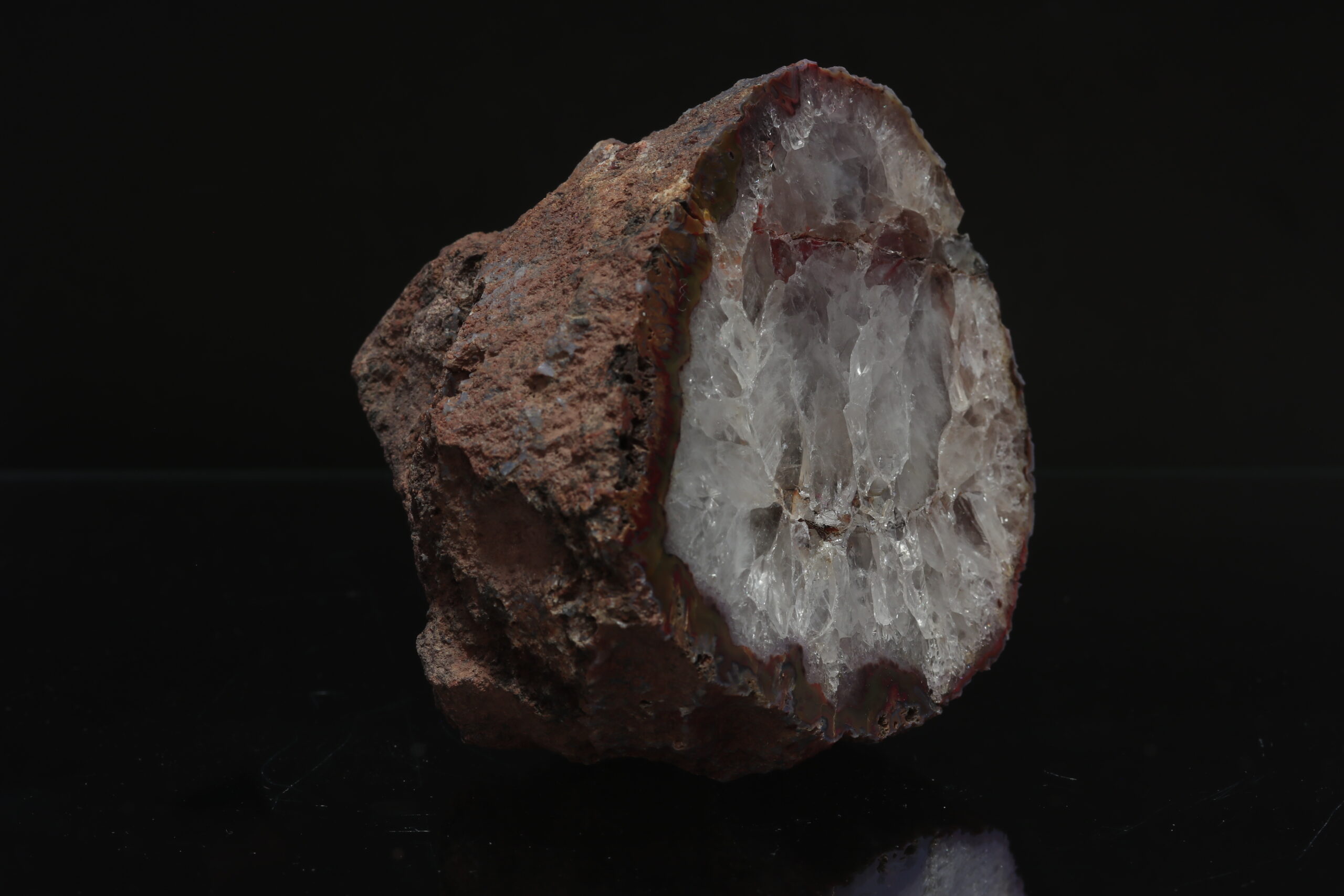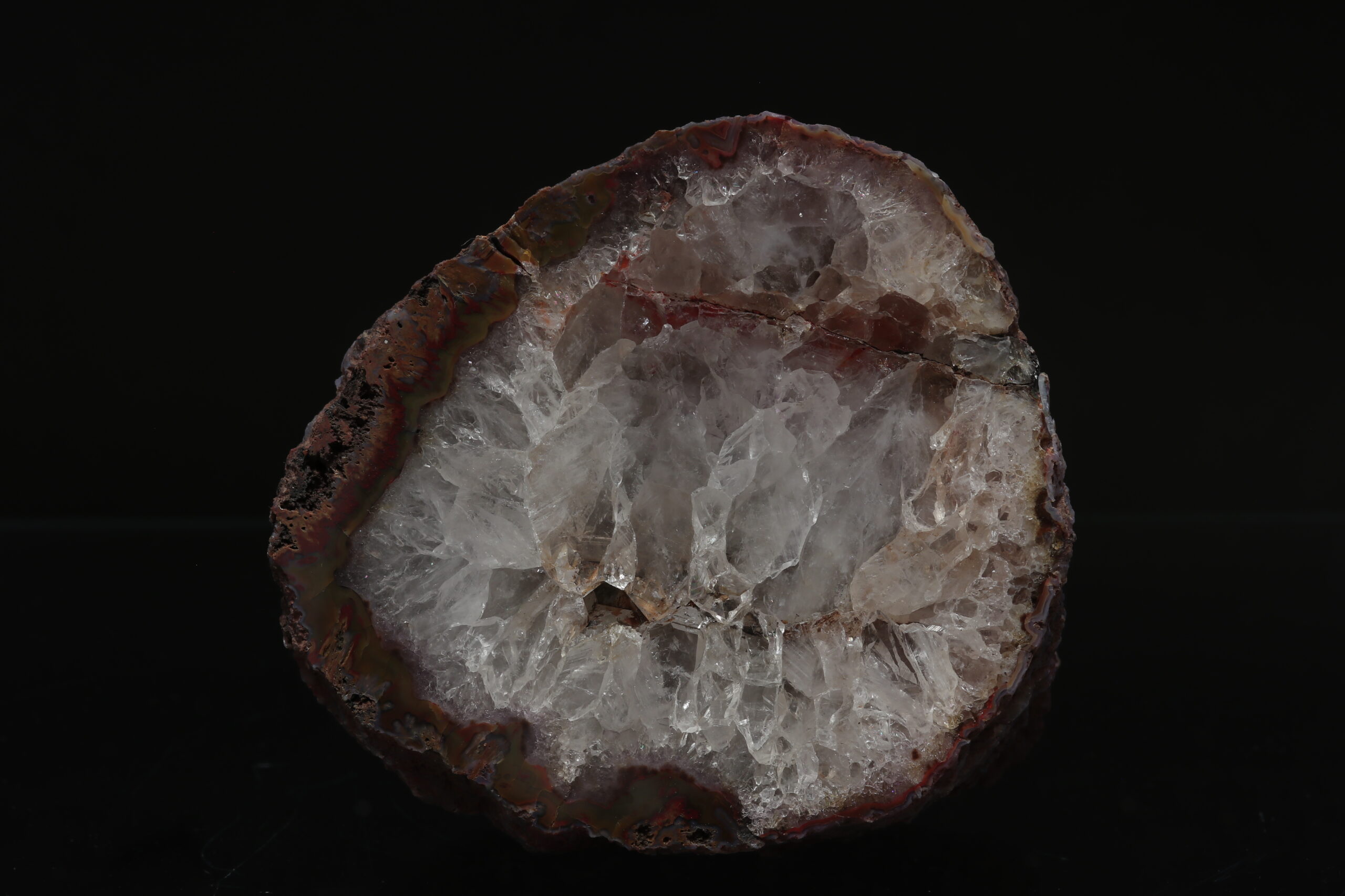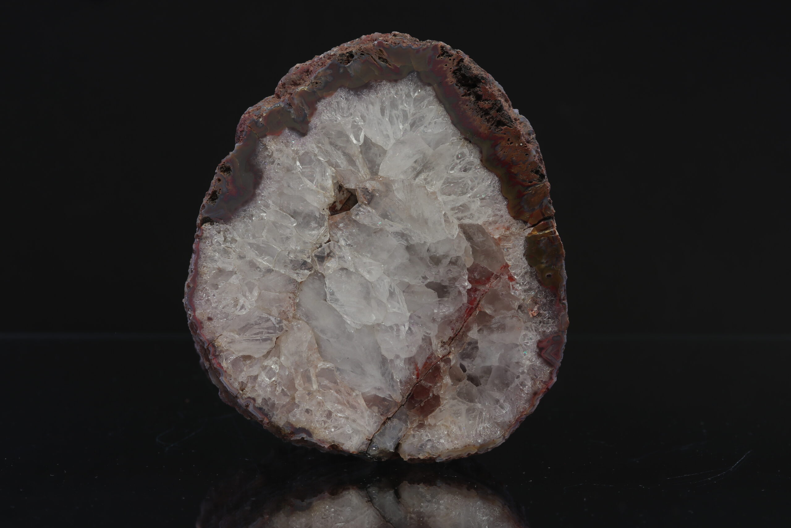 Schönes Achatsample von der Lokalität Kněžnice. Das Muster besteht auch aus Kristallen von Kristall. Das Sample steht eigenständig. Das Sample wurde im Jahr 1990 gefunden.