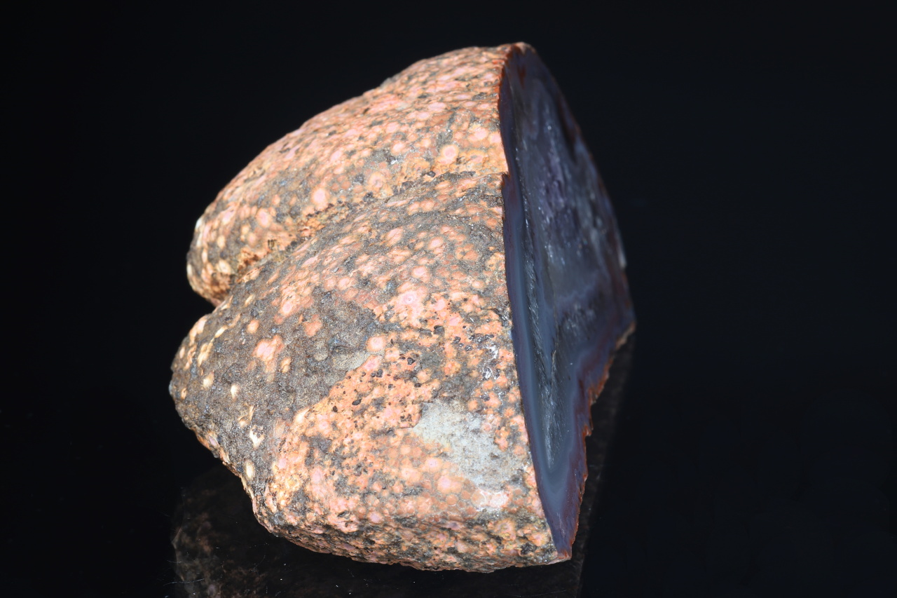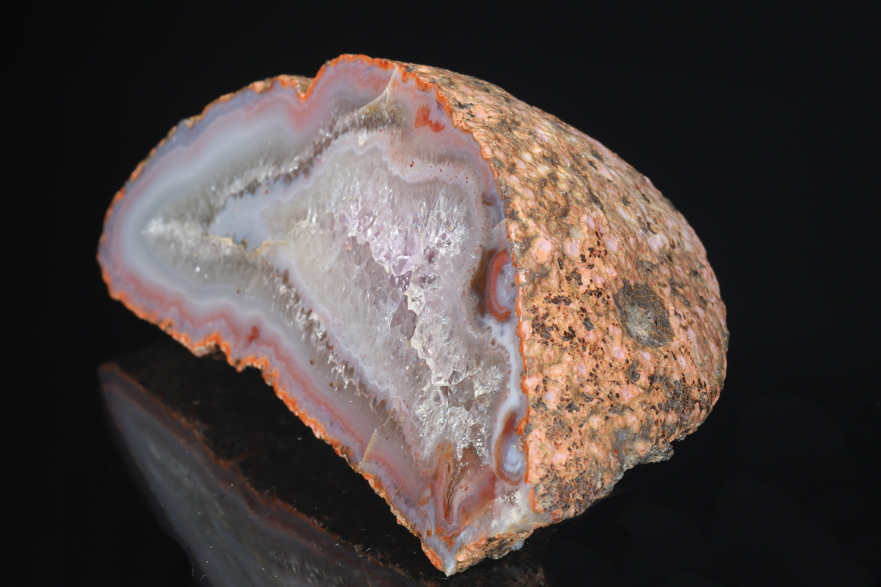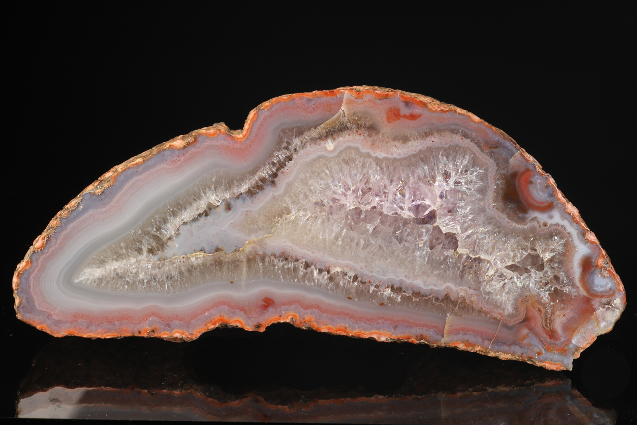 Schönes Exemplar einer komplett polierten Hälfte einer Geode mit Achat-Rand, der in hellen Amethyst übergeht. Das Muster stammt aus der berühmten Fundstelle Rašovka bei Liberec.