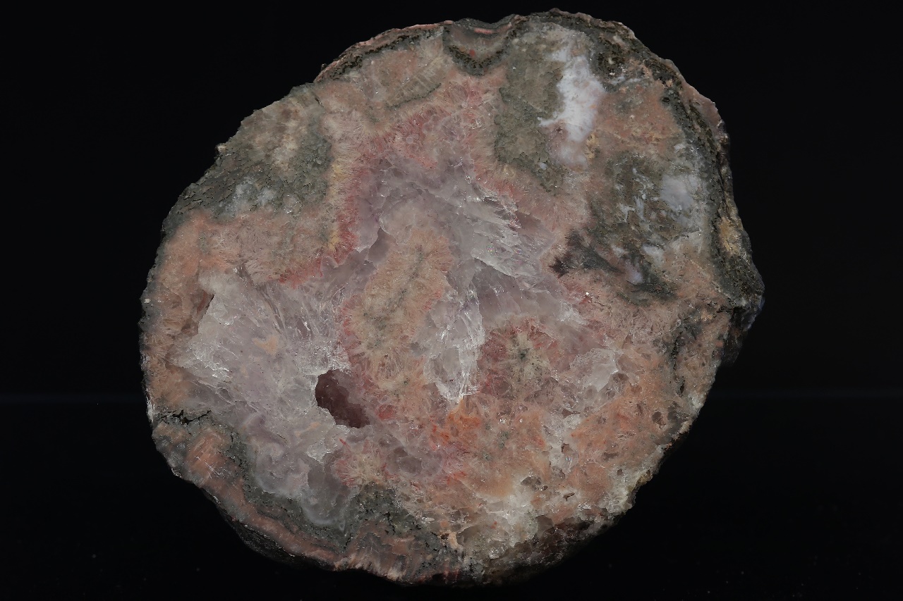 Außergewöhnlich großer Achat aus dem Frýdštejn-Steinbruch mit einer 1,5 cm großen Höhle mit leicht violett gefärbten Quarzkristallen.