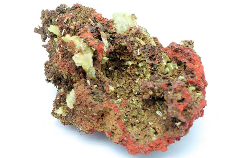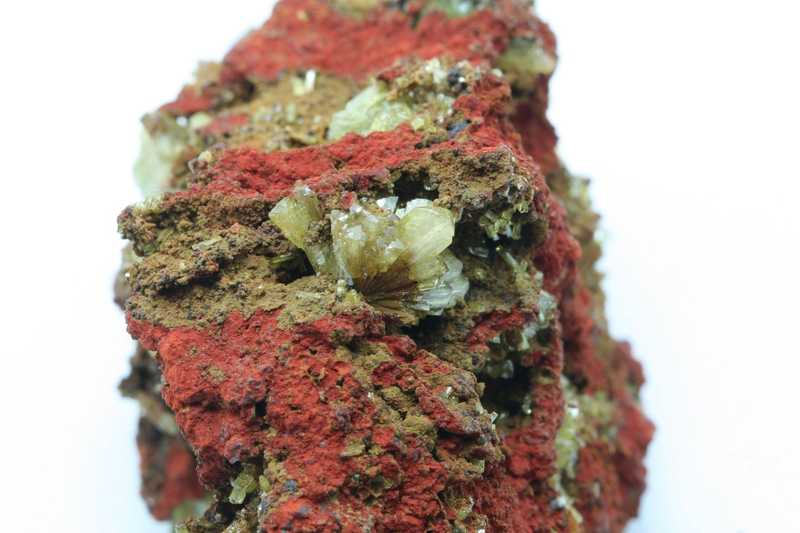 Klassisches Beispiel von Adamit aus der Lokalität Mapimi, Mexiko. Büschelige Kristalle von grünlich-orangefarbenem Adamit.