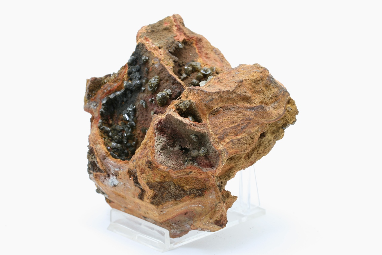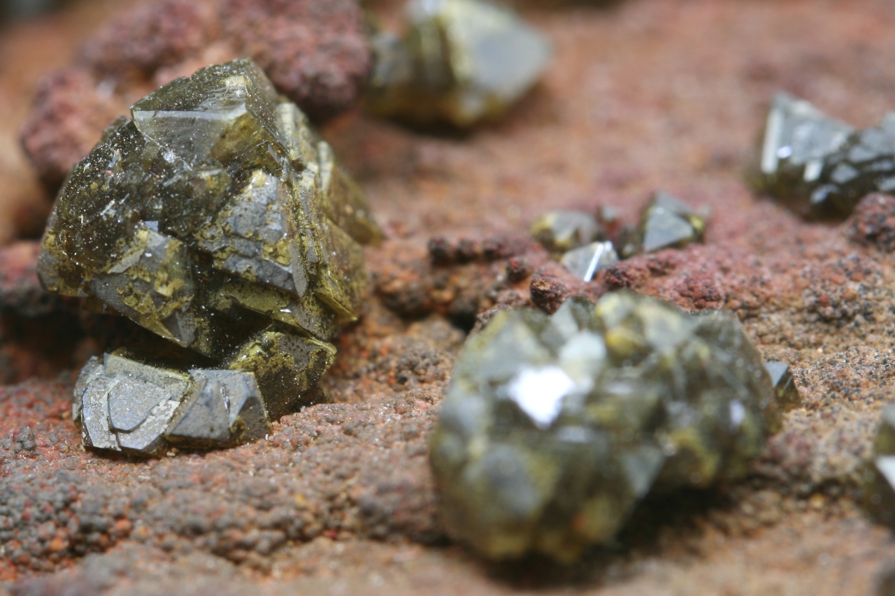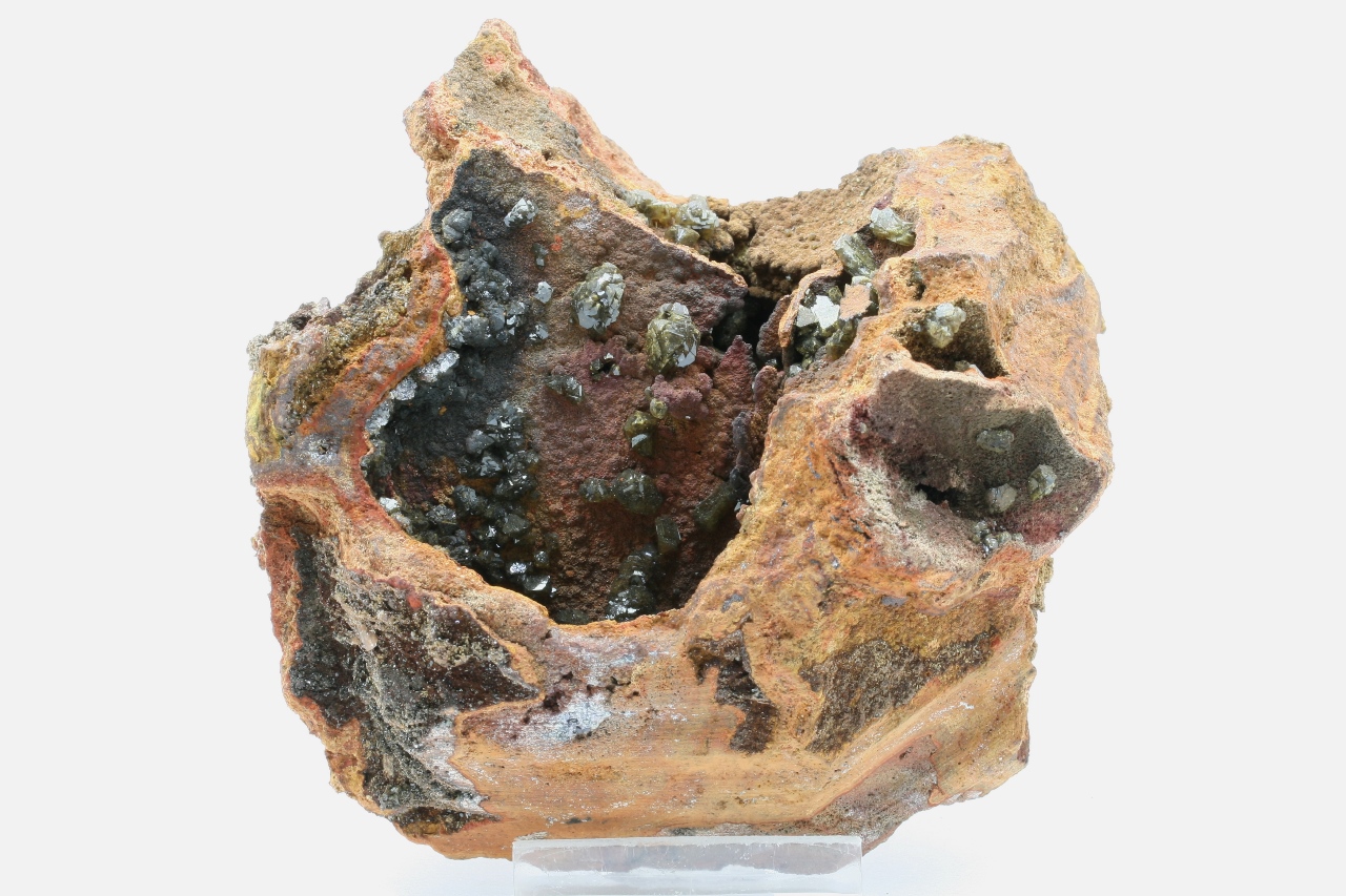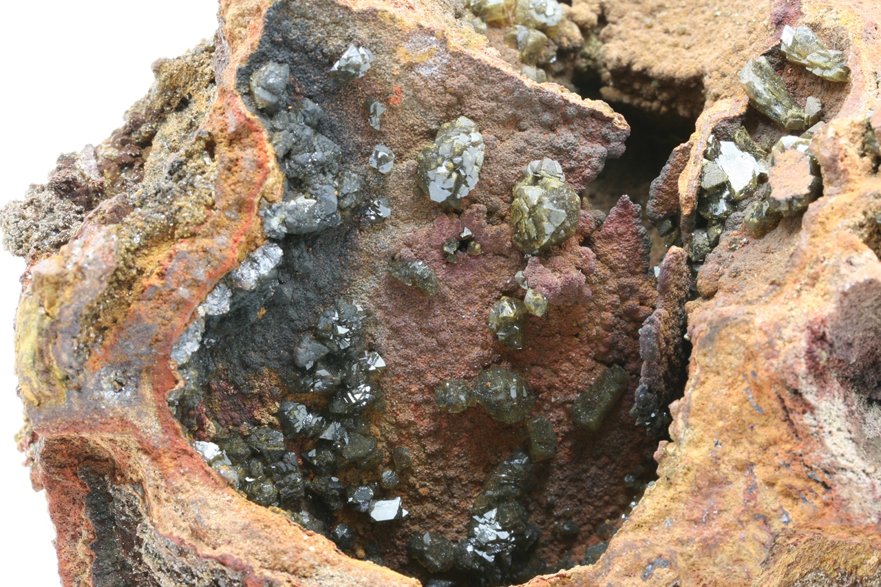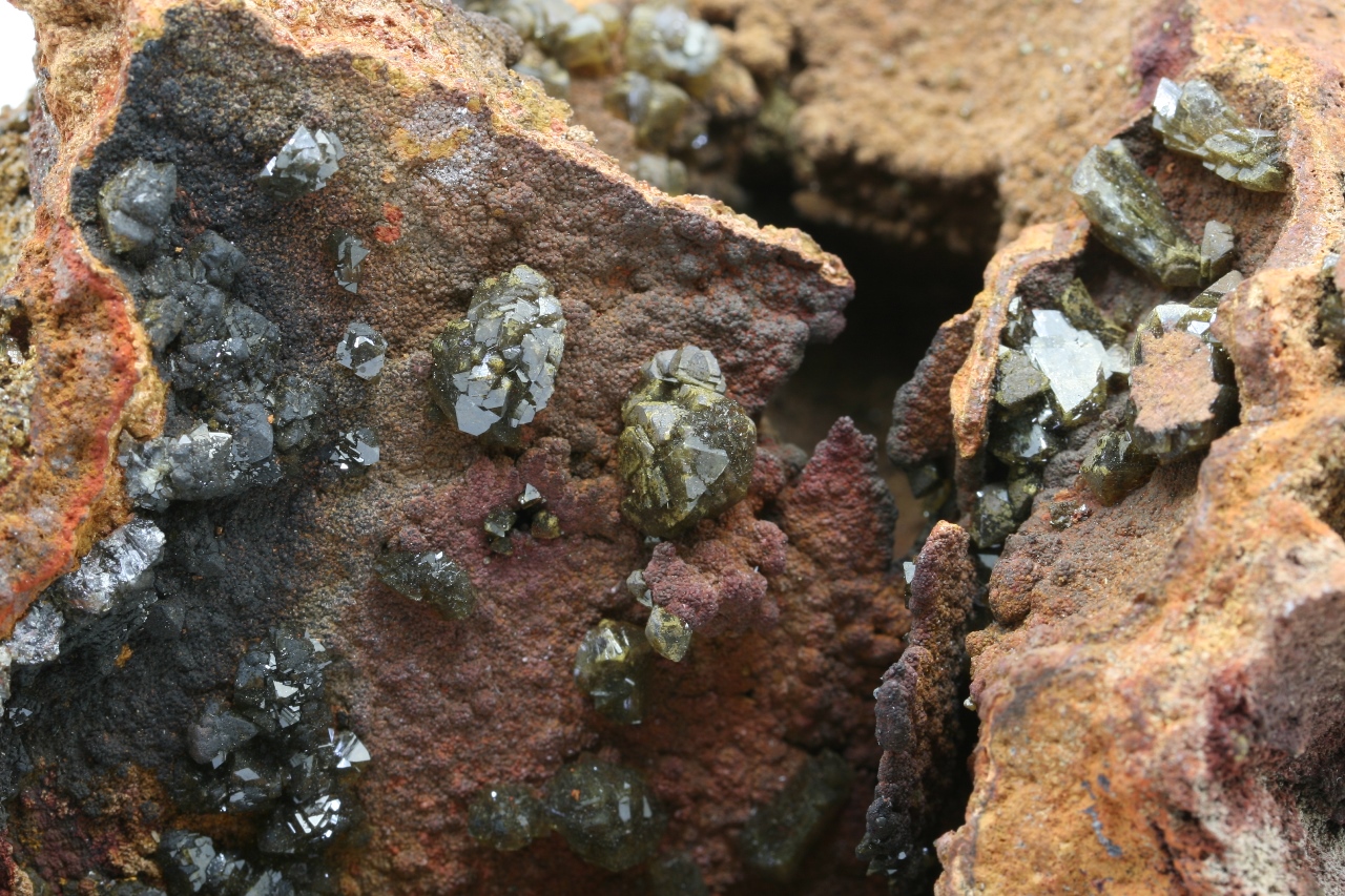 Dunkelgrüne, glänzende Kristalle und Cluster von Zinkarsenat, die in einer Limonithöhle gewachsen sind. Die Abmessungen der Höhle betragen etwa 4 × 5 cm, der größte Cluster ist 8 mm groß .