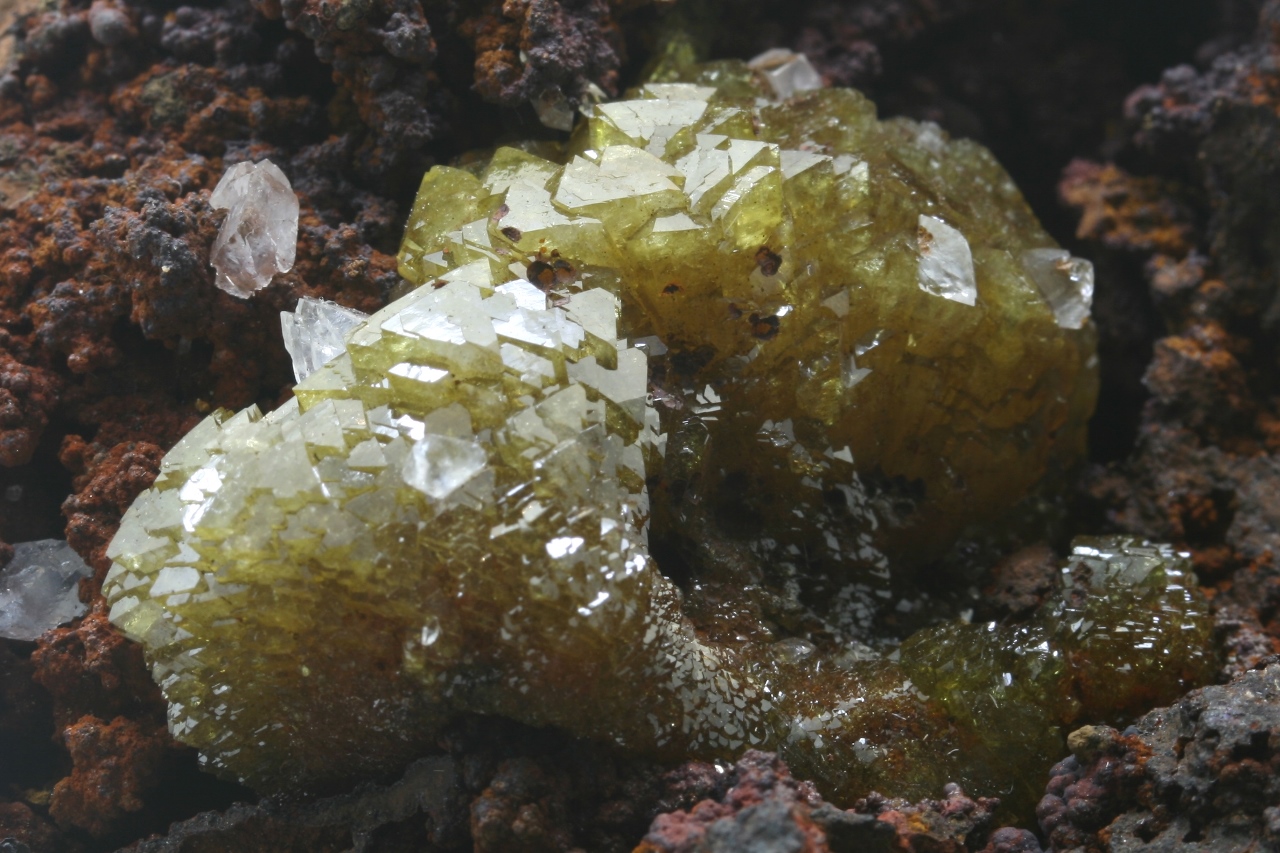 Shluk gelb-grüner Kristalle des Zinkarsenats, 3,5 cm groß, mit weißen Krystallen des Kacitu, gewachsen auf Limonit.