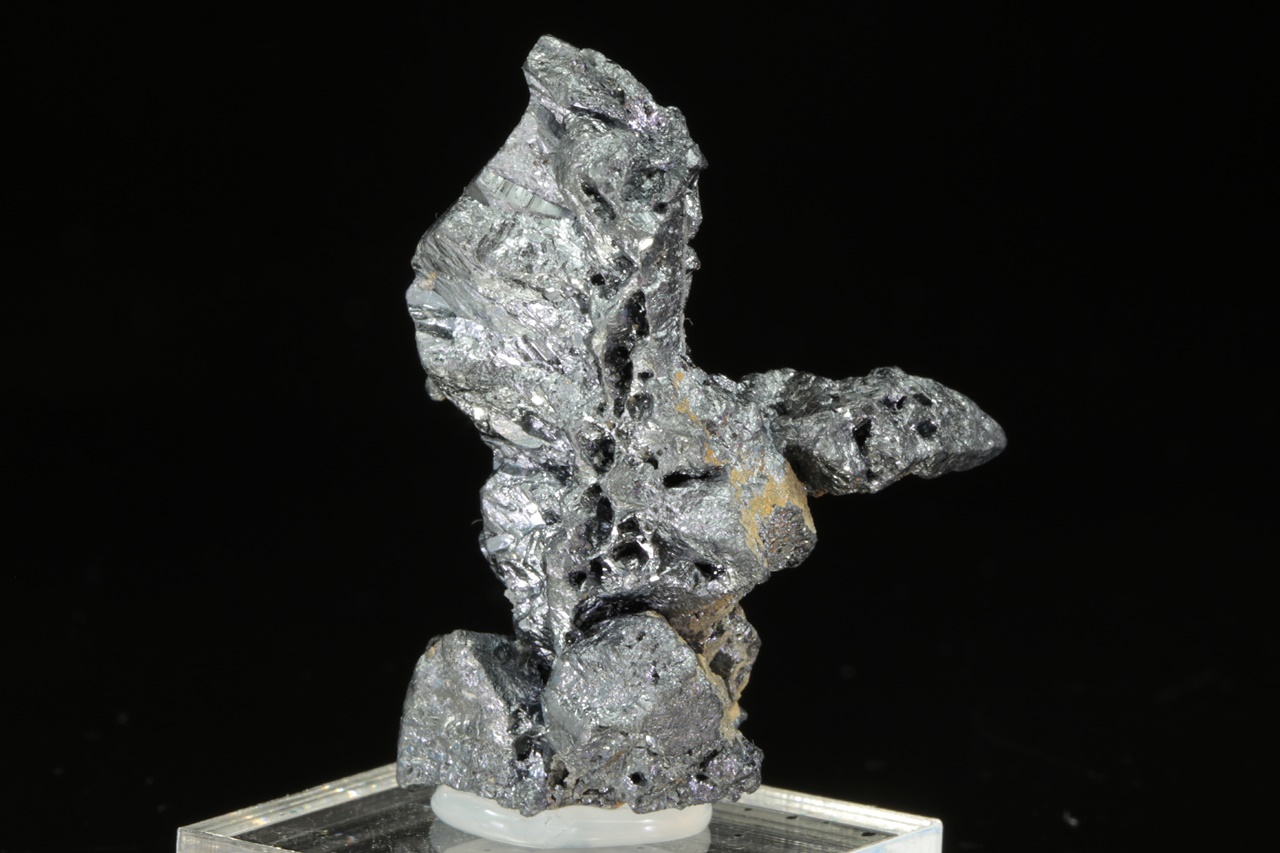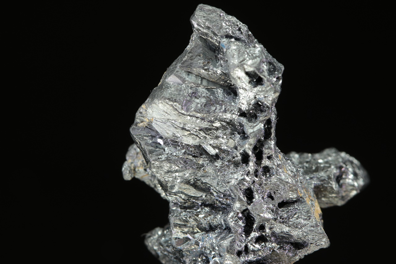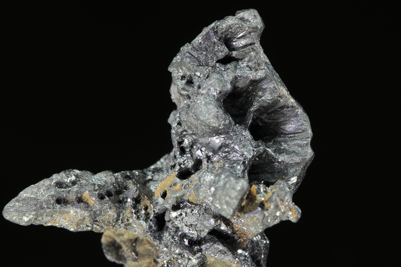 Cluster metallisch glänzender Akantit-Kristalle mit negativen Abdrücken von Kristallen eines nicht näher bestimmten Minerals .