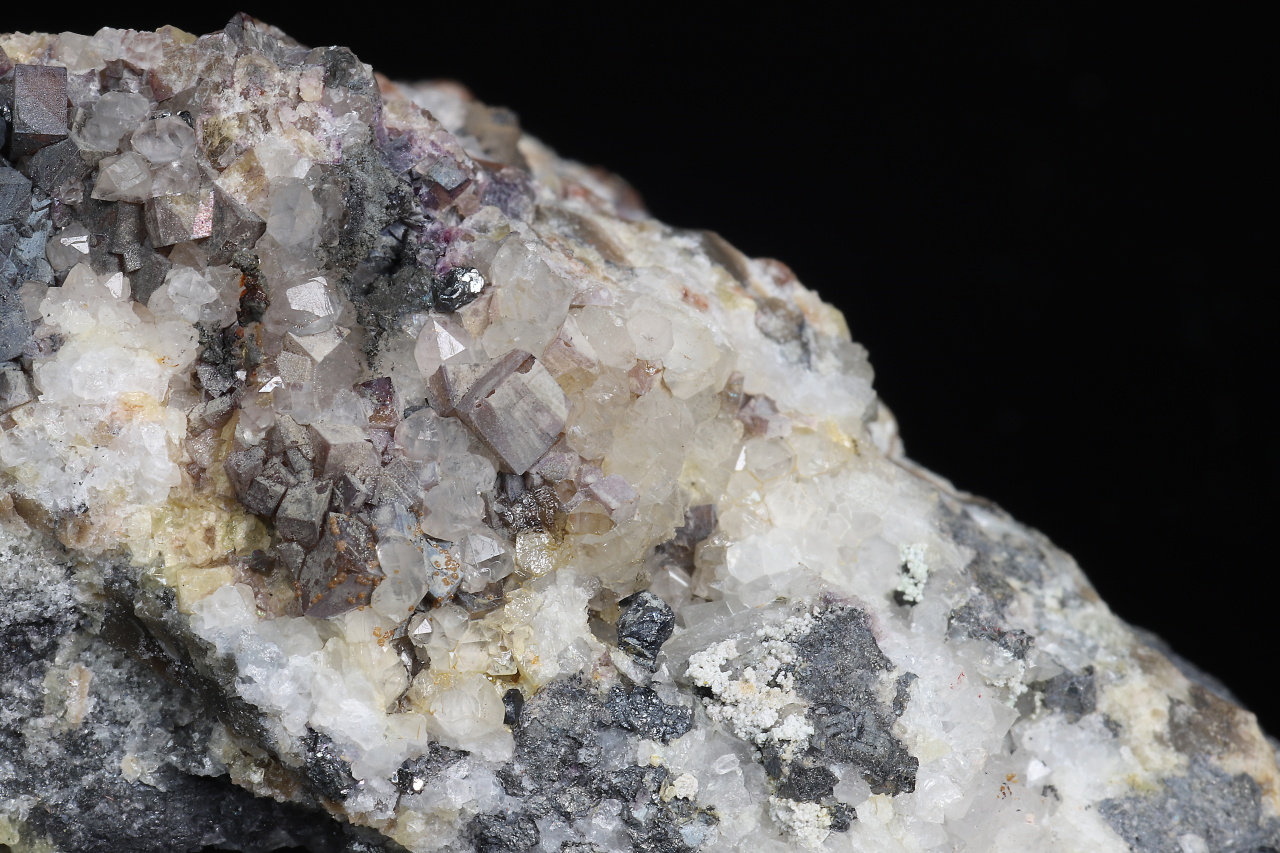 Silbergraue Aggregate und unregelmäßige Akantit-Kristalle bis zu einer Größe von 3-4 mm zusammen mit Würfelkristallen von Fluorit und Kristallen von Quarz. Ein Muster von Silbersulfid auf einer Fluorit-Quarz-Gangart aus der Mine Moldava.