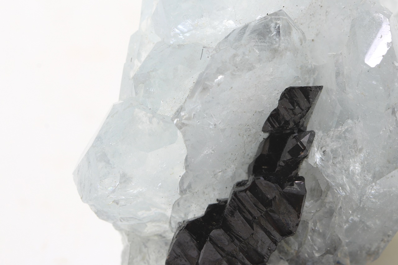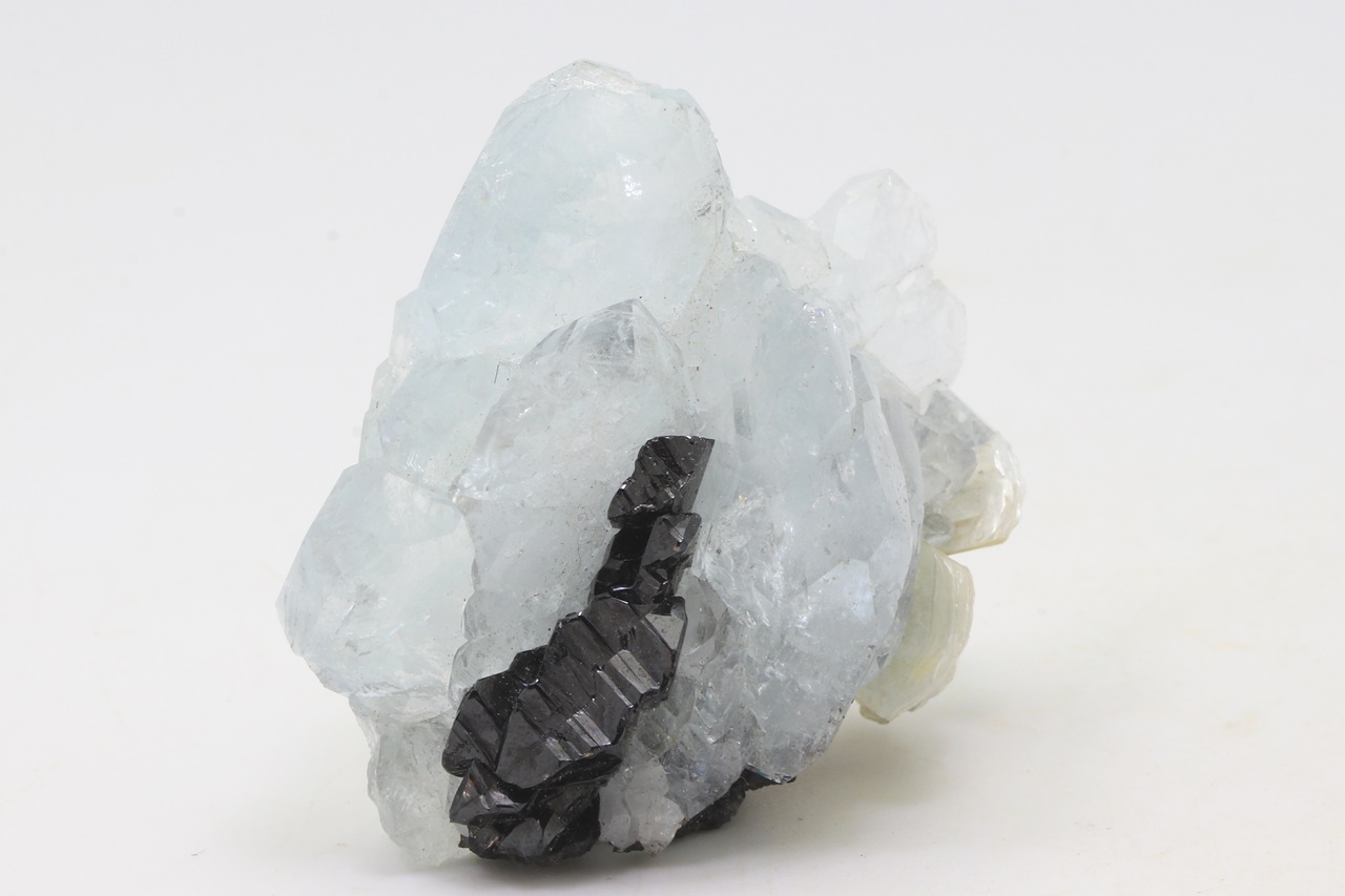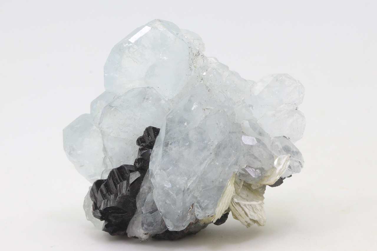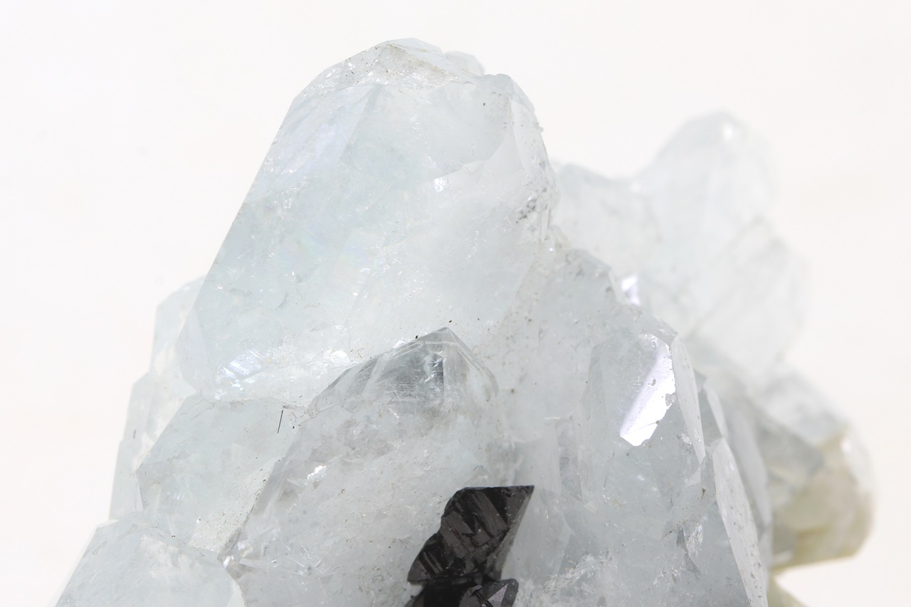 Drúza krystalů světle modrého, dobře omezeného akvamarínu s černým, lesklým kassiteritem. Největší krystal akvamarínu je 27 mm velký.