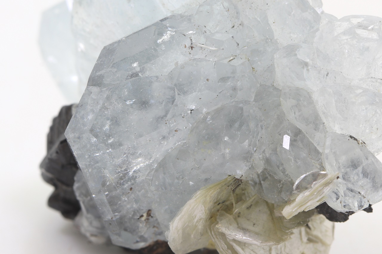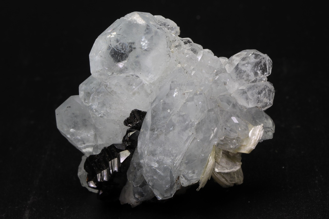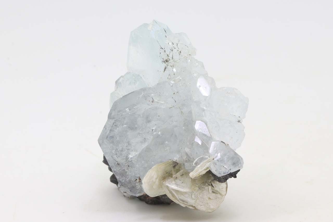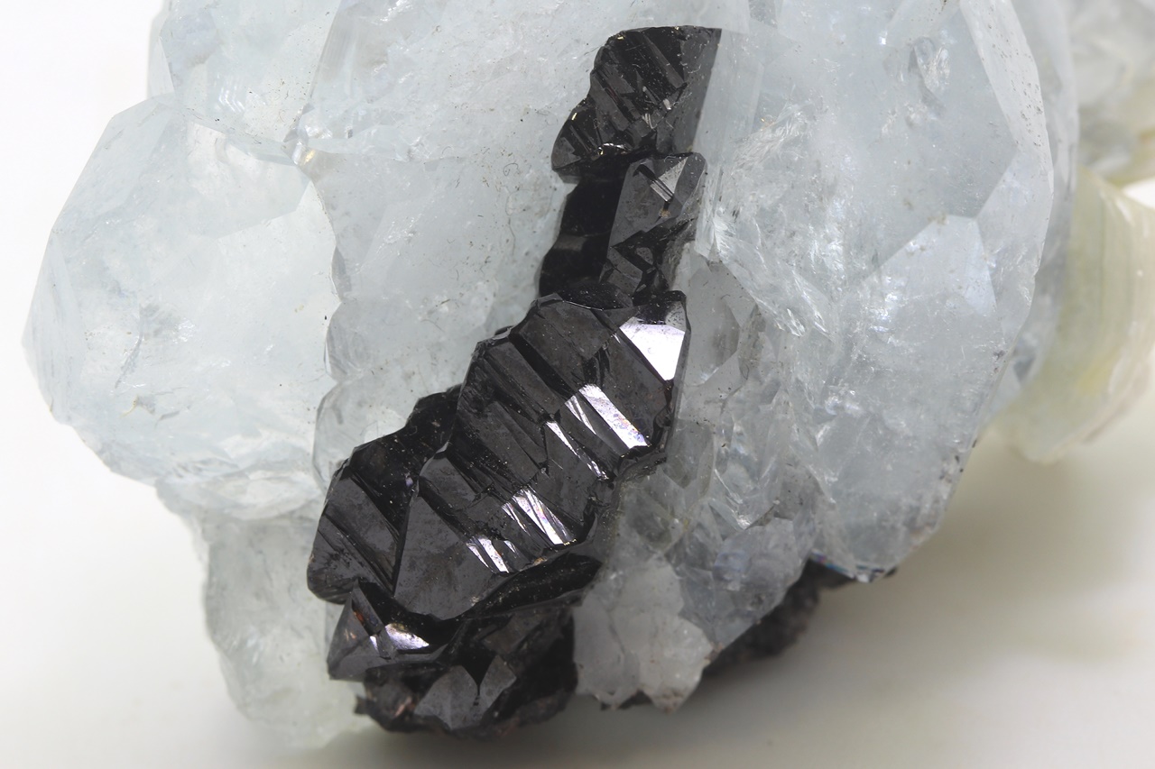 Drúza krystalů světle modrého, dobře omezeného akvamarínu s černým, lesklým kassiteritem. Největší krystal akvamarínu je 27 mm velký.