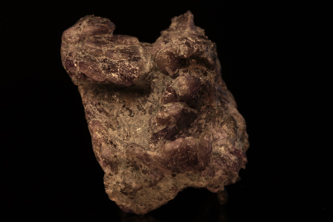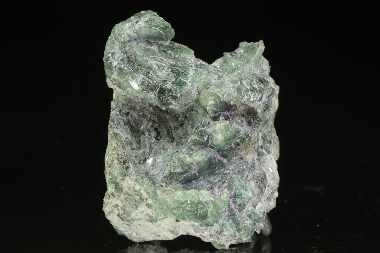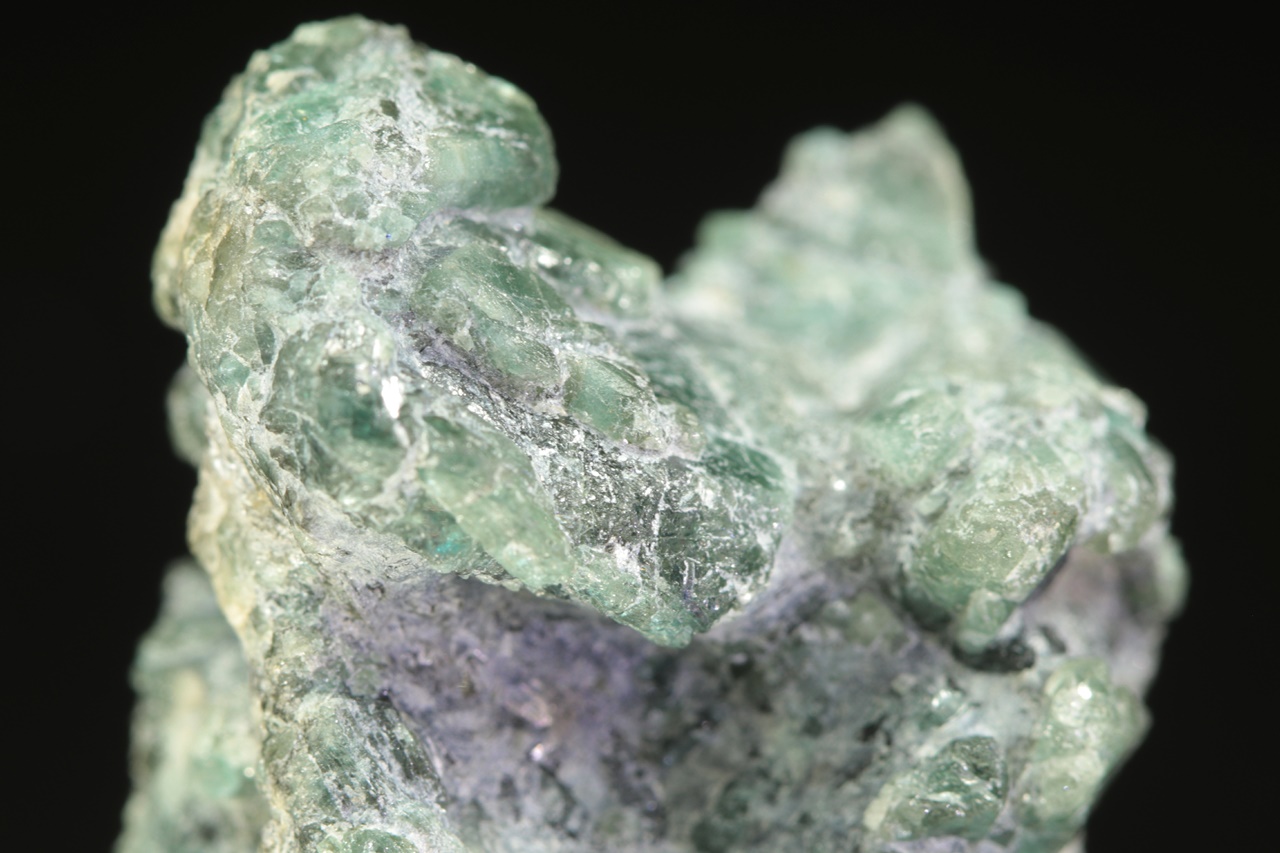 Büschel von grünen Alexandrit-Kristallen, die unter dem Licht einer Glühbirne einen Farbwechsel zeigen und in die rote Farbe übergehen.