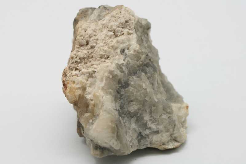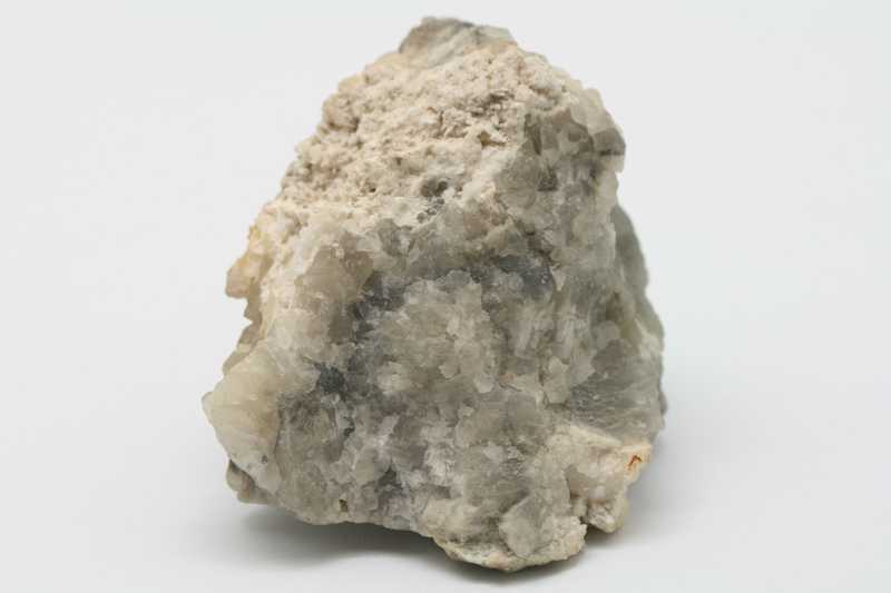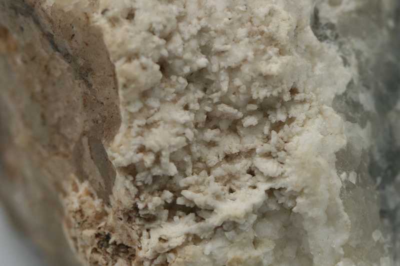 Weiße feine Kriställchen von Alstonit auf grauem Witherit. Bariumcarbonate von der Typlokalität.