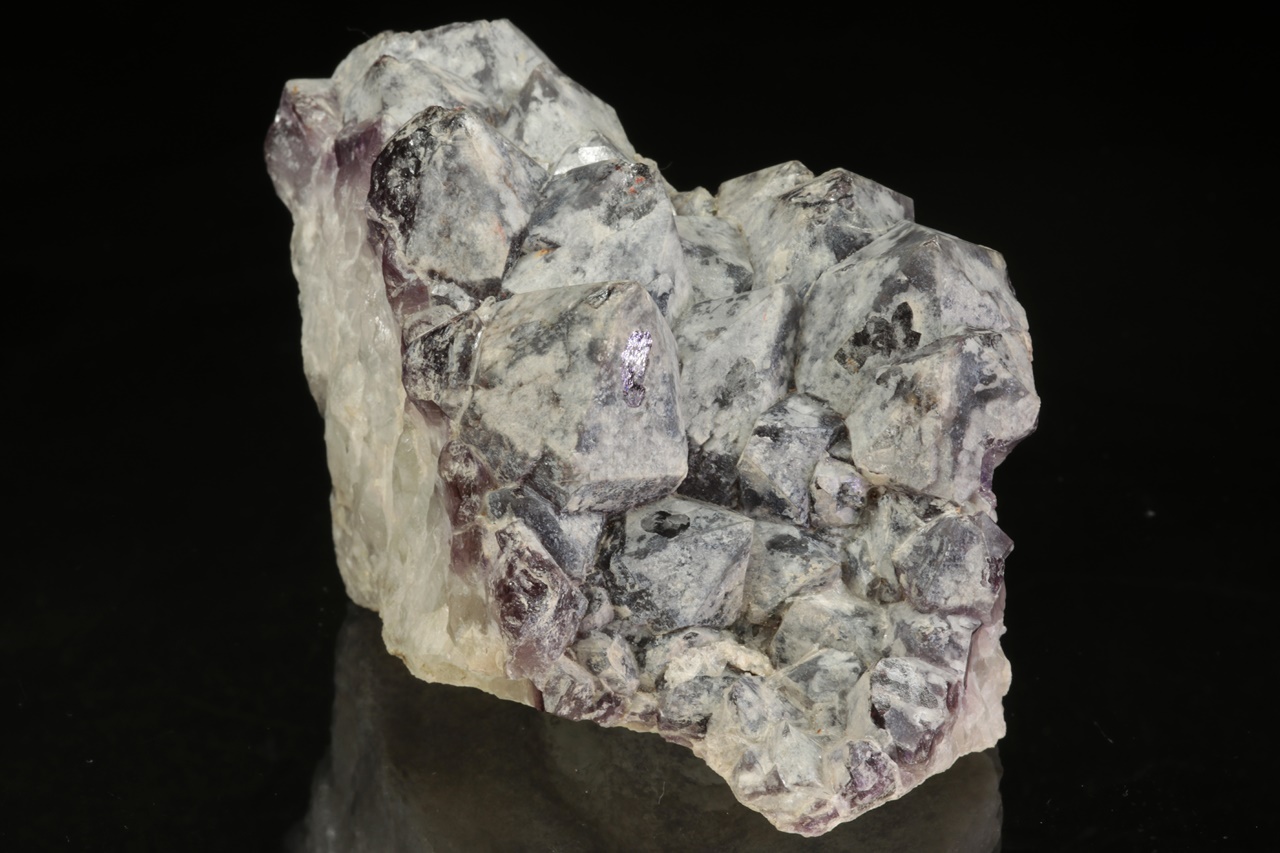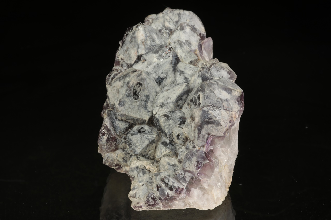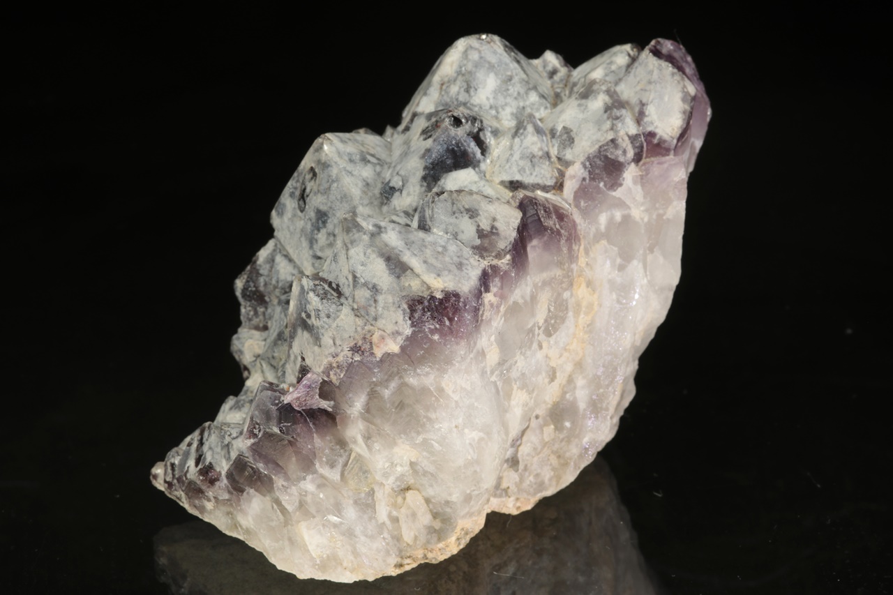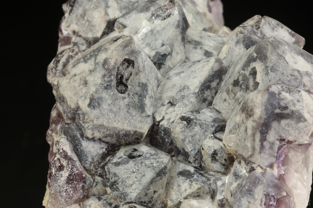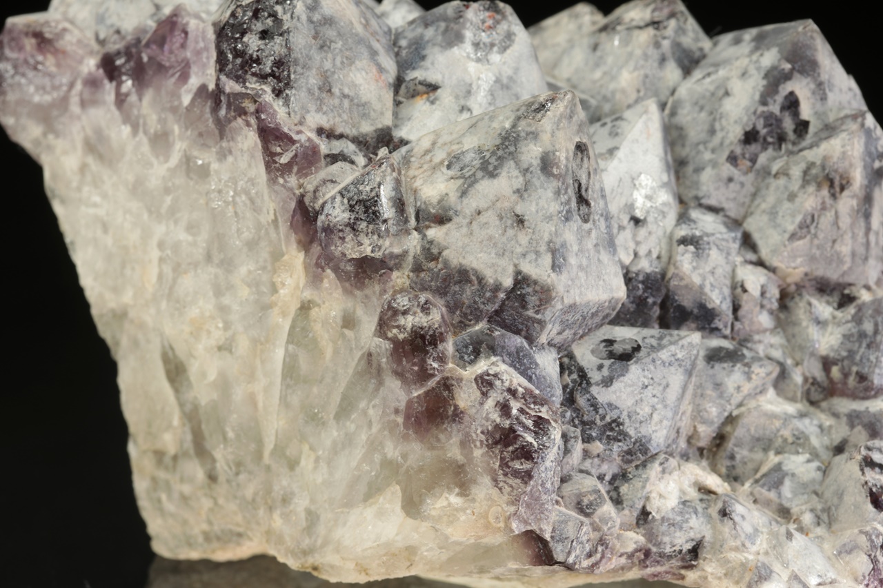 Quarzdruse, die mit intensiv violett bis schwarzem Amethyst endet, welcher eine jüngere Überzug aus weißem Quarz überwächst.
